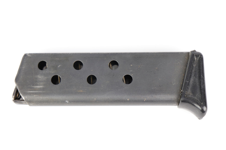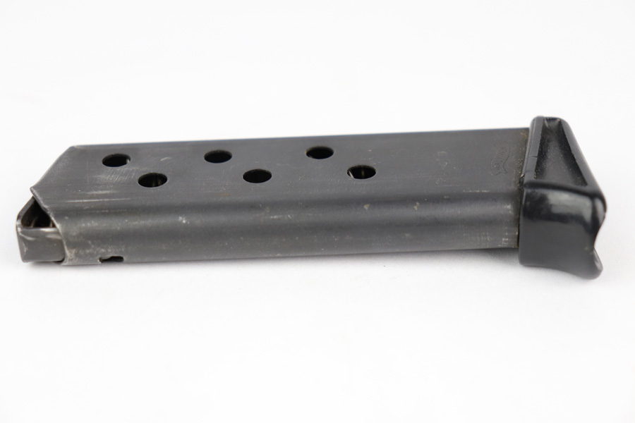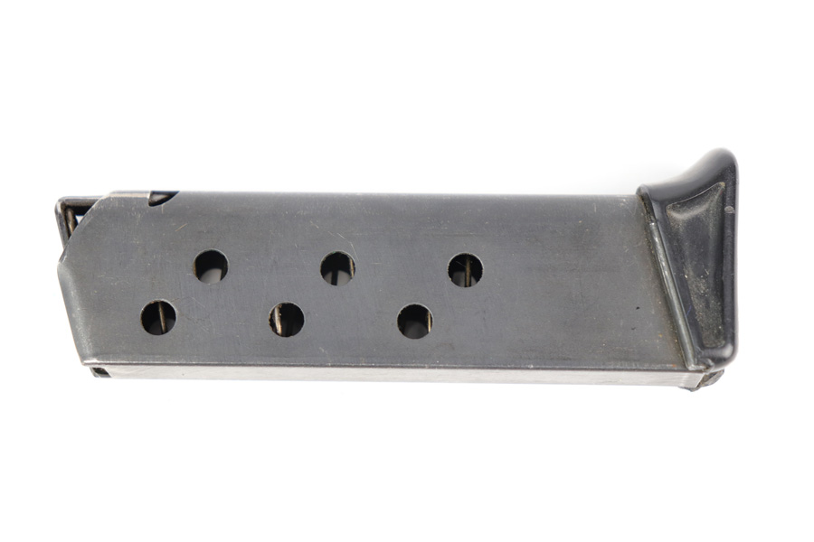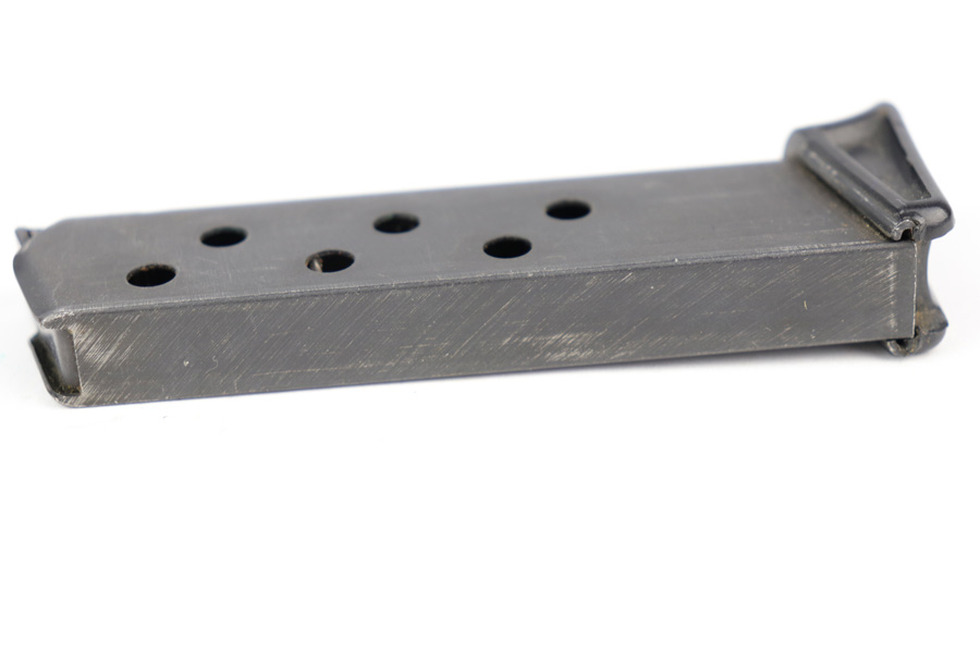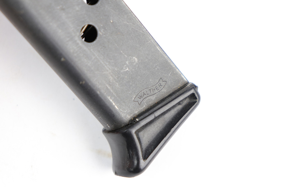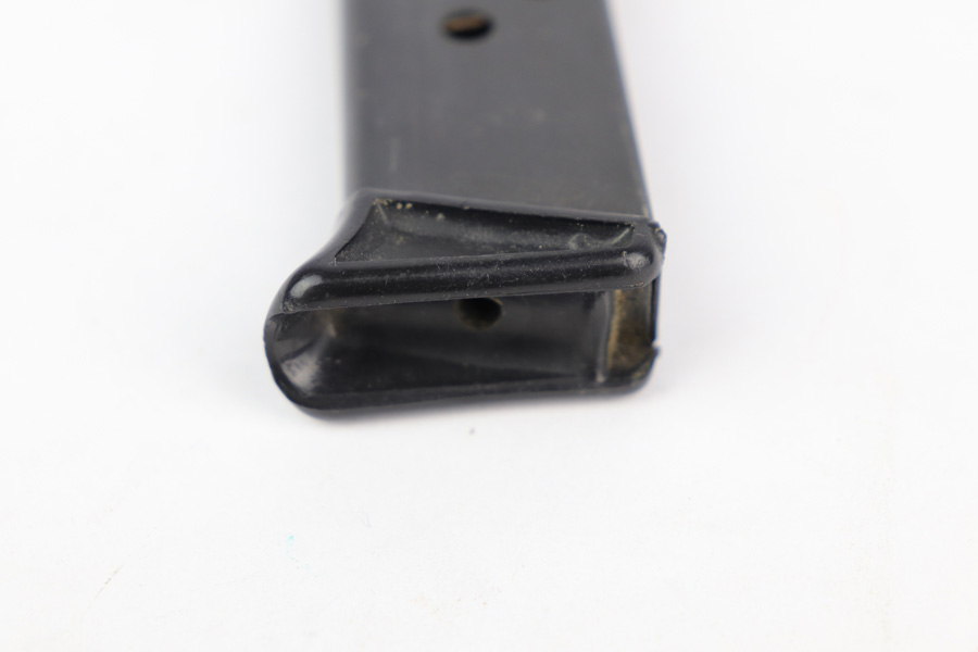 1/17/19 – This is an original WW2 transitional finger extension PPK magazine. The magazine is transitional due to the early style banner-only stamp on the frame, as well as the thin-lipped black bakelite base. The finish is later wartime though – dull bluing instead of high polish. Excellent condition, fully functional, and guaranteed original.