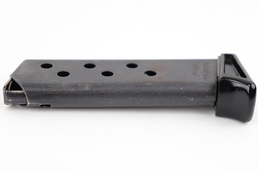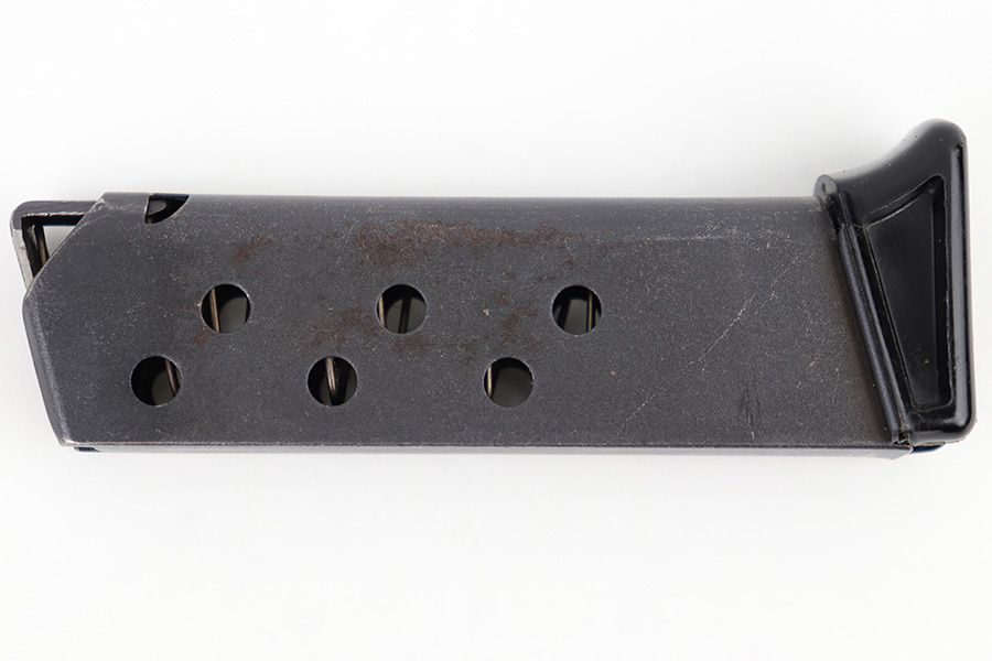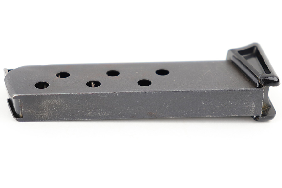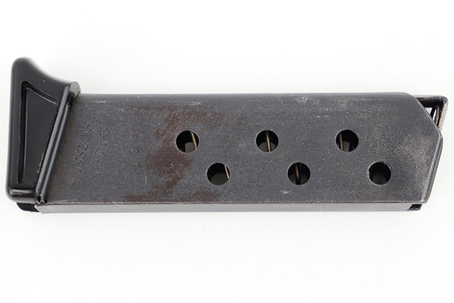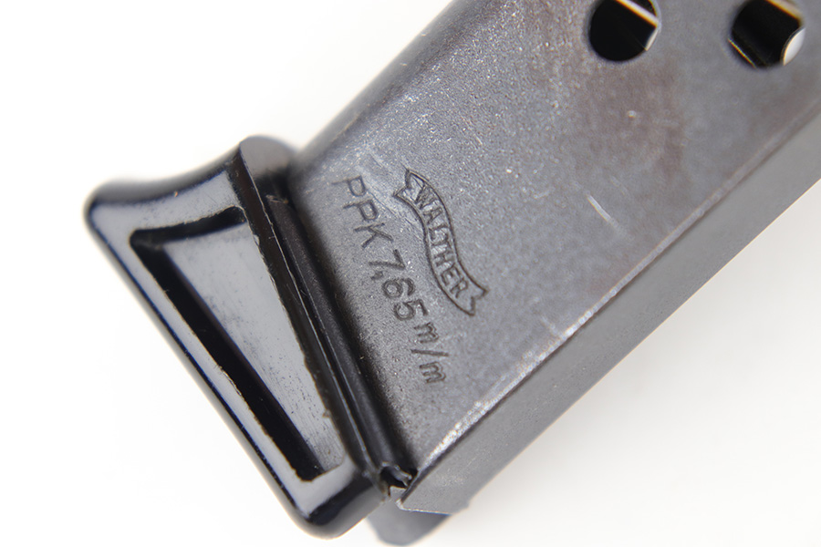 5/23/23 – This is an original WW2 wartime production Walther PPK magazine. The magazine has a black bakelite finger extension base. The base is thick-lipped and has no cracks or chips. The blued tube has some mild surface patina but is in excellent overall condition. Strong, fully functional spring.