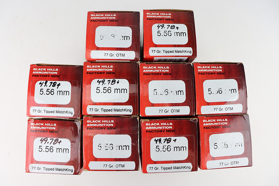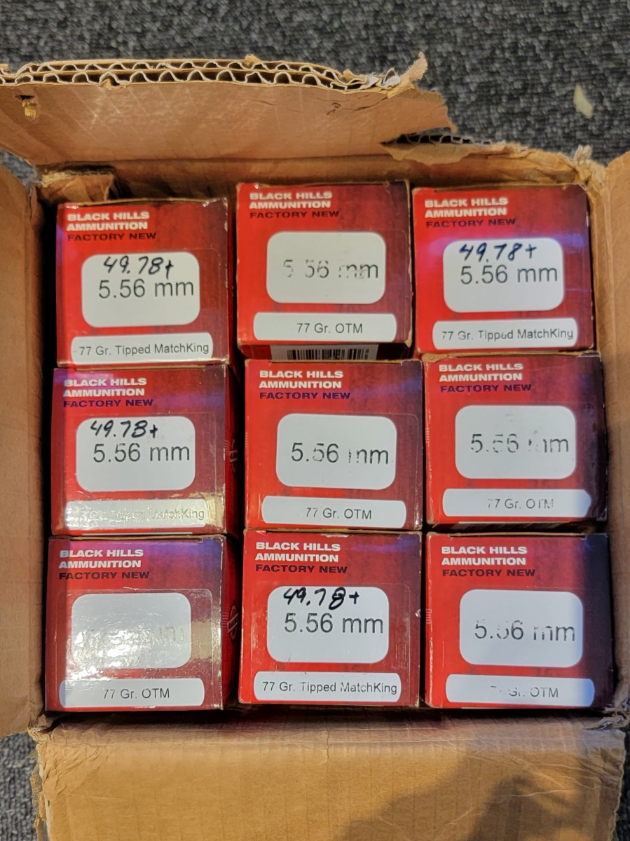 11/13/23 – This is 450 rounds of desirable, high-end Black Hills 5.56mm ammunition. There are 9 boxes of 50 rounds each, with a mixture of both 77 grain OTM as well as 77 grain Tipped MatchKing. NOTE: There’s 10 boxes shown in photos, but this offering is only for 9 boxes, 450 rounds total. Actual boxes shown in last photo. All rounds are in excellent condition.