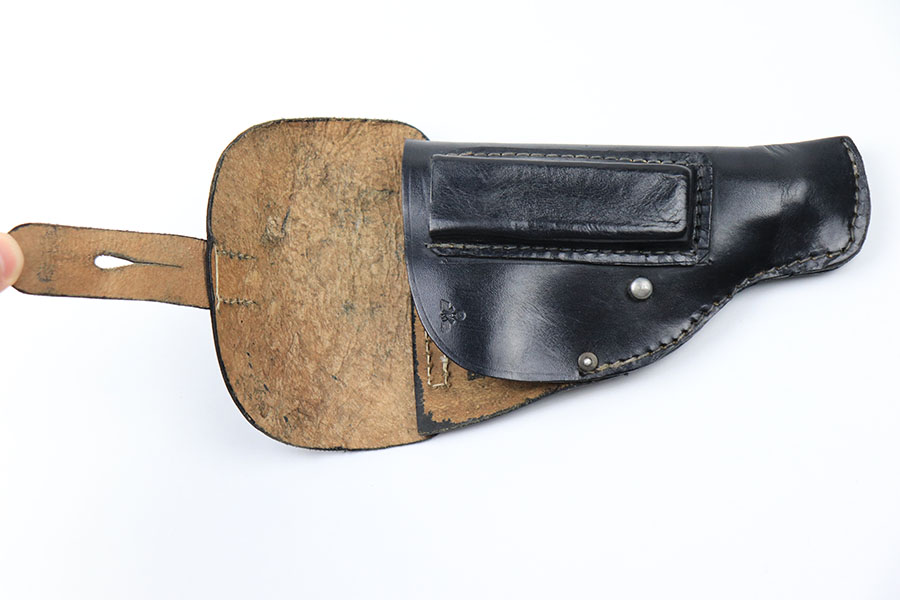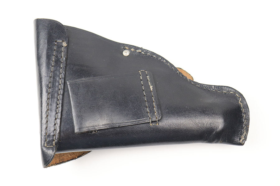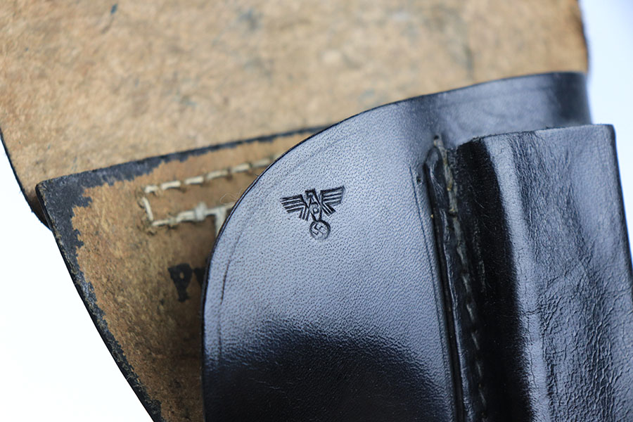 10/18/21 – This is a black leather holster for a police Walther PPK pistol made during WW2. The holster has clean black leather and excellent stitching throughout. The interior leather is Primosa Stuttgart ink stamped. There’s a police eagle under the closure strap. Some mild signs of previous use but overall in great condition.