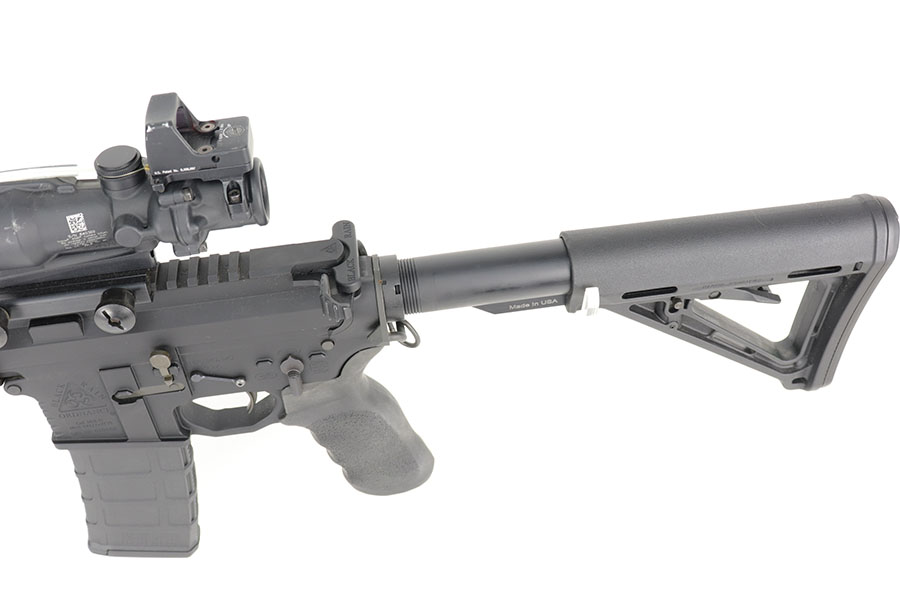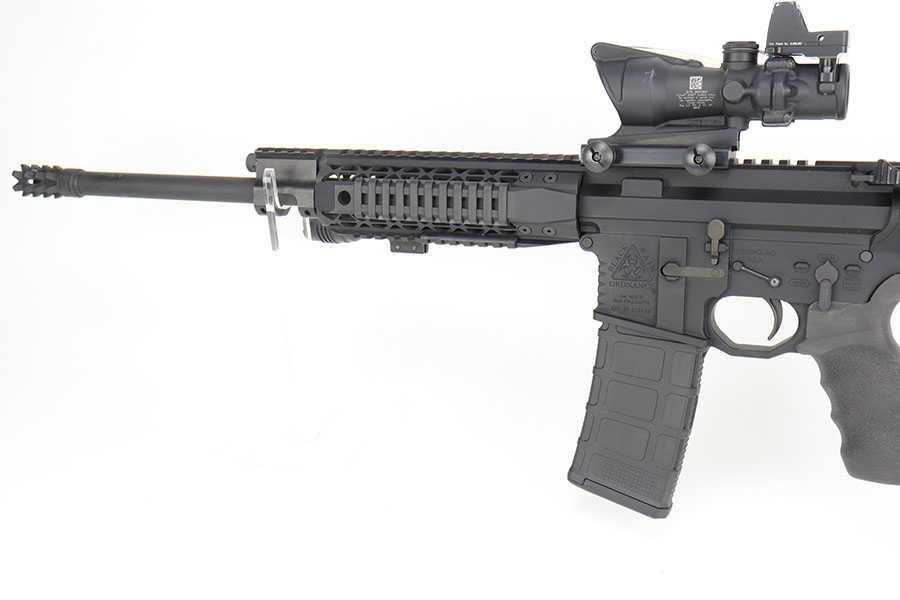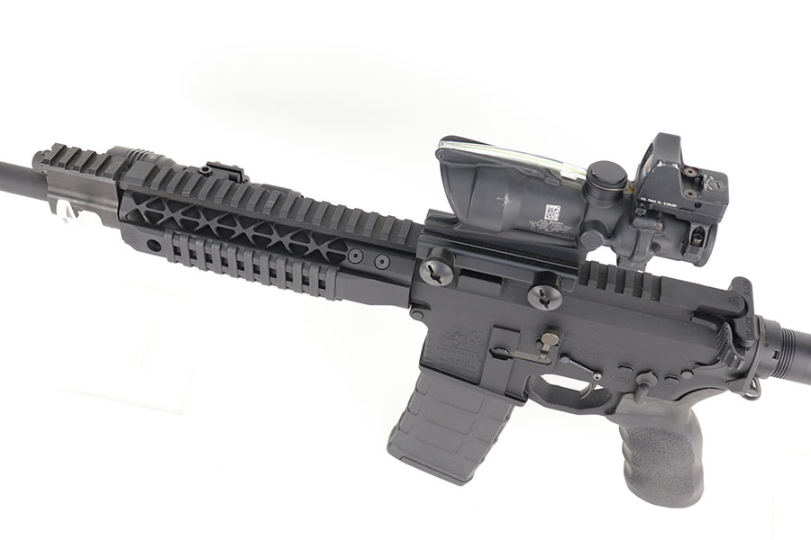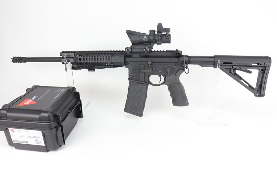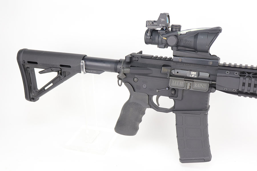 10/28/20 – This is a nearly unfired Black Rain Ordnance Fallout15 with Trijicon ACOG scope with red dot peeper, and side mounted flashlight. There are a couple of very minor scuffs here or there but the gun is nearly unused. Spiked muzzle brake with 16 inch barrel. Collapsible buttstock. Mint bore. Magpul 30 round magazine. Streamlight ProTac flashinglight on a Daniel Defense mount. The scope comes with the original, matching numbered Trijicon case. Crystal clear optics. The optic sells for $1200-1500 alone, and the rifle build almost $2000.