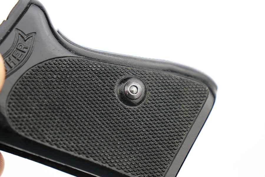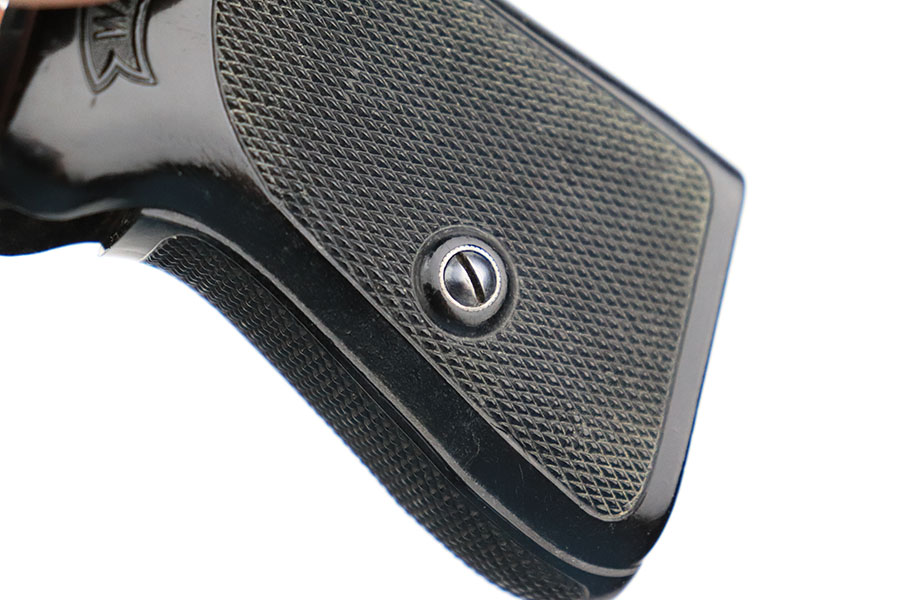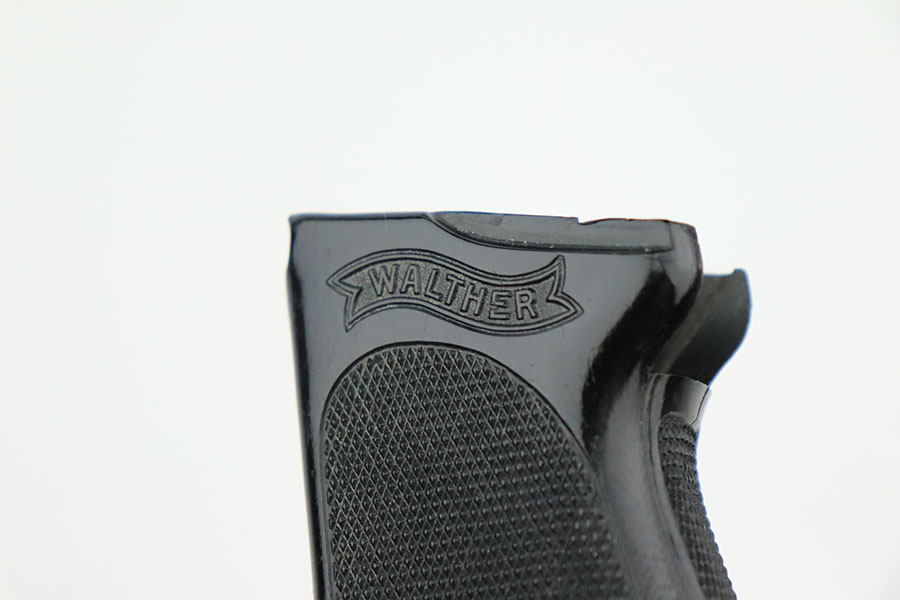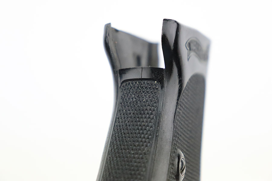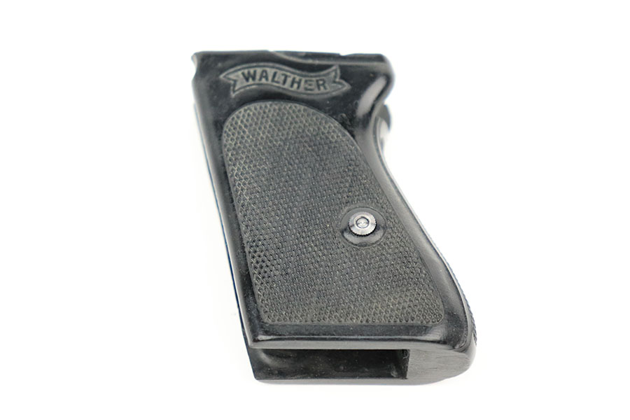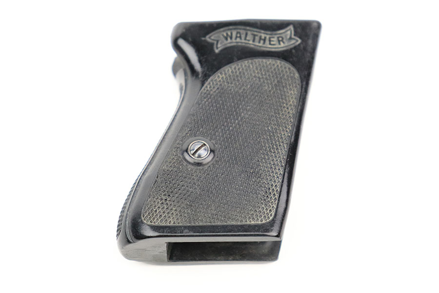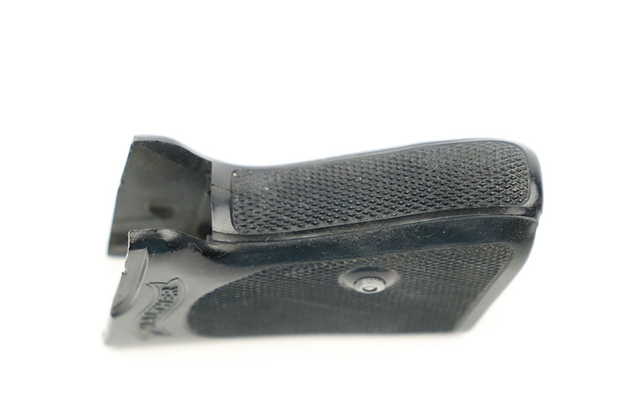 10/10/22 – This is an original WW2 Black bakelite Walther PPK grip. One piece construction in very good overall condition despite having a mild crack in the spine. This is a hairline crack as shown in photos. There are other mild imperfections on the grip, and some minor warping or “flaring” at the top of the grip. This doesn’t affect fit or function significantly. Includes an original screw and both escutcheons, as shown.