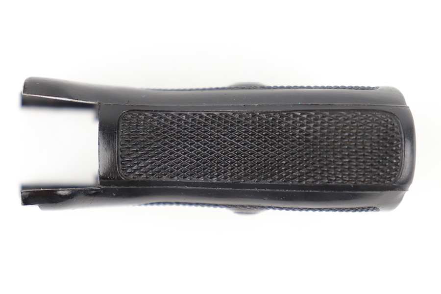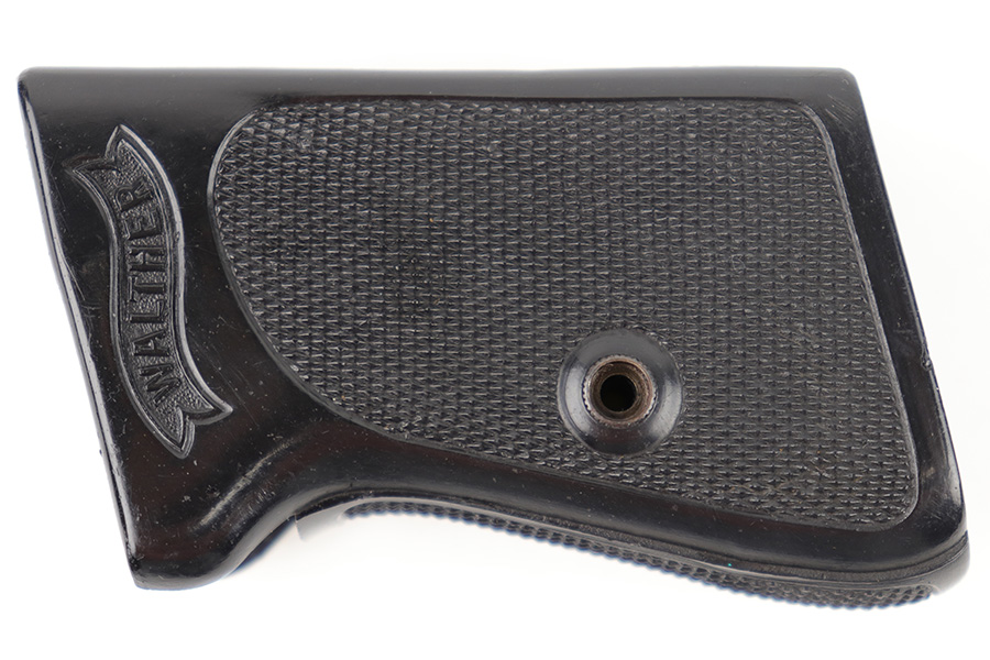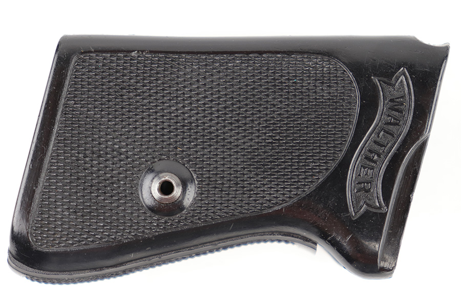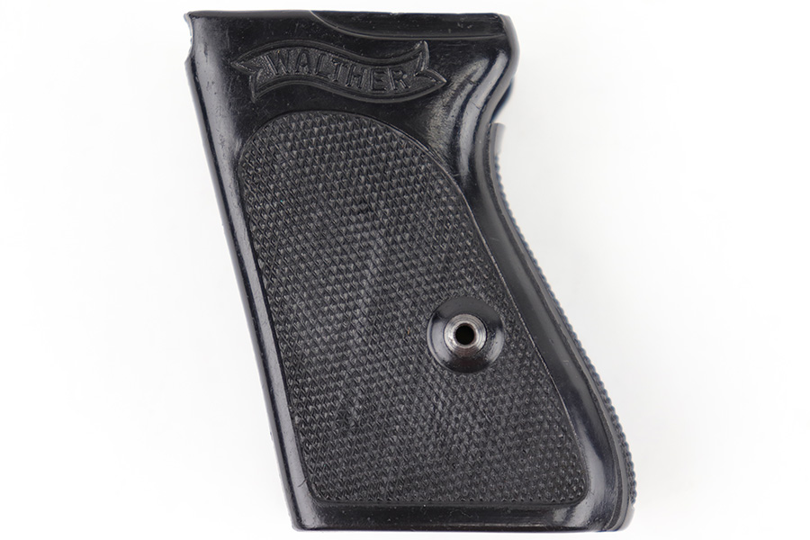 6/21/23 – This is an original WW2 production Walther PPK grip. The grip is later wartime black bakelite material and is in excellent condition. There’s minimal warping and no cracks or chips. Strong exterior diamond pattern throughout. No screw included. It’s extremely difficult to find black PPK grips in this condition.