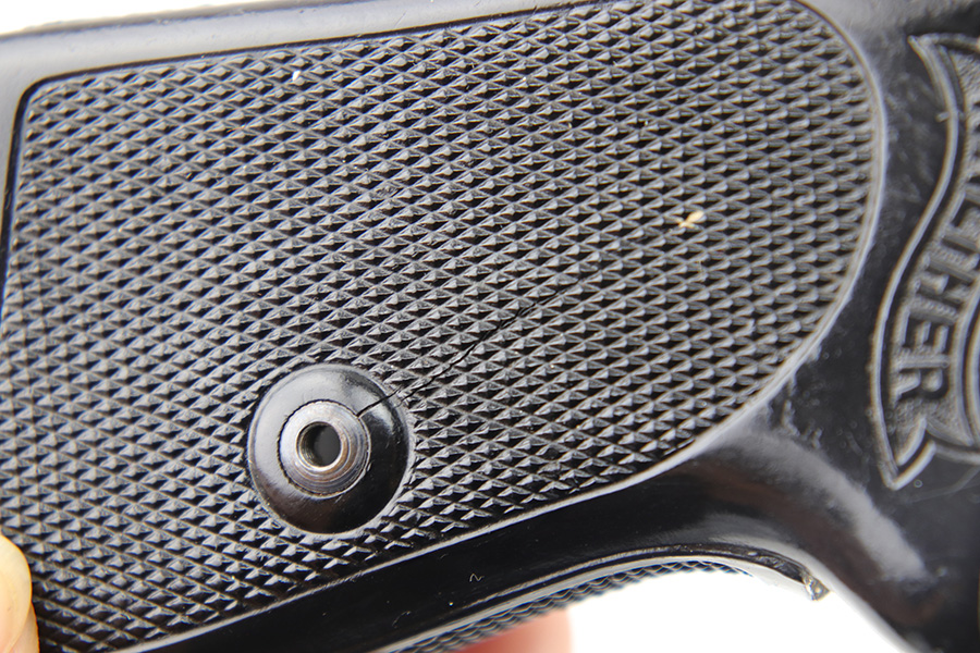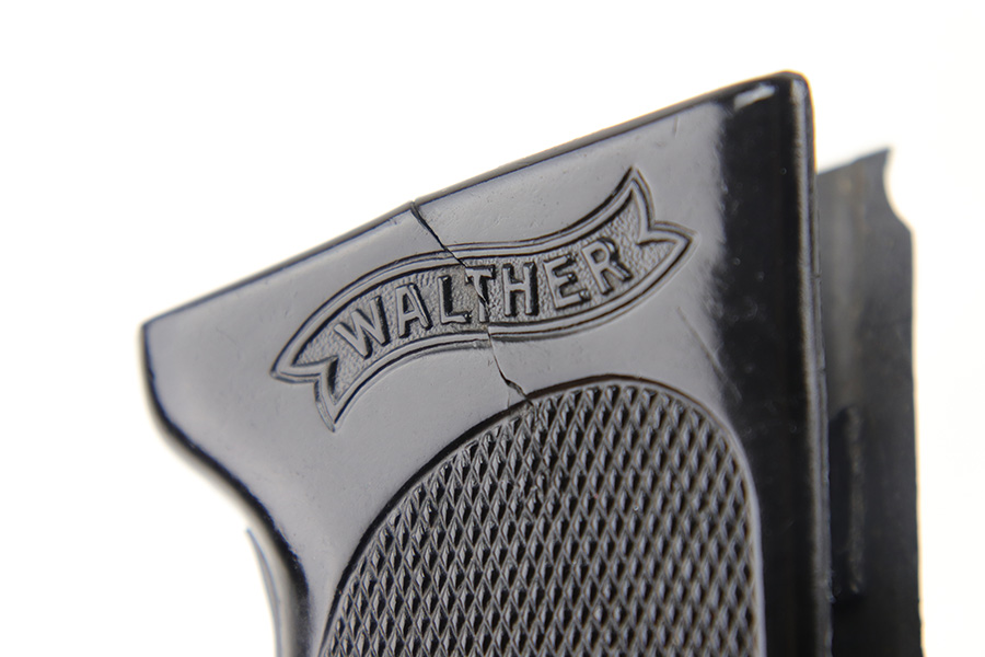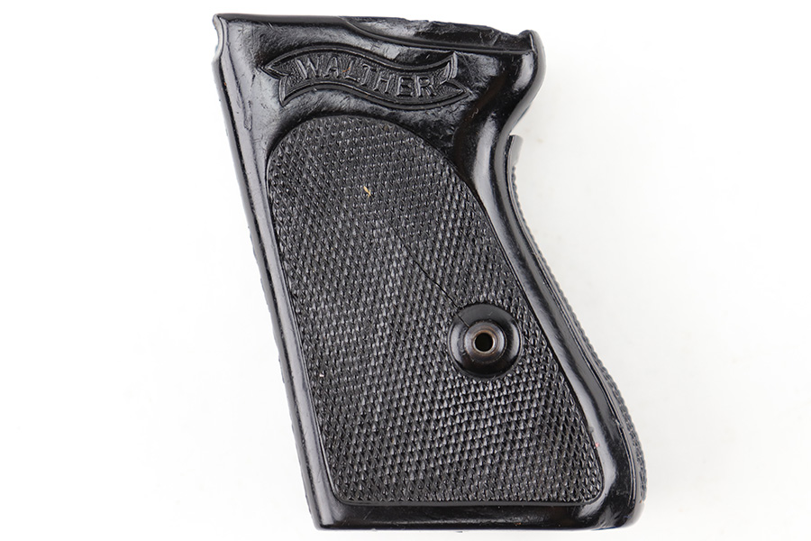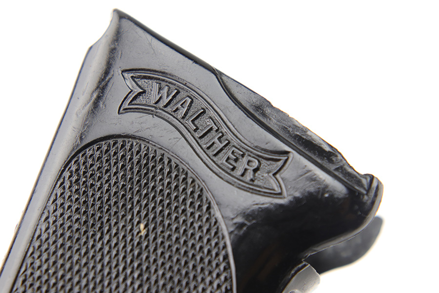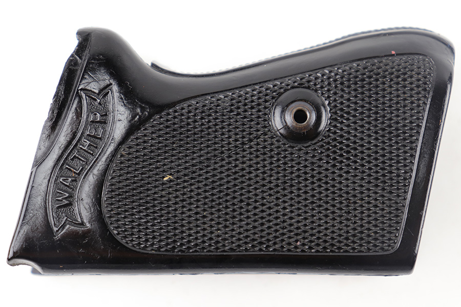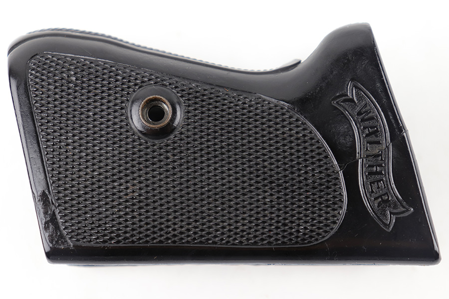 7/11/23 – This is an original late WW2 production Black Bakelite Walther PPK grip. The grip is in fair overall condition with some cracks throughout. There’s a crack on the left side near the escutcheon, a hairline crack on the spine, a crack through the Walther banner on the right side, and a crack on the base. The grip also has some mild flaring or warping at the sides due to aging. Still fits and functions on a WW2 production PPK. Original escutcheons and metal inlays intact. No screw included.