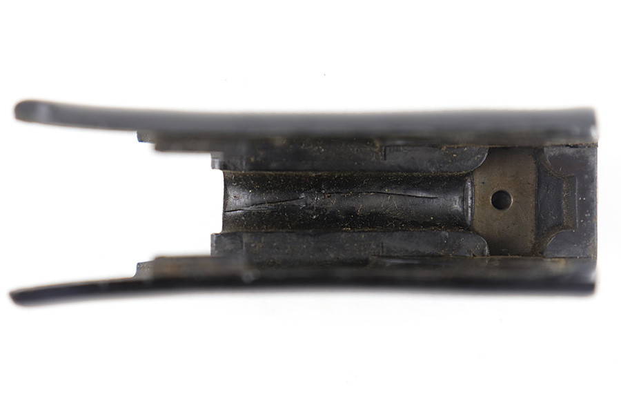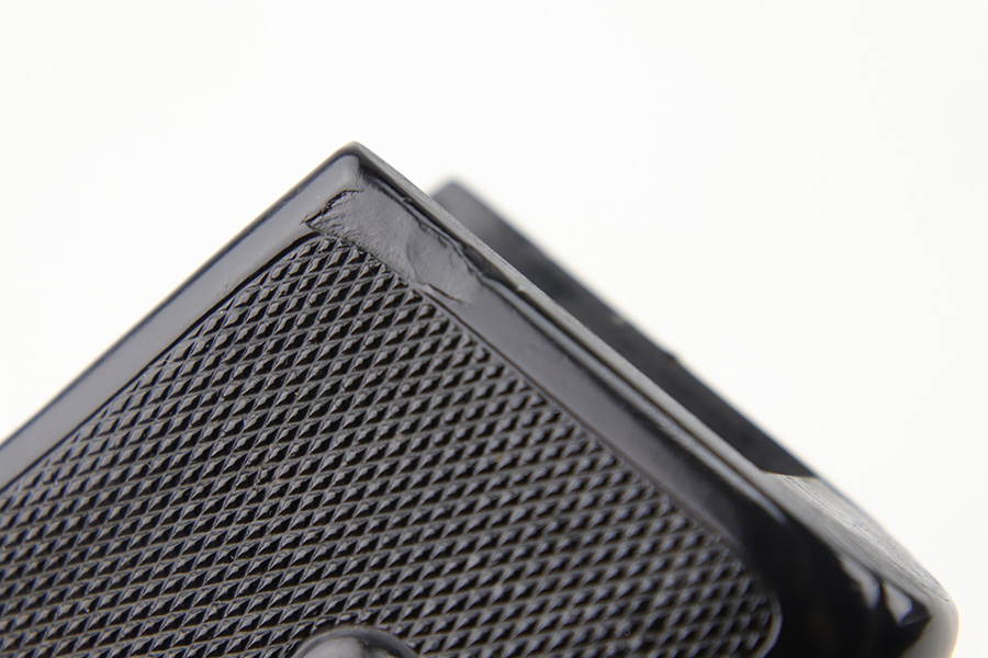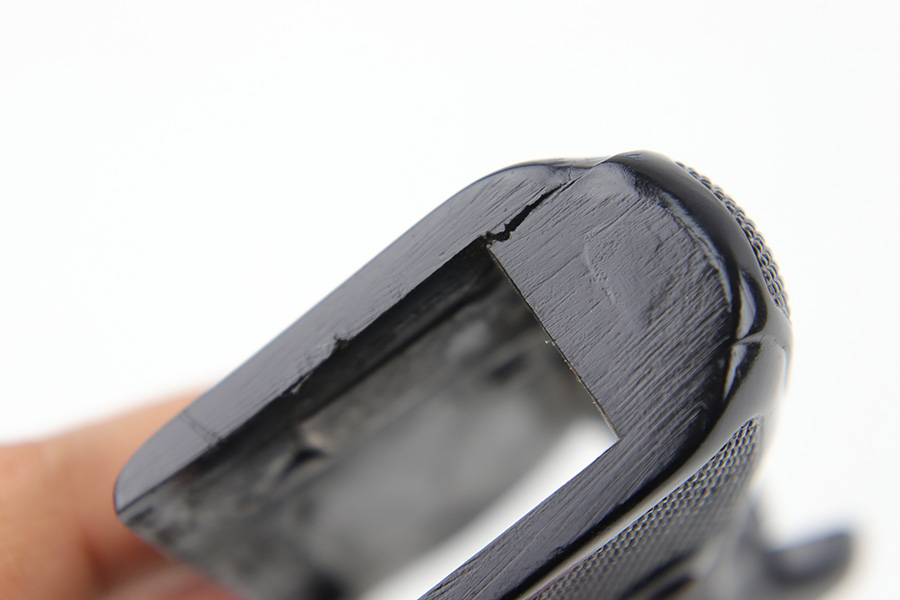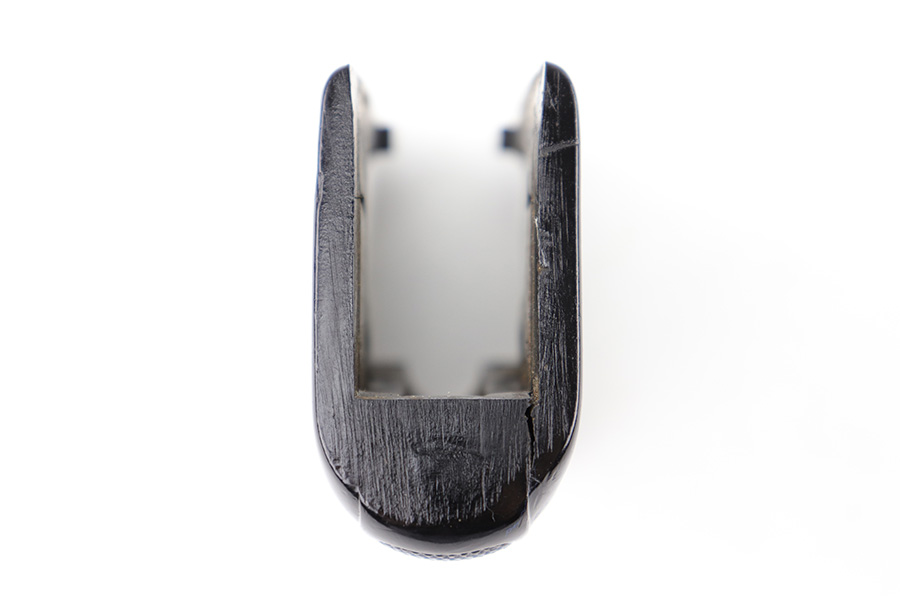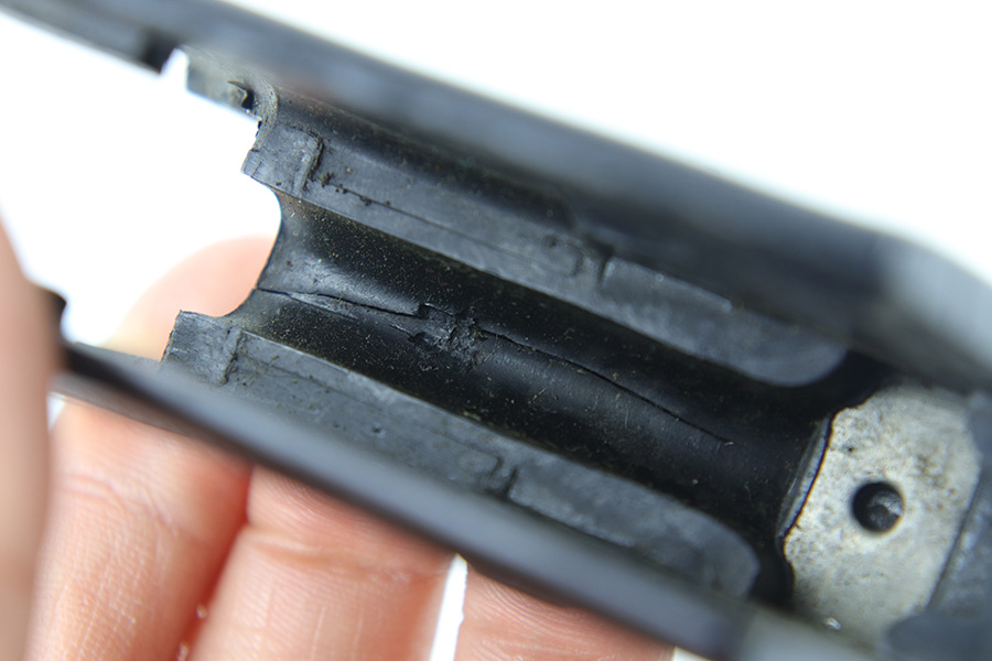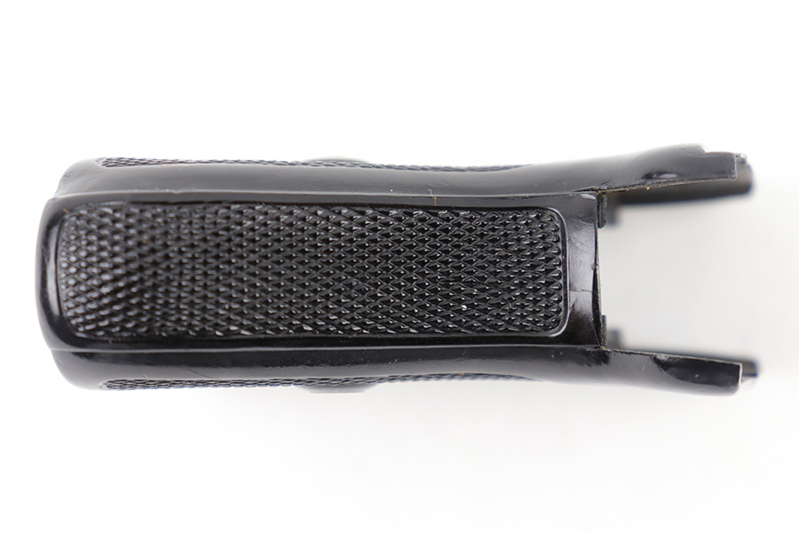 7/11/23 – This is an original late WW2 production Black Bakelite Walther PPK grip. The grip is in fair overall condition with some cracks throughout. There’s a crack on the left side near the escutcheon, a hairline crack on the spine, a crack through the Walther banner on the right side, and a crack on the base. The grip also has some mild flaring or warping at the sides due to aging. Still fits and functions on a WW2 production PPK. Original escutcheons and metal inlays intact. No screw included.