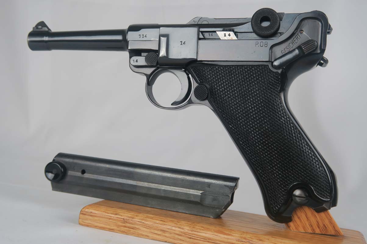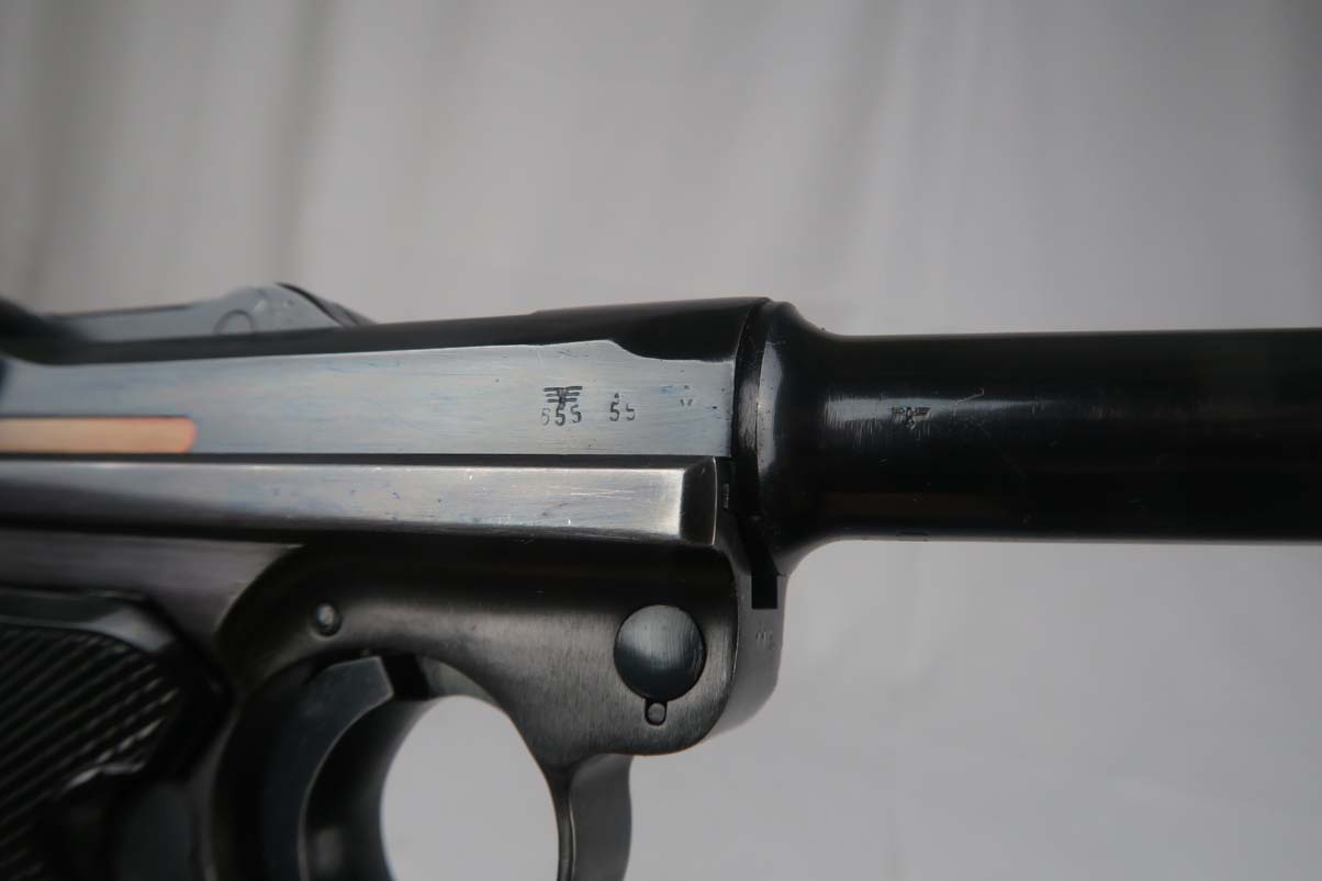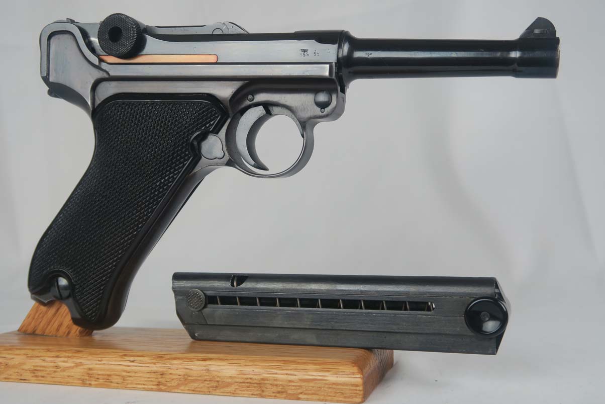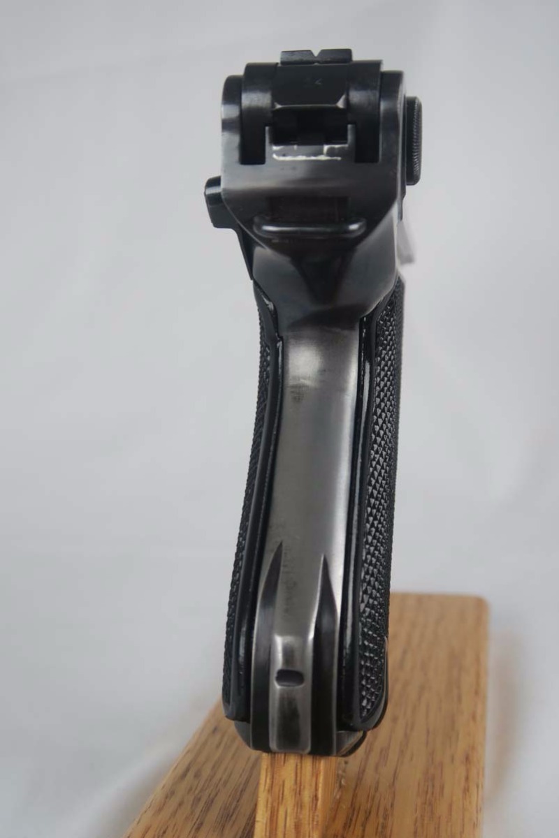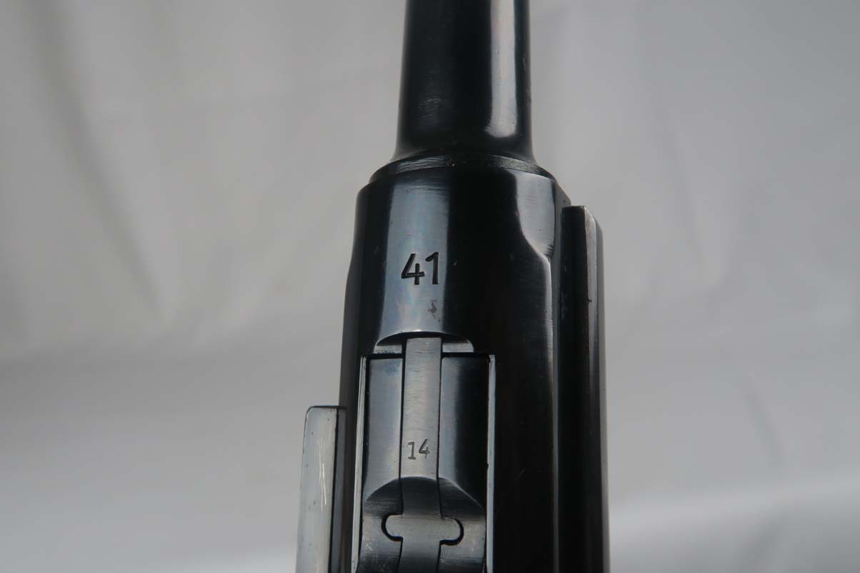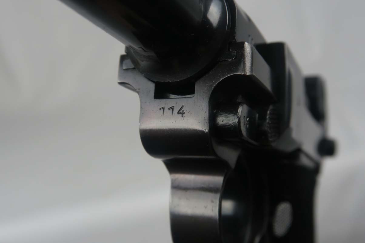 3/2/17 – I picked this one up at a gun show where the lighting was bad – thought it was all original but when I got home I saw that it was an older reblued gun.  Finish looks great but there are signs that the gun has been polished a bit.   I added repro Black Widow grips to help shave my losses a bit. Grips look good on the gun but the fit is not exact, with minor gaps between the grip and the frame mostly visable on the front strap.  The rest of the gun is all correct and matching.  All small parts are matching to the gun all the way down to the firing pin and hold open.  Mechanically sound with a very nice bore.   Shiny but with a minor amount of dulling.   Rifling is pretty good but not excellent.   Finish on the front strap looks to be about 95% but for some reason the finish on the back strap is almost all gone.  Comes with a correct black widow style magazine.