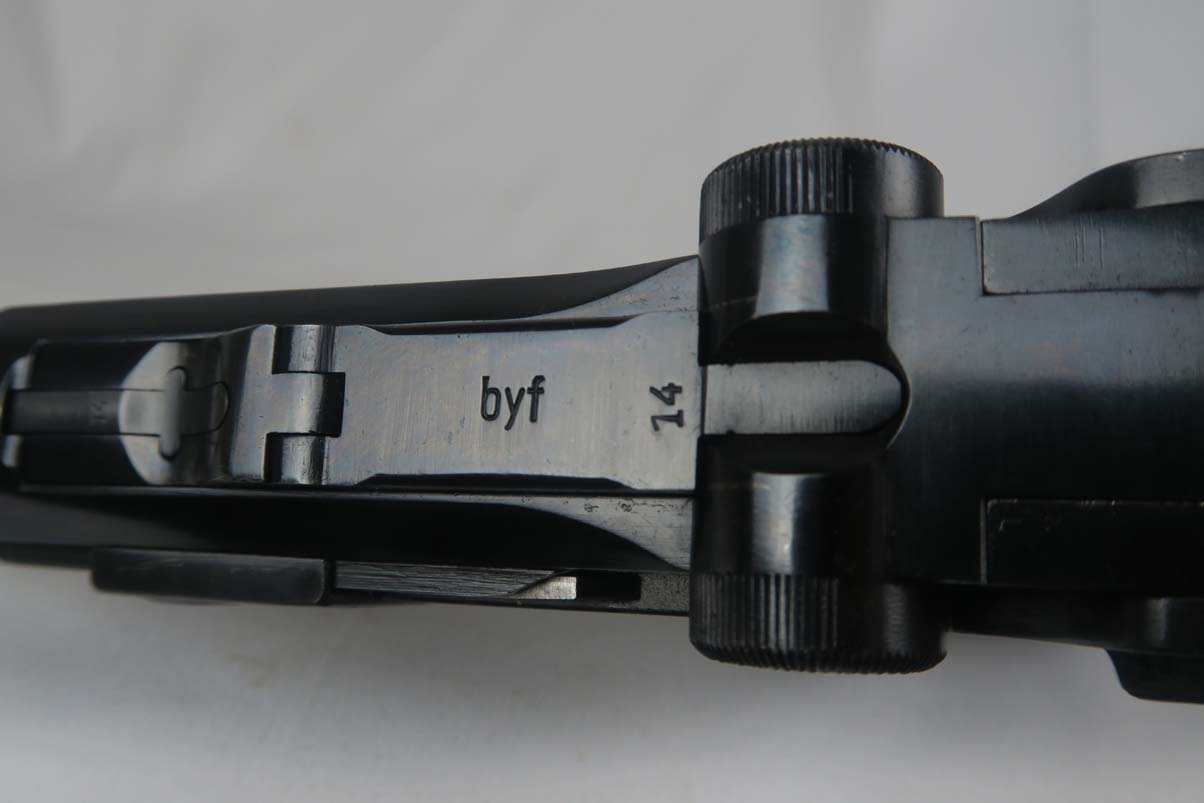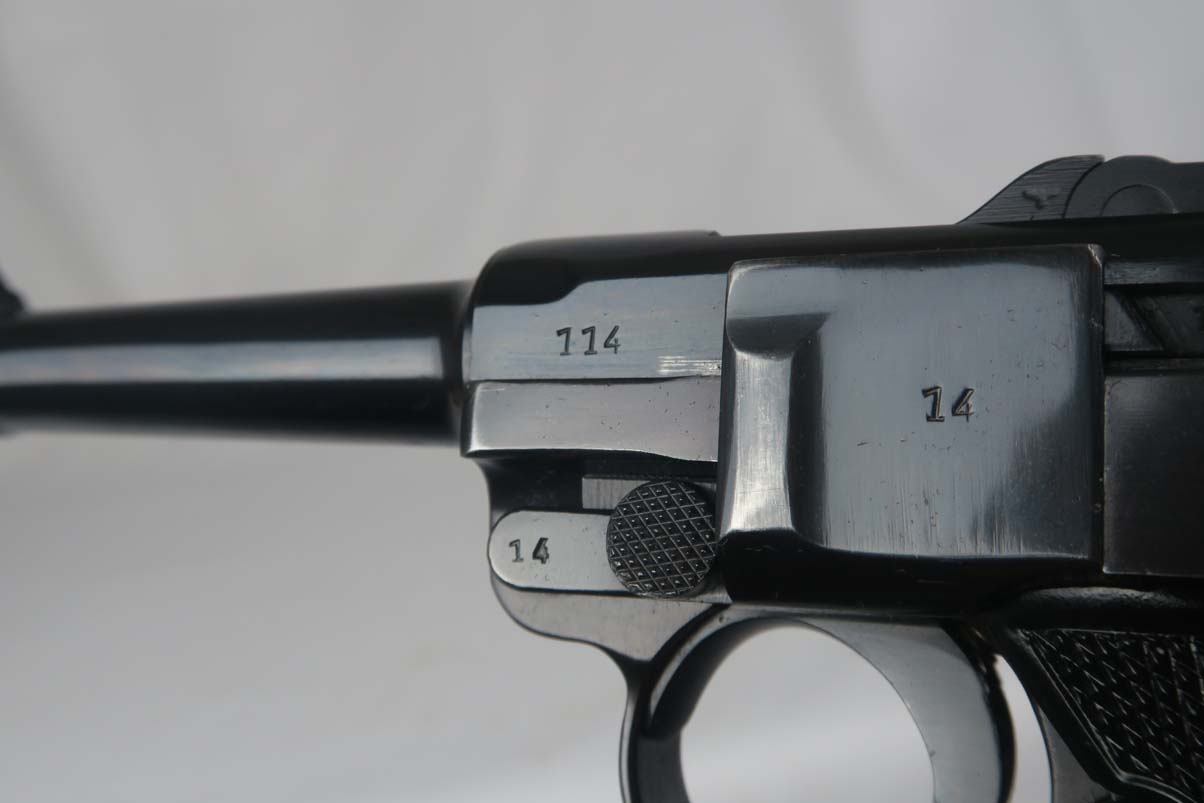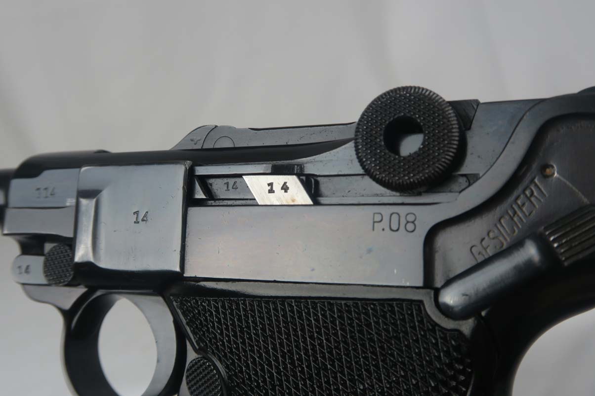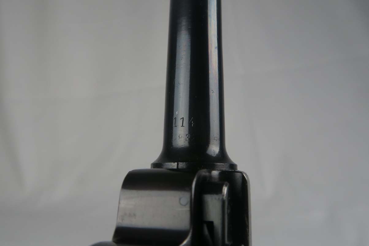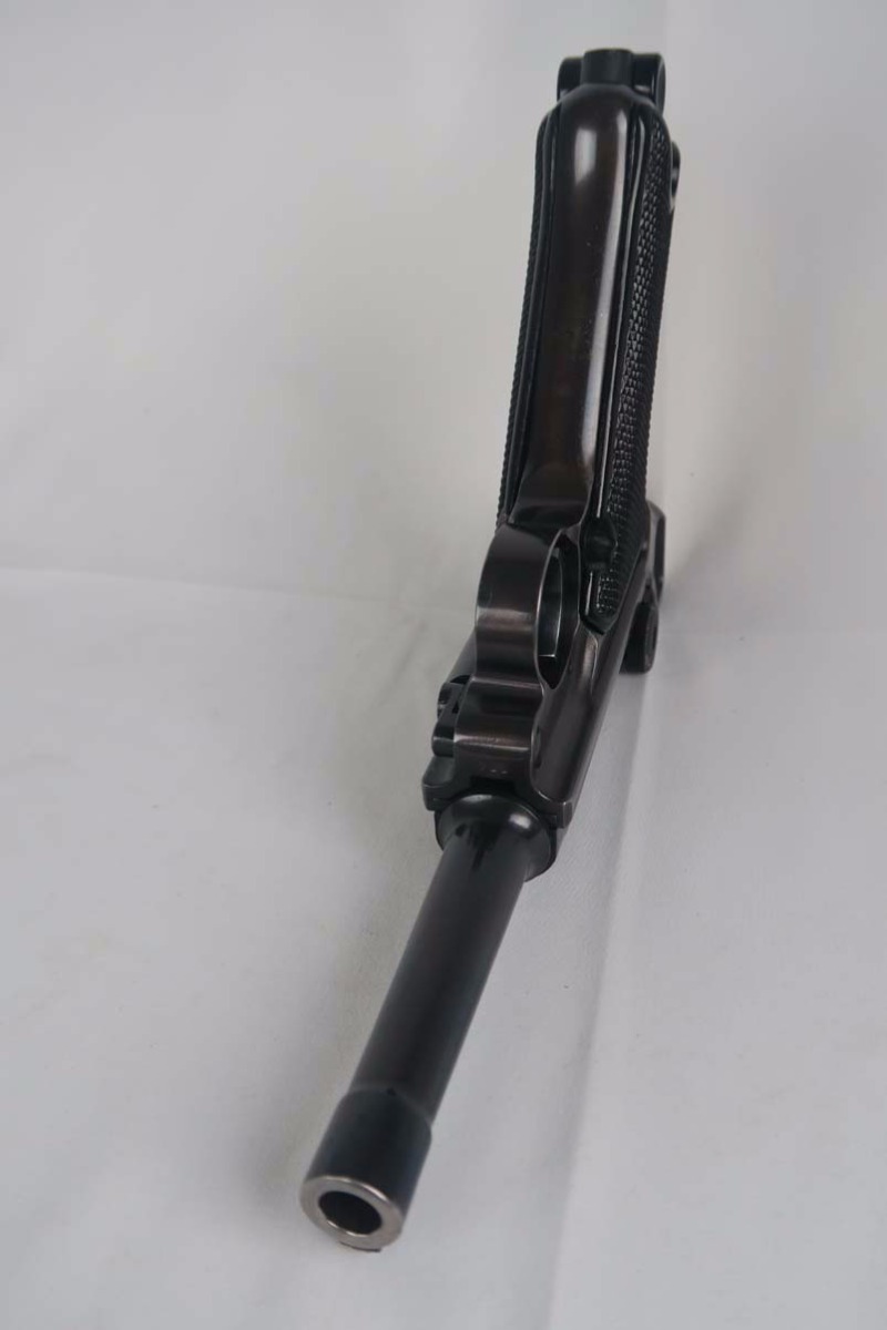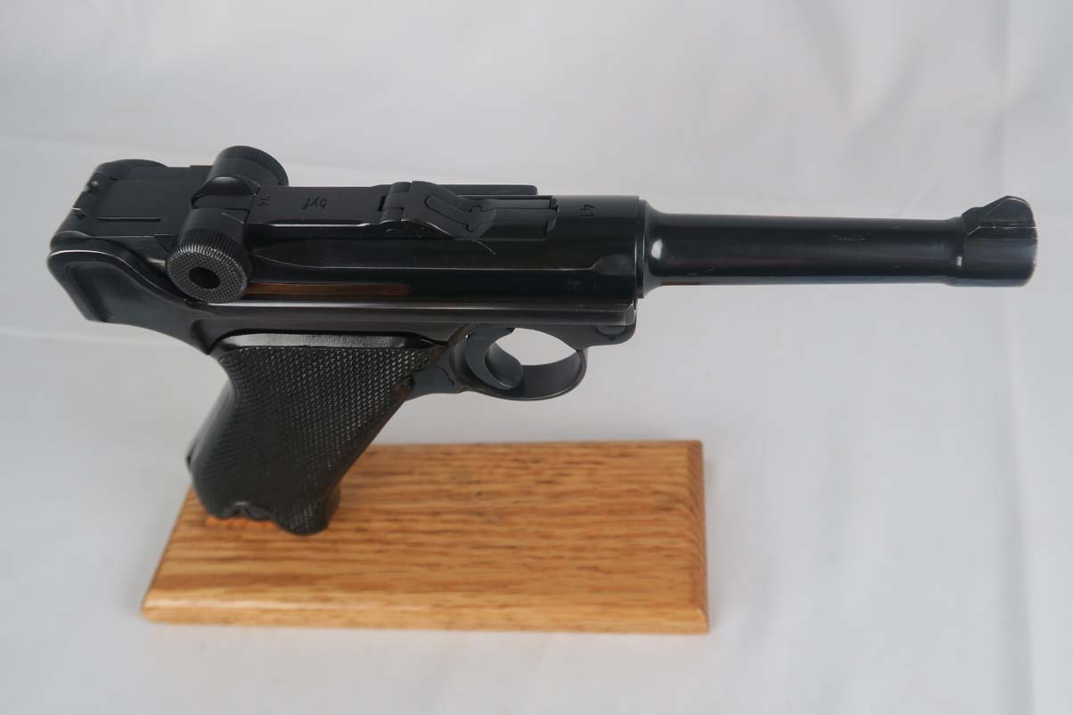 3/2/17 – I picked this one up at a gun show where the lighting was bad – thought it was all original but when I got home I saw that it was an older reblued gun.  Finish looks great but there are signs that the gun has been polished a bit.   I added repro Black Widow grips to help shave my losses a bit. Grips look good on the gun but the fit is not exact, with minor gaps between the grip and the frame mostly visable on the front strap.  The rest of the gun is all correct and matching.  All small parts are matching to the gun all the way down to the firing pin and hold open.  Mechanically sound with a very nice bore.   Shiny but with a minor amount of dulling.   Rifling is pretty good but not excellent.   Finish on the front strap looks to be about 95% but for some reason the finish on the back strap is almost all gone.  Comes with a correct black widow style magazine.