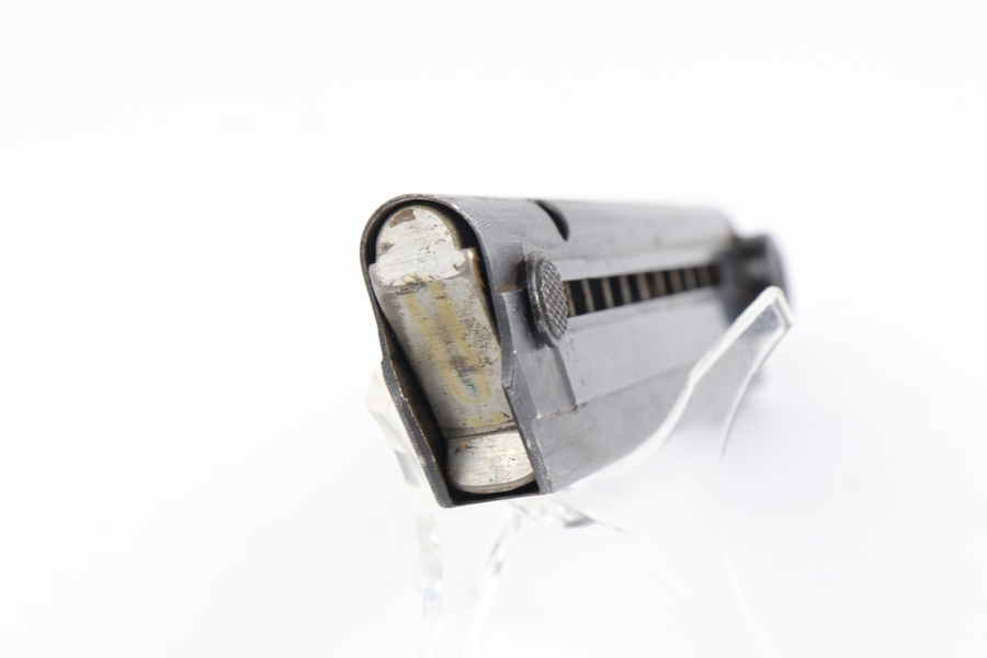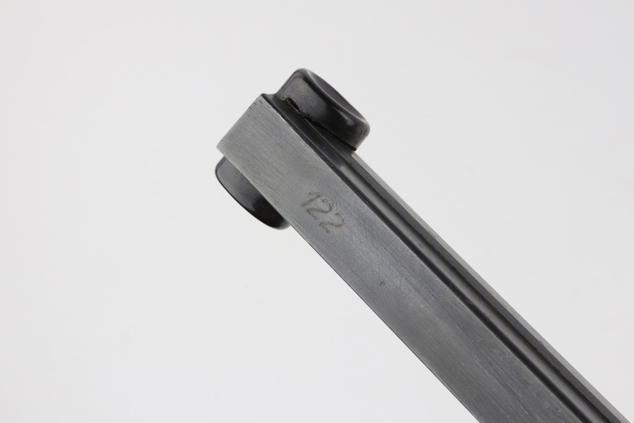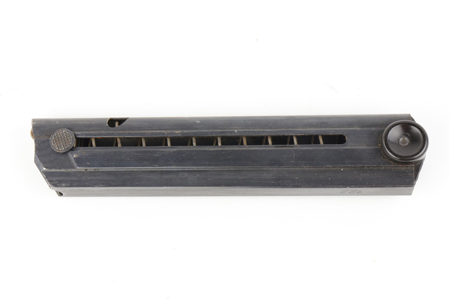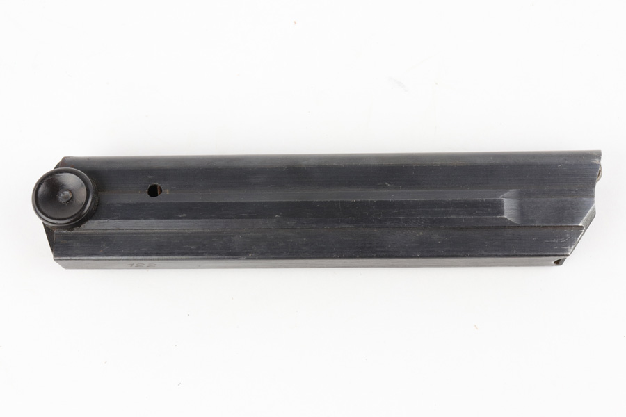 6/19/19 – This is an original black widow Mauser luger magazine from WW2. The magazine has a black bakelite base with no cracks or chips. The frame is “fxo” stamped with two e/37 proofs. The spine has a “122” stamped into the metal – we doubt this is a factory stamp, and have adjusted the price accordingly. Otherwise a beautiful all original and functional magazine.