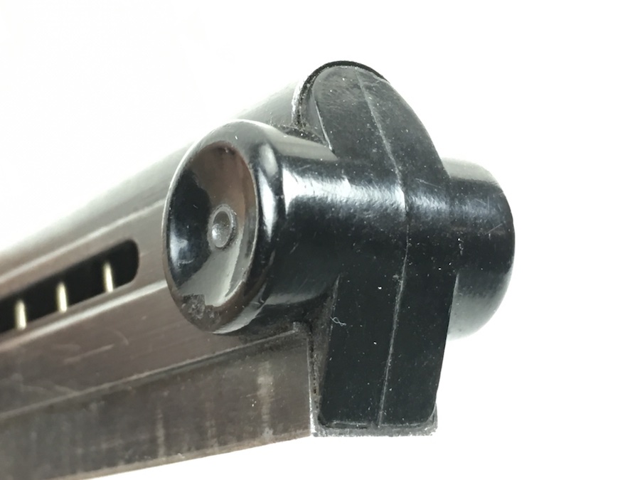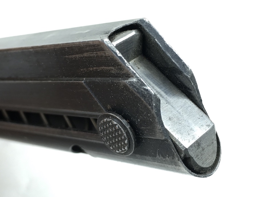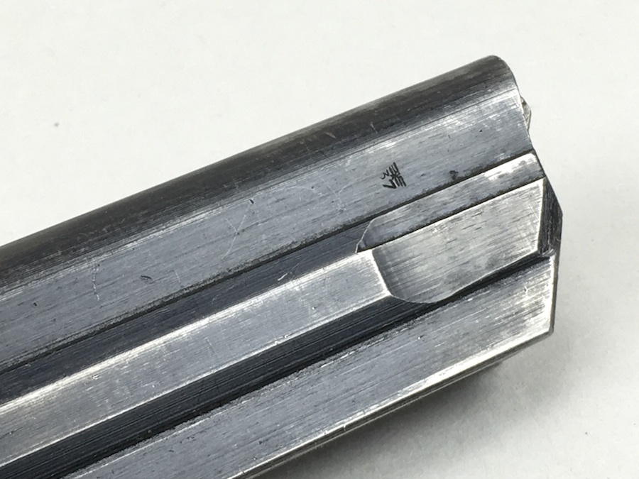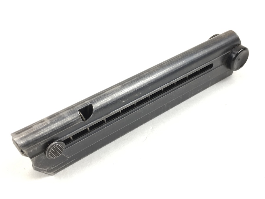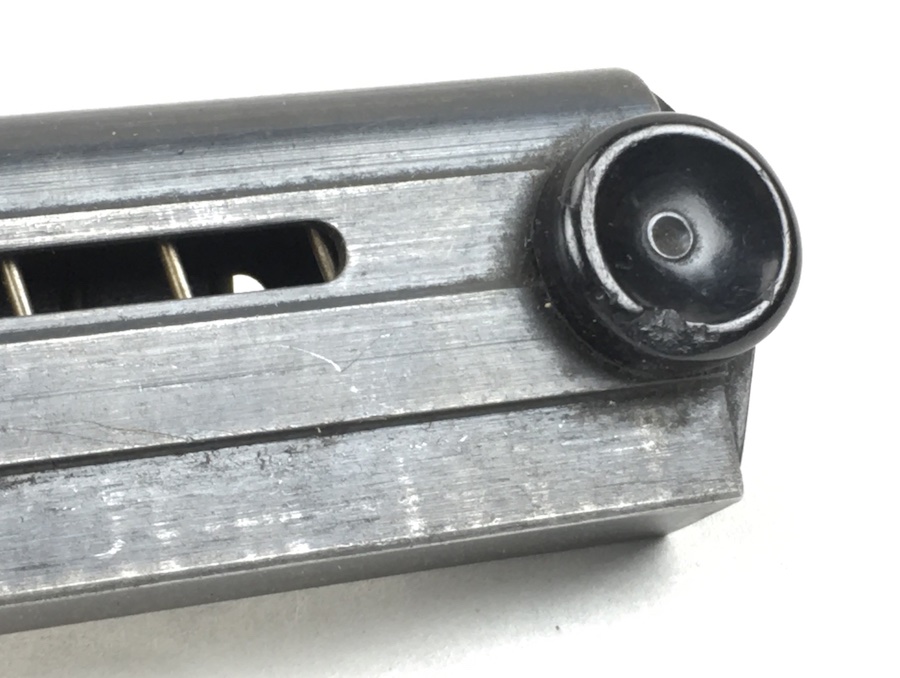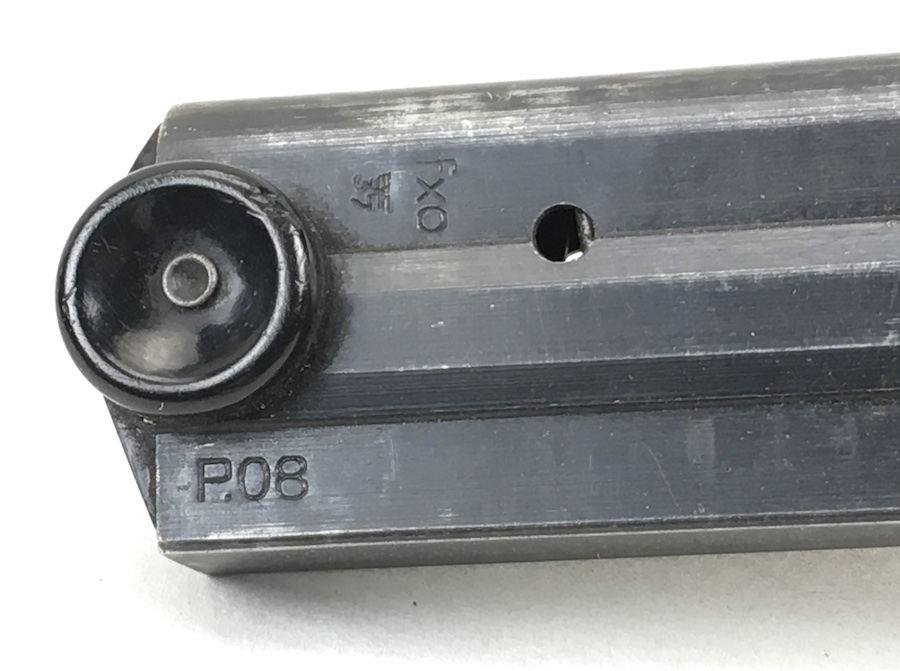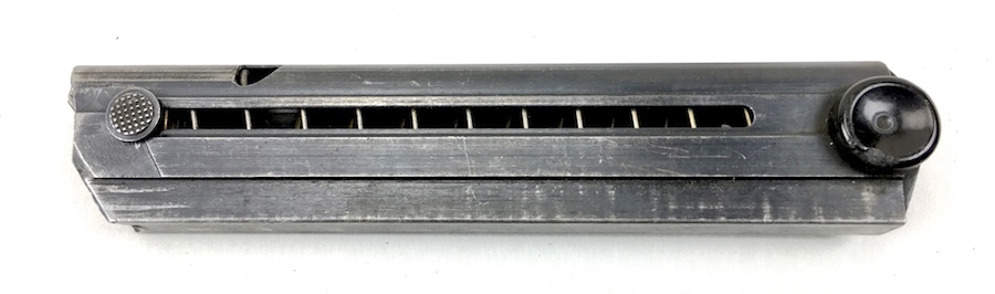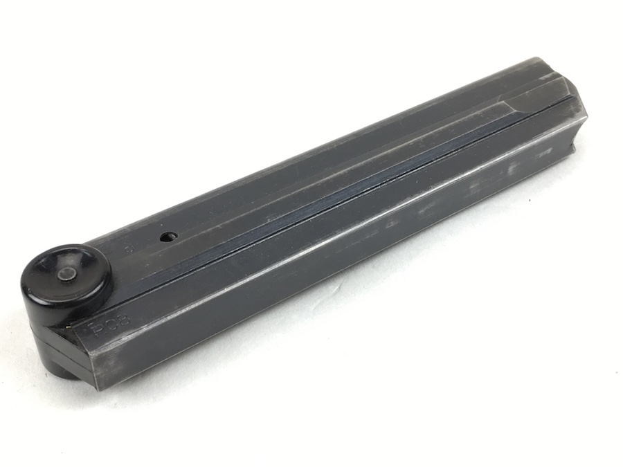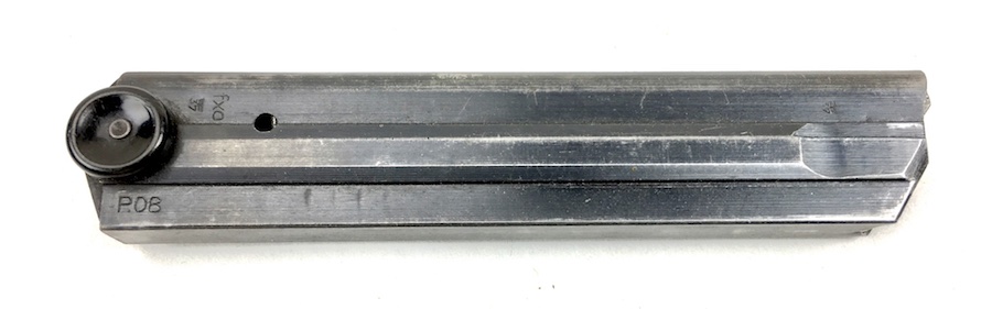 7/2/19 – This is an original Black Widow Mauser Luger magazine. Properly eagle/37 proof stamped with “fxo” and “P.08” stamped on the frame. The magazine is strong and fully functional. Small chip on the right side of the bakelite base. Minor bluing wear on the body. Guaranteed original and authentic.