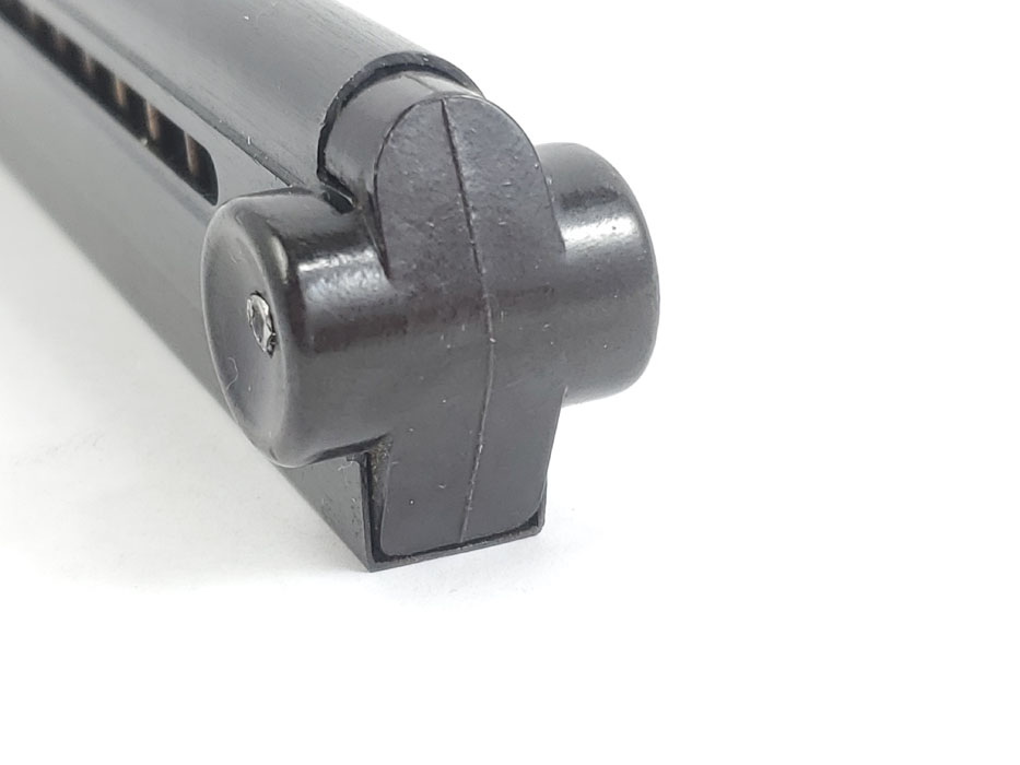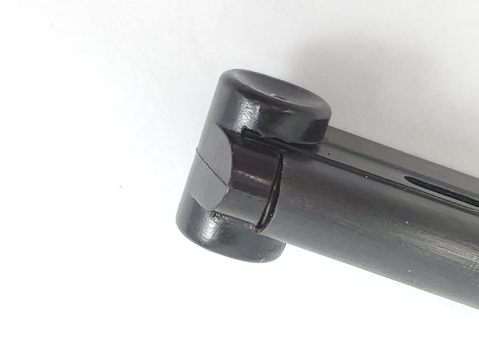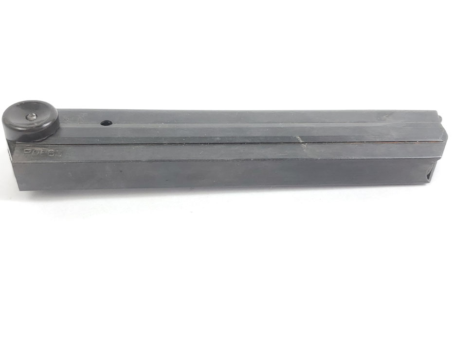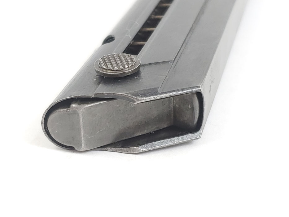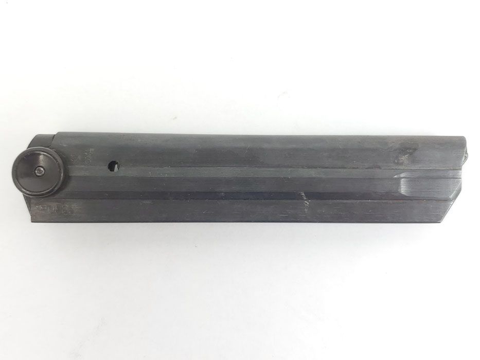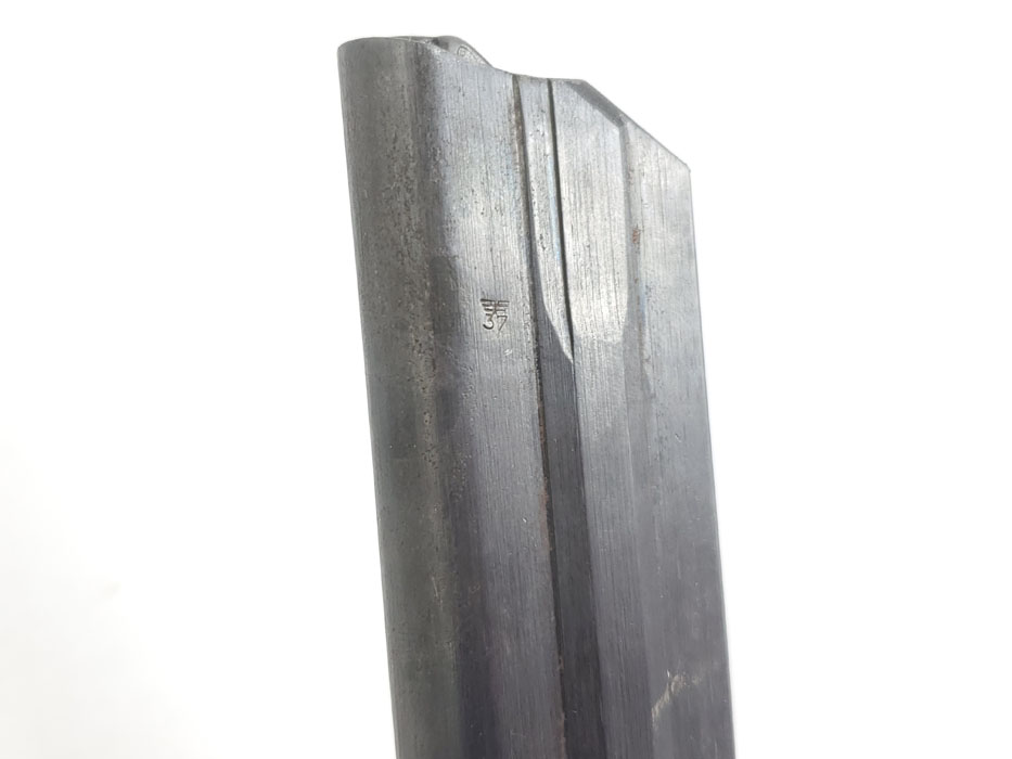 10/13/20 – This is an original black widow luger magazine from WW2. The magazine has a black bakelite base and blued tube with an fxo maker stamp and two eagle/37 proofs. The tube is also P.08 stamped but it looks like there’s also a post-factory “83” stamp next to this. The bakelite base is also slightly bent out of place, resulting in a small gap on the front / toe. See photos. This doesn’t affect functionality, but has been priced accordingly.