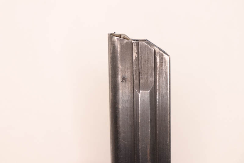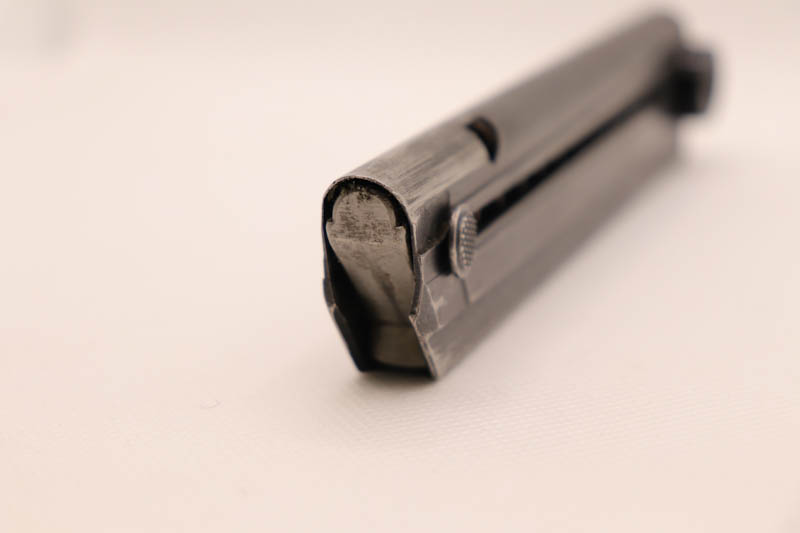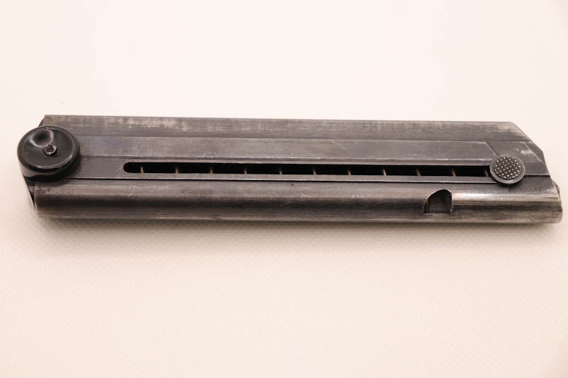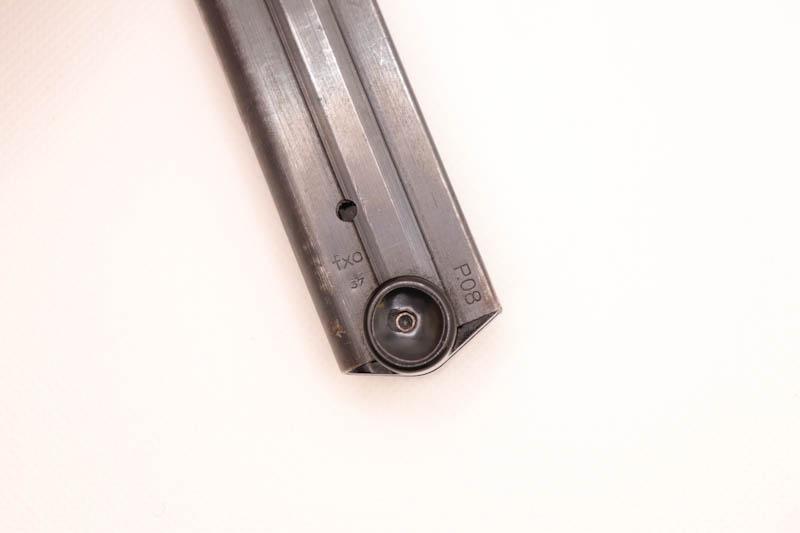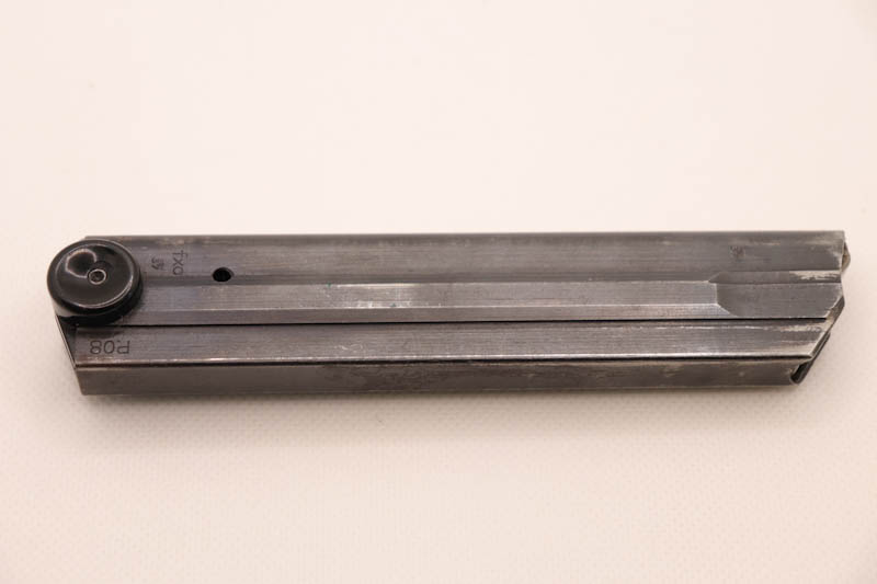 10/17/20 – This is an original “fxo” Luger magazine with two proof eagle/37 stamps on the frame, and a black bakelite base. The bluing has thinned a bit around the body and there is some minor rust on the spine – visible in photos. Fully functional with a strong spring.