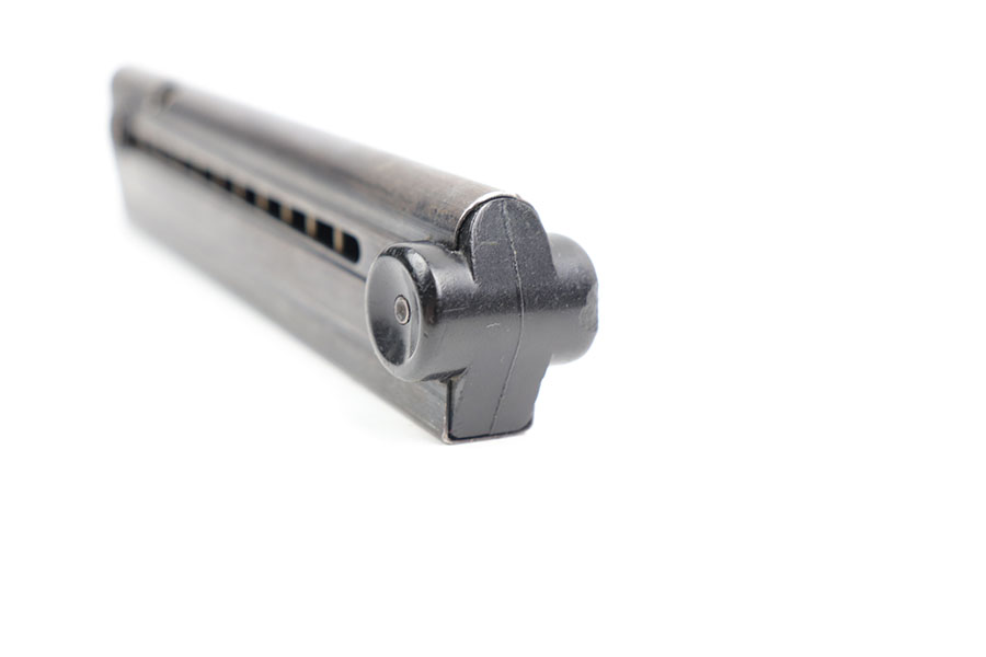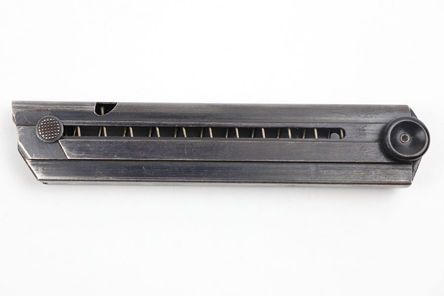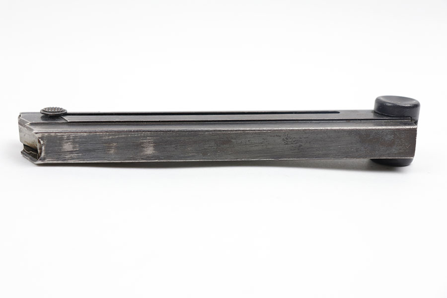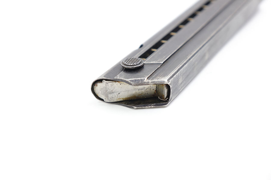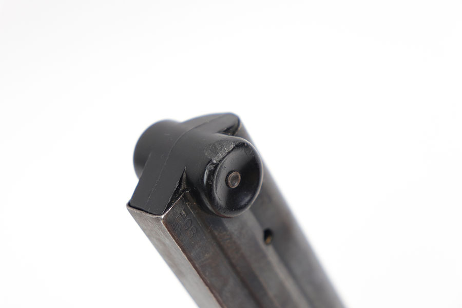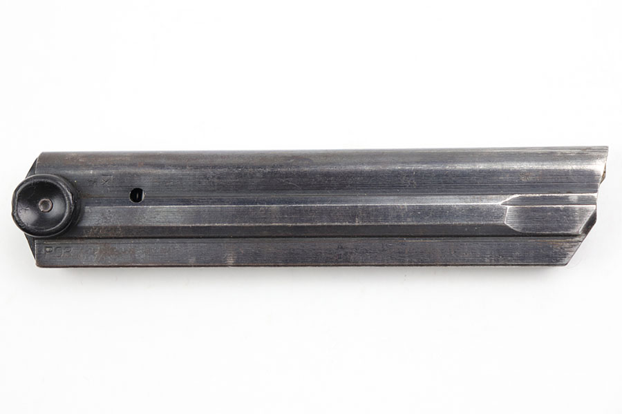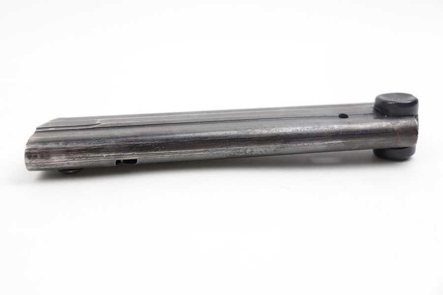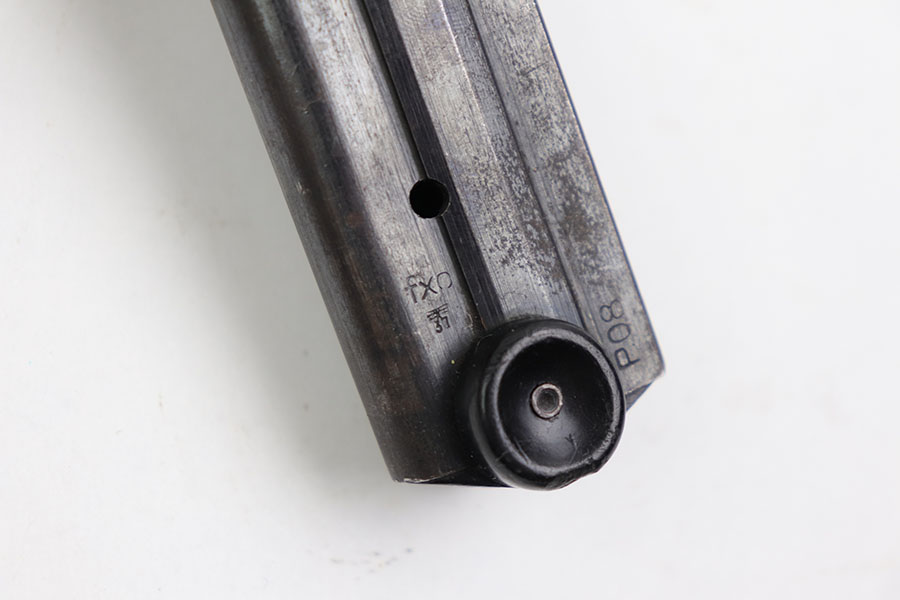12/10/20 – This is an original WW2 black widow luger magazine. The magazine is excellent except for a very small chip out of the base – see photos. Properly stamped on the tube with fxo P.08 and two eagle/37 proof stamps. Some light bluing loss but no rust or pitting. Functional spring.
