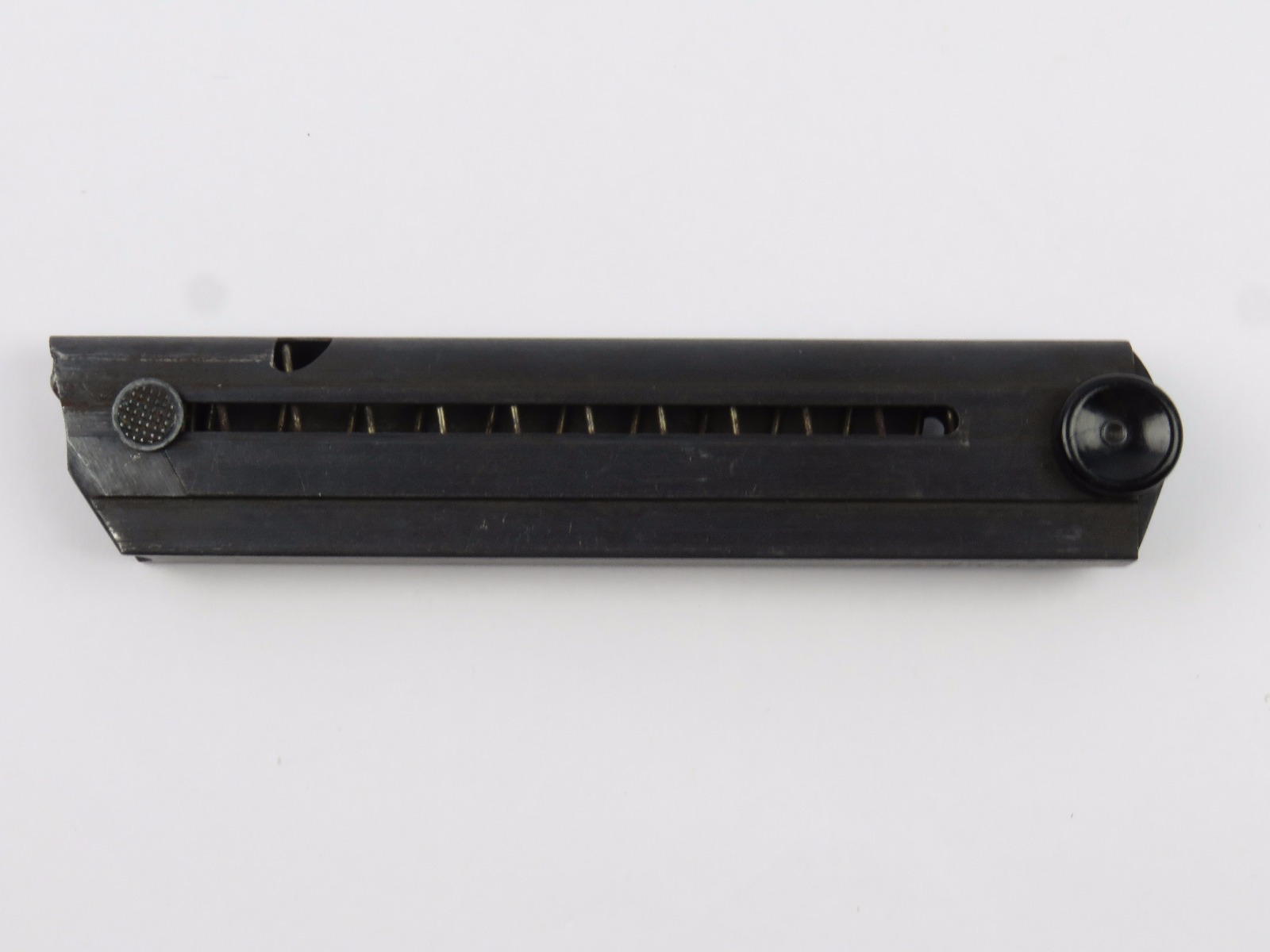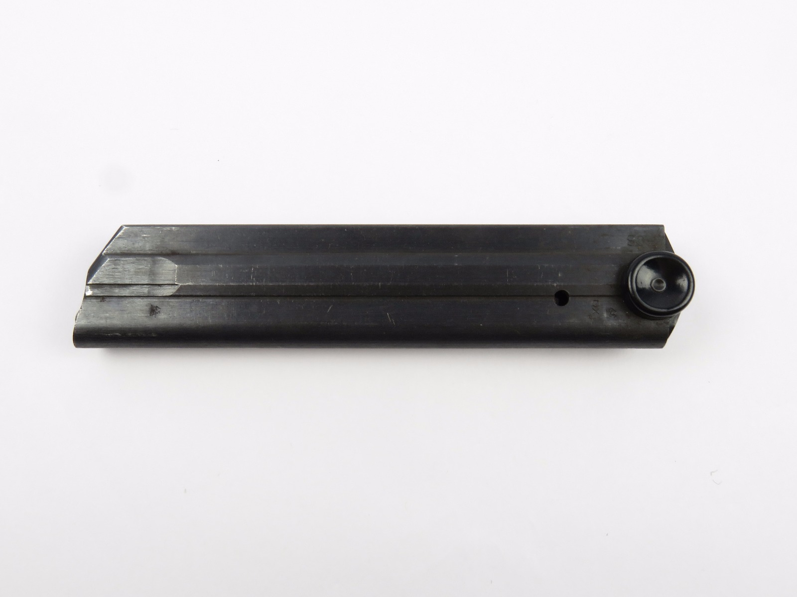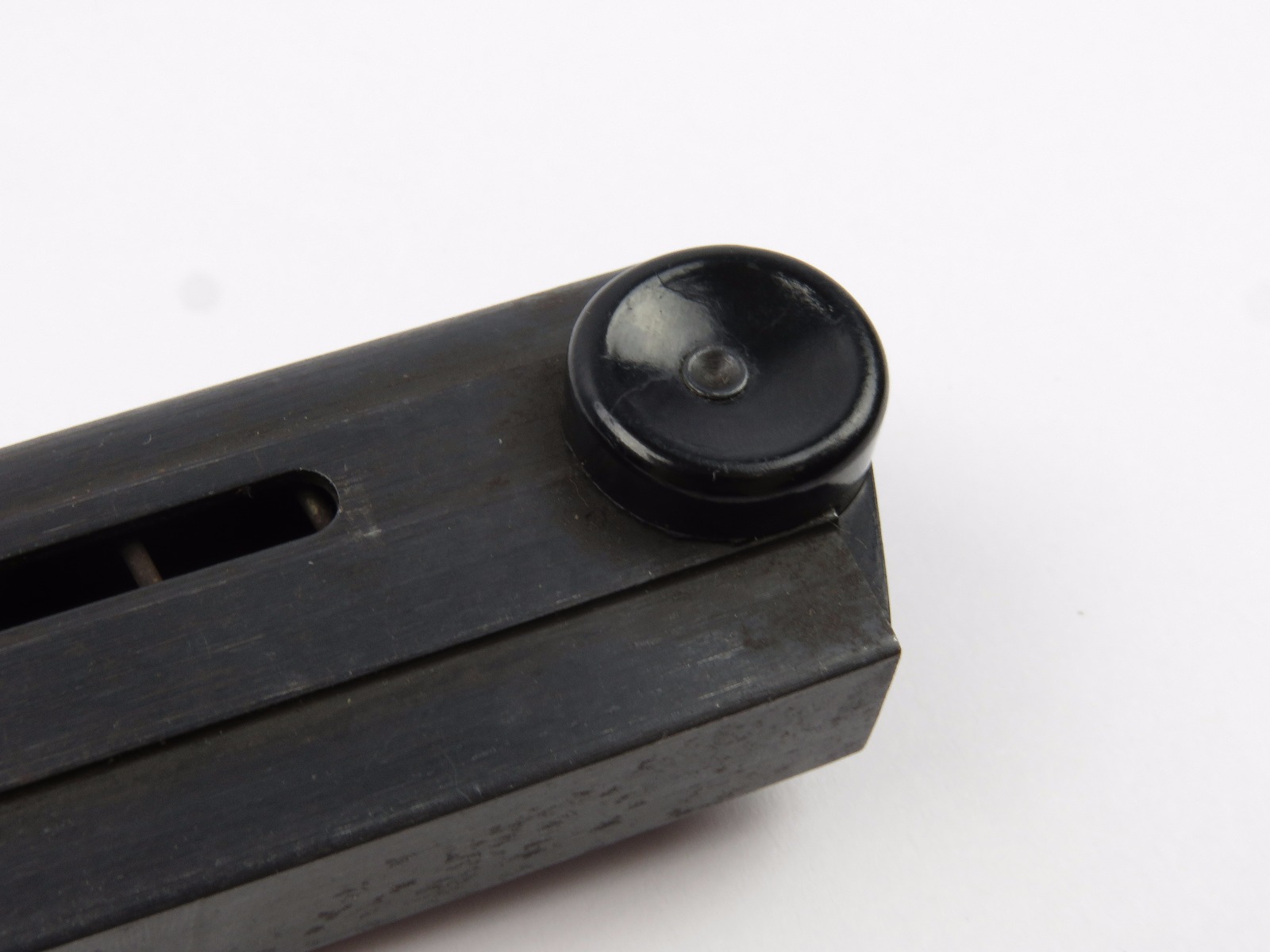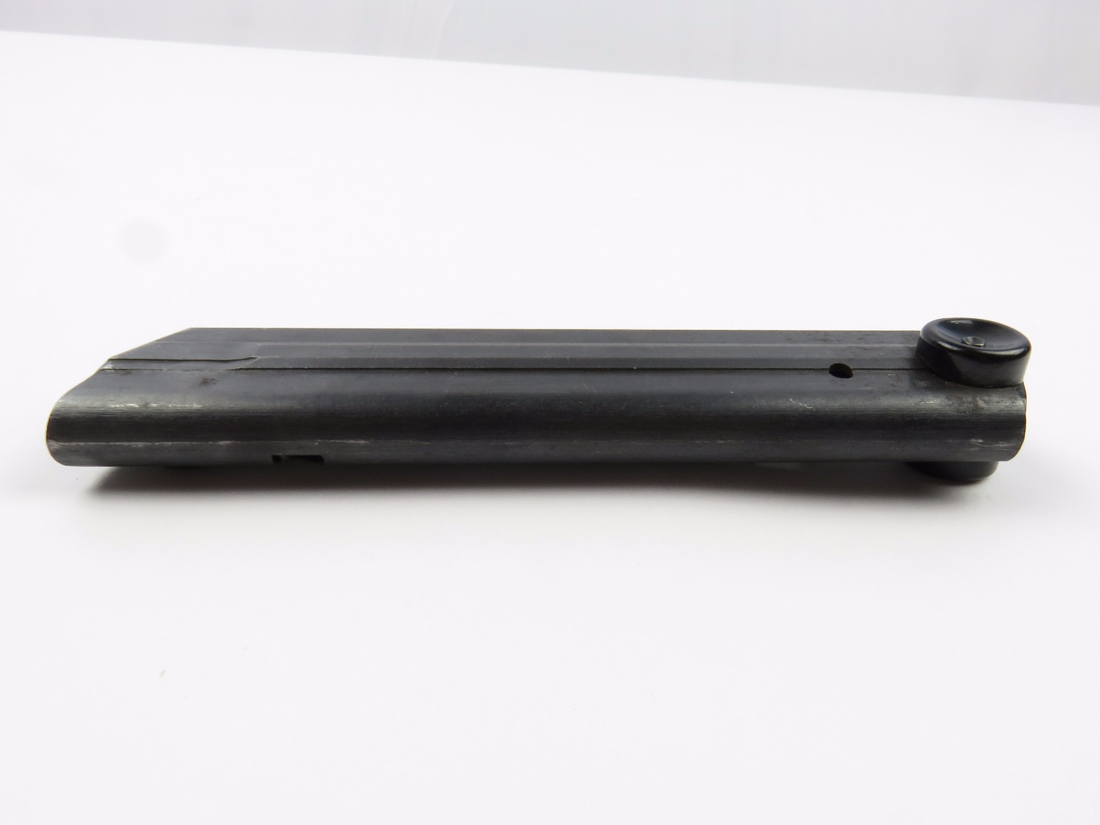 10/16/17 – This is an original Black Widow Luger magazine from WW2. The magazine is in good condition, but there is some surface wear on the tube – please see photos. This wear isn’t serious rust or pitting, but normal aging wear and beginning signs of rust. The base is in excellent condition though – all original bakelite. The magazine frame is stamped “fxo” and “P.08” along with two eagle/37 proof stamps on one side. Guaranteed original and authentic with a fully functional spring.