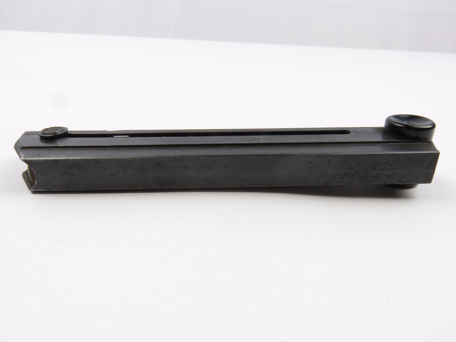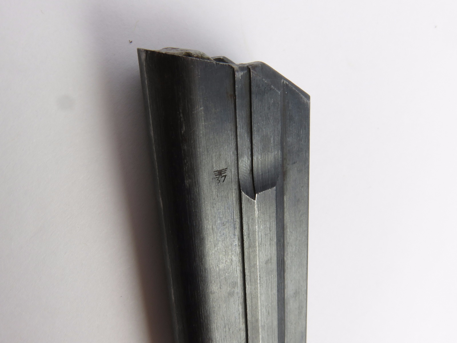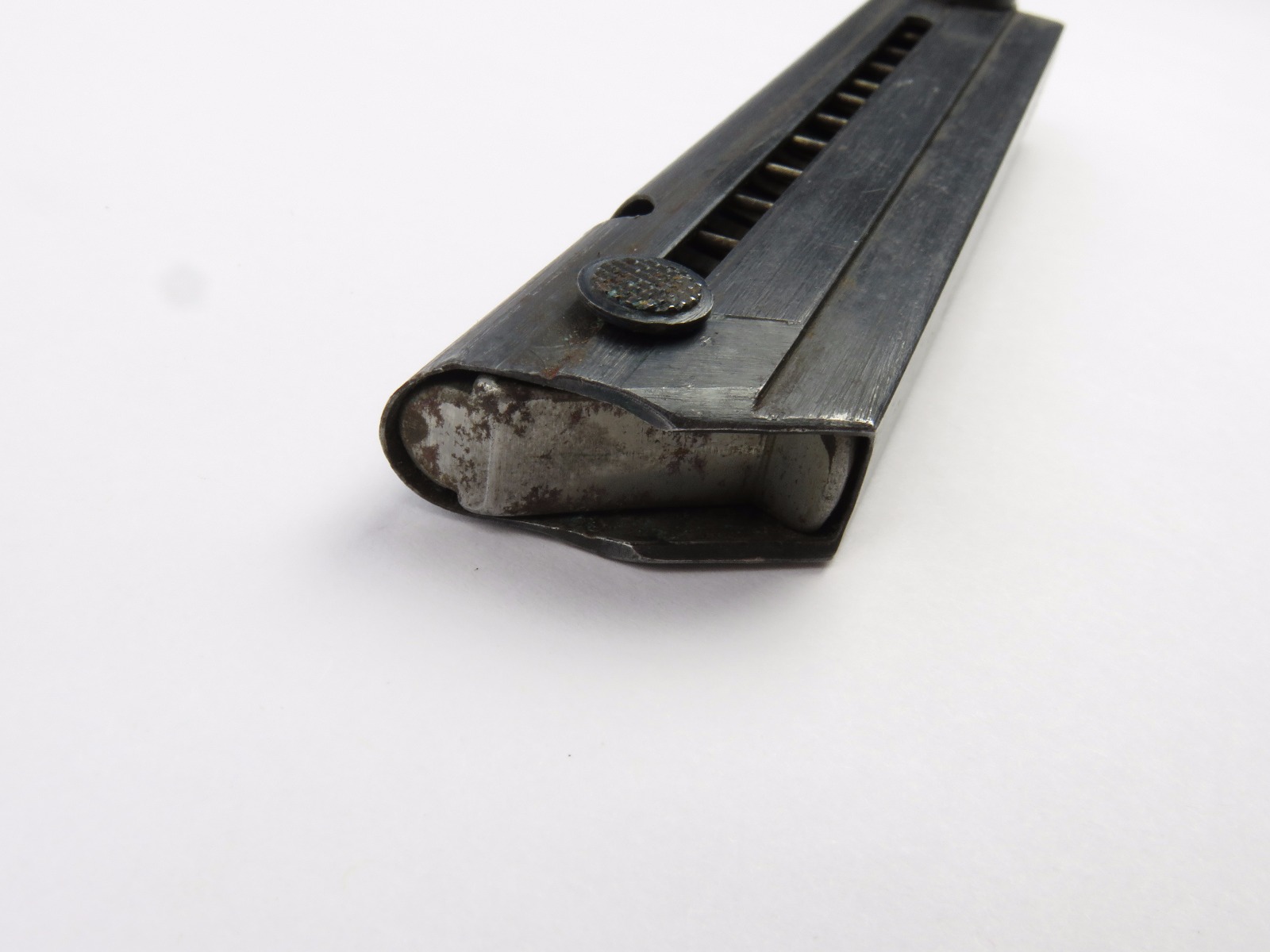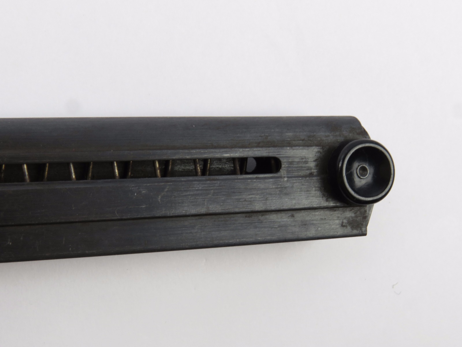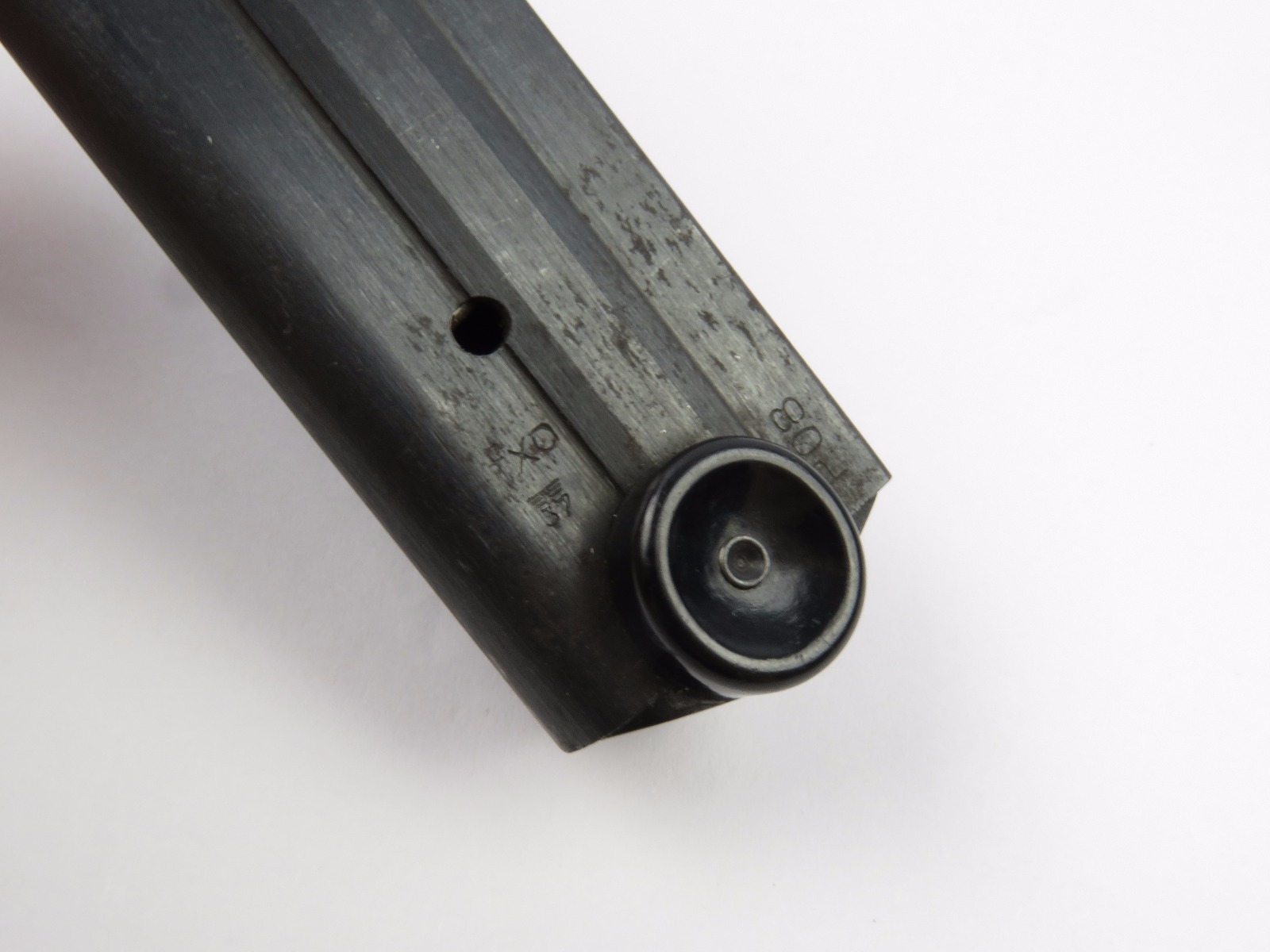 10/16/17 – This is an original Black Widow Luger magazine from WW2. The magazine is in good condition, but there is some surface wear on the tube – please see photos. This wear isn’t serious rust or pitting, but normal aging wear and beginning signs of rust. The base is in excellent condition though – all original bakelite. The magazine frame is stamped “fxo” and “P.08” along with two eagle/37 proof stamps on one side. Guaranteed original and authentic with a fully functional spring.