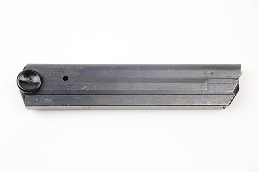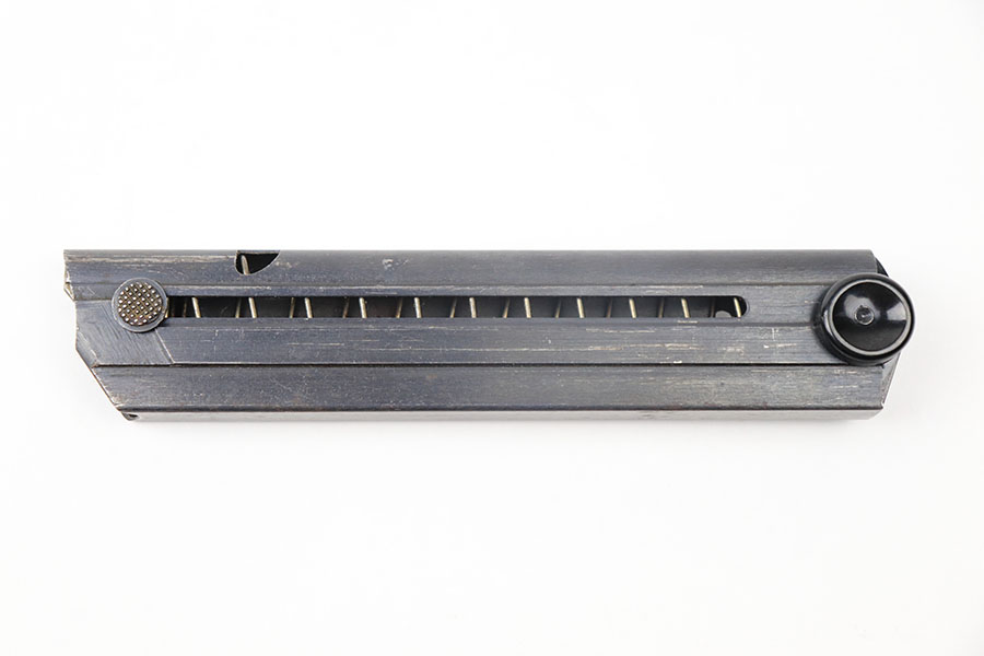 11/17/21 – This is an original Black Widow Luger magazine from WW2. The magazine has a black bakelite base that has no cracks or chips. The magazine tube has great bluing throughout despite some mild surface patina. The tube is P.08 stamped, fxo stamped, and proof stamped with two eagle 37 proofs. Strong, functional spring.