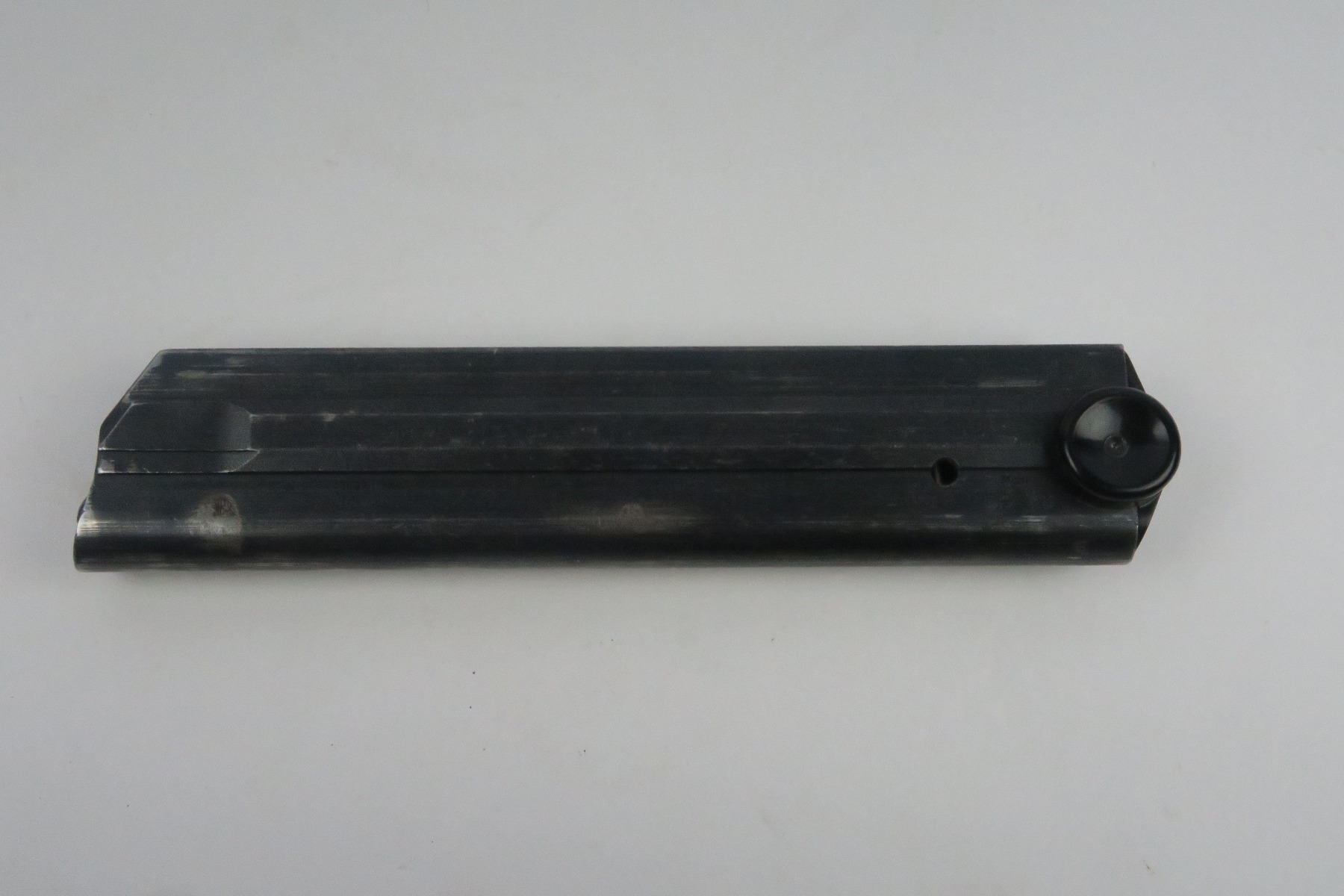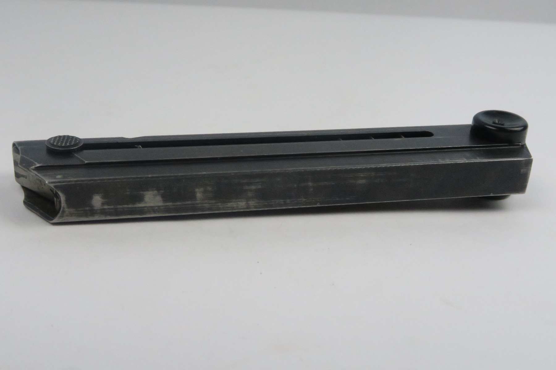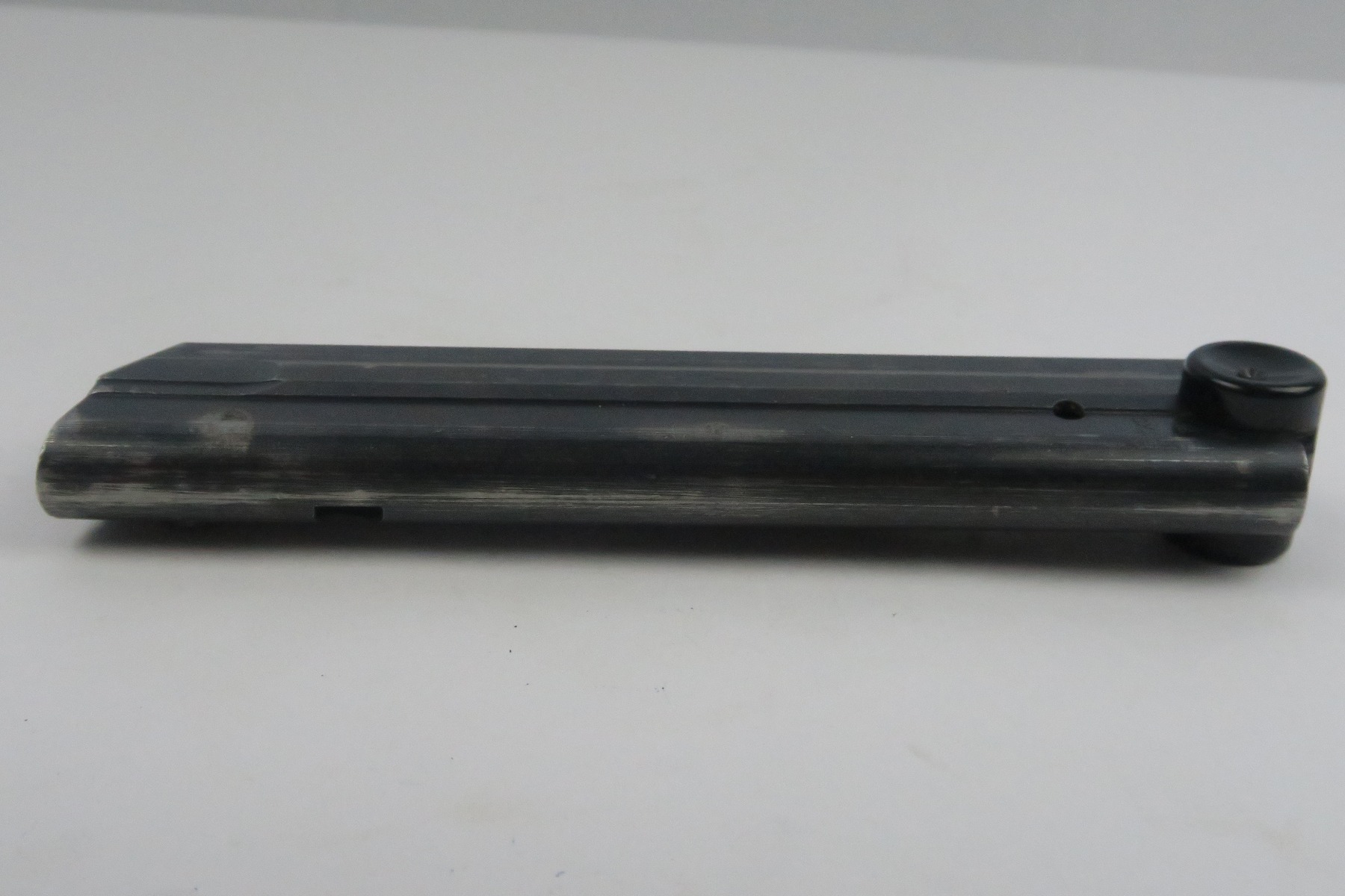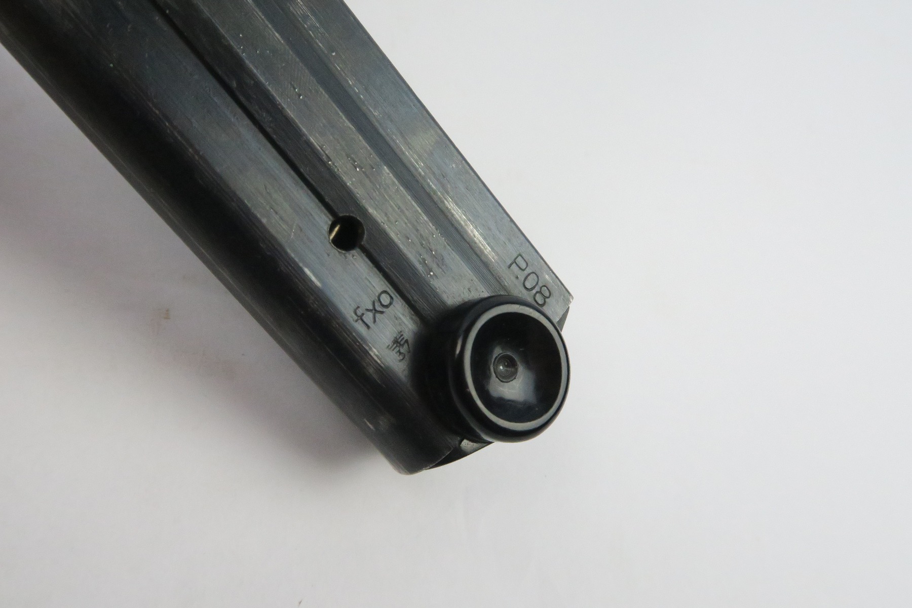 12/26/17 – This is an original WW2 production Black Widow Luger magazine. The magazine is “fxo” stamped with two eagle/37 proofs on the left side of the frame. The bluing throughout the frame is in great condition but there is some significant bluing loss in a few small areas. No rust or pitting and a strong spring. The base has no cracks or chips and is completely original.