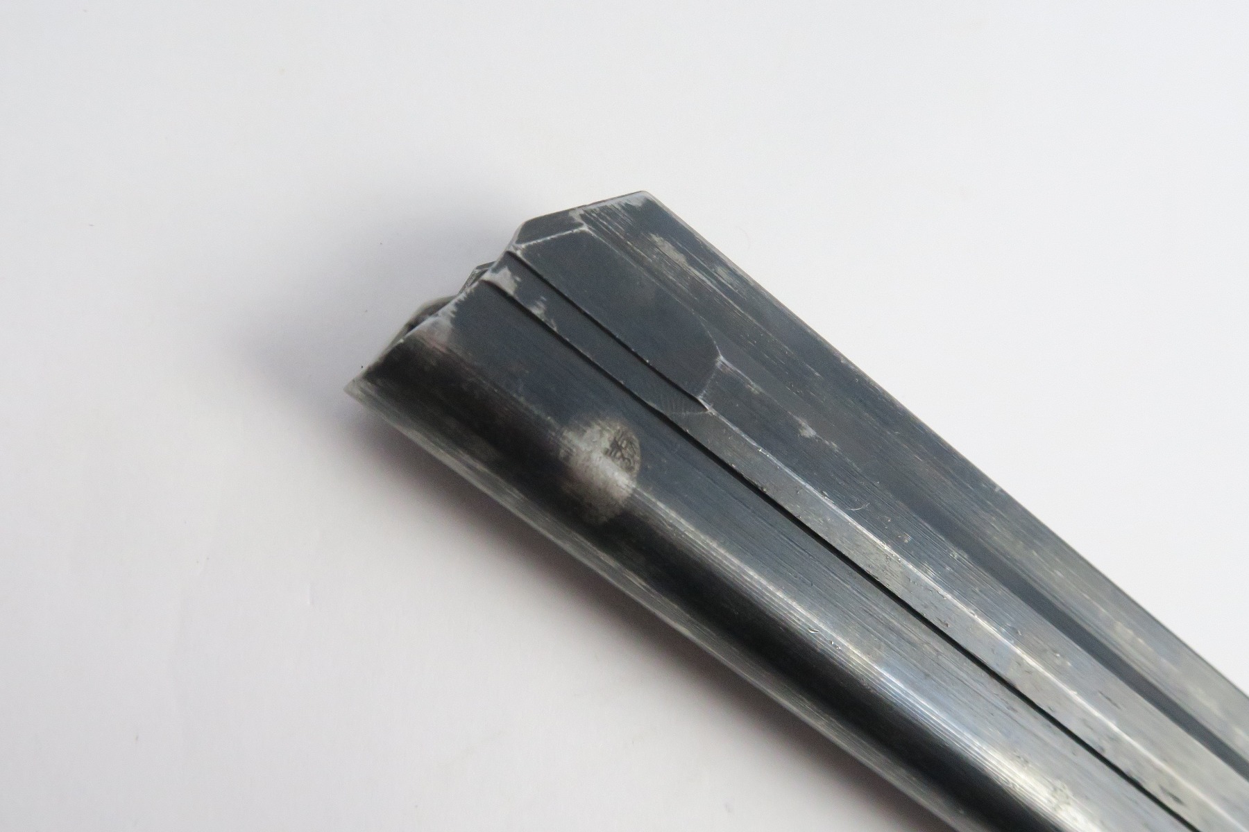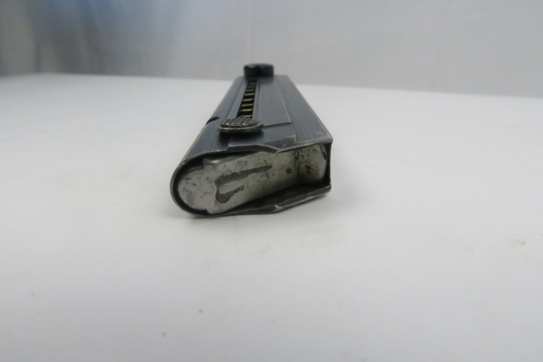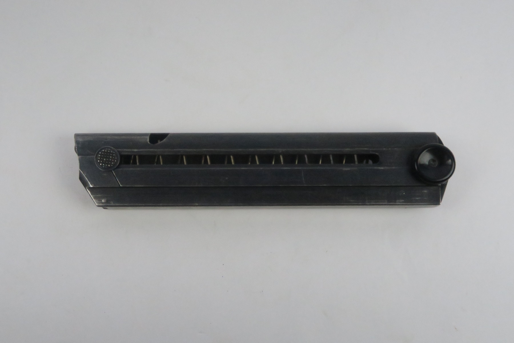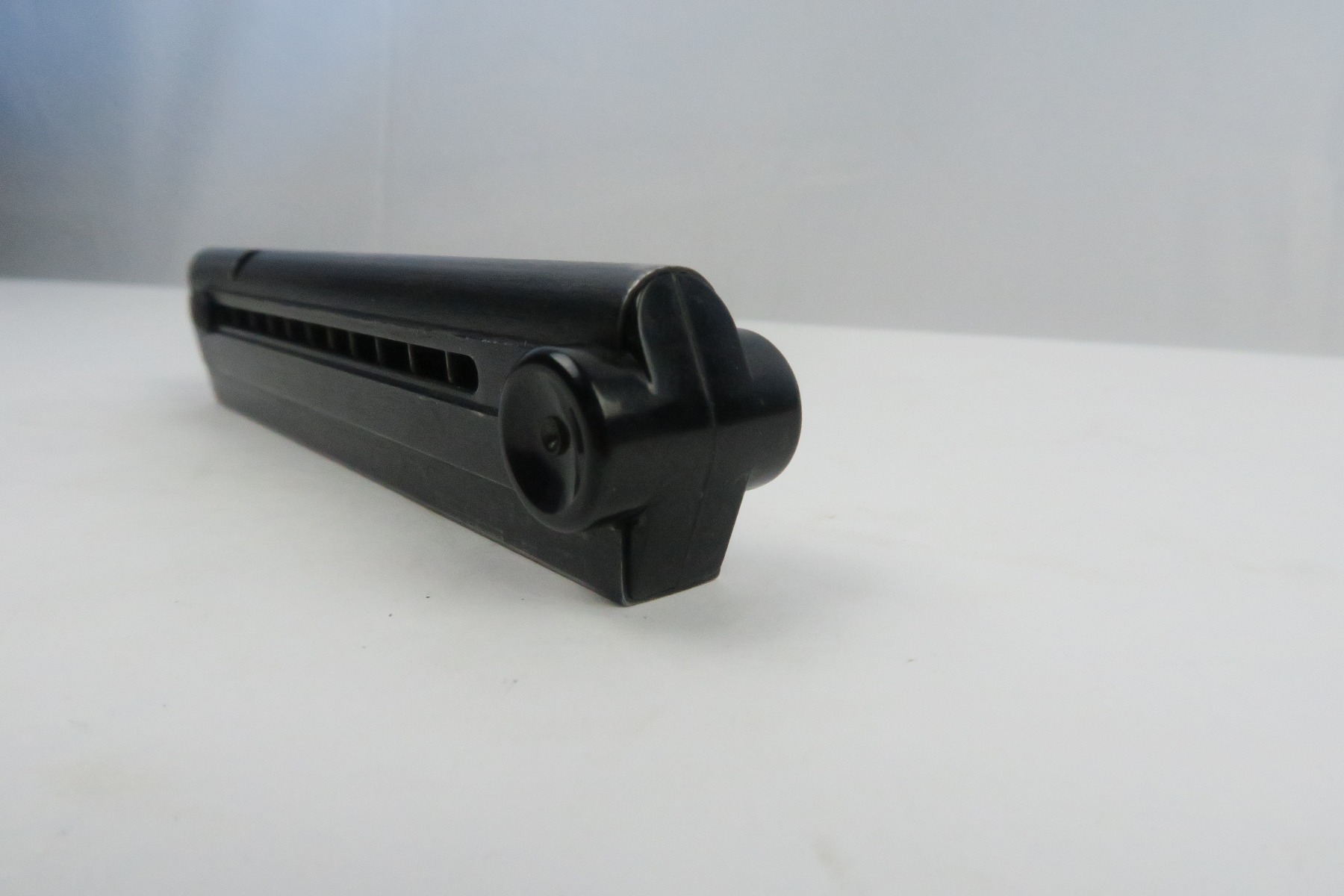 12/26/17 – This is an original WW2 production Black Widow Luger magazine. The magazine is “fxo” stamped with two eagle/37 proofs on the left side of the frame. The bluing throughout the frame is in great condition but there is some significant bluing loss in a few small areas. No rust or pitting and a strong spring. The base has no cracks or chips and is completely original.