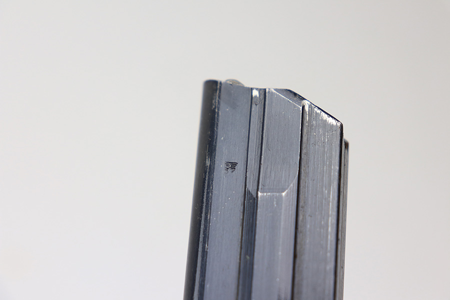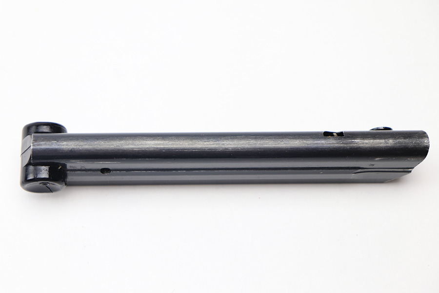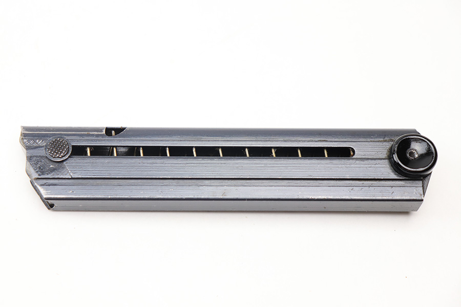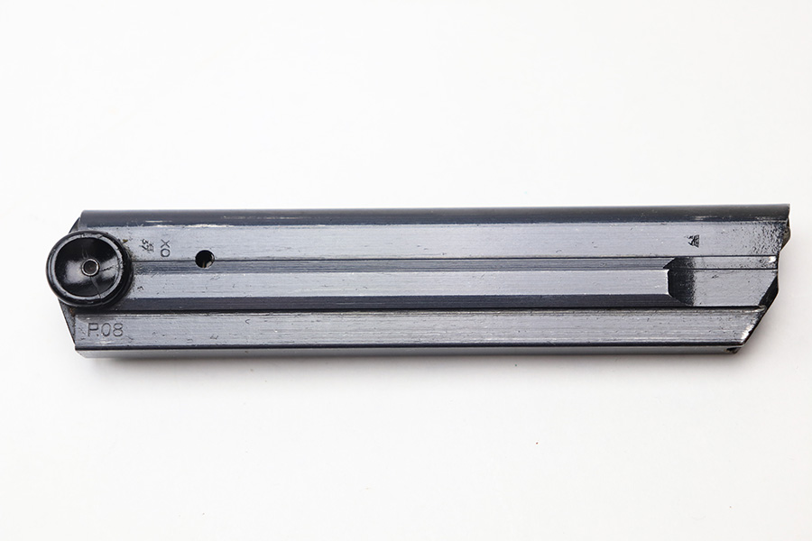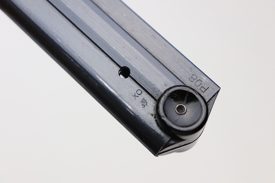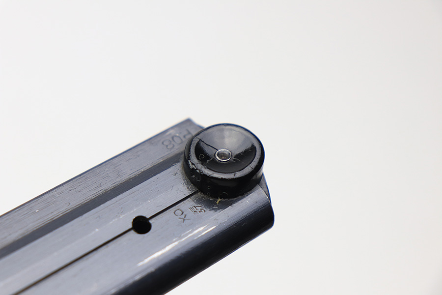 1/13/22 – This is an original WW2 Black Widow Luger magazine. The magazine is stamped “fxo” with two eagle 37 proof stamps on the tube. The base is black bakelite and in good condition despite a small crack in the left ear. Otherwise the magazine is excellent.