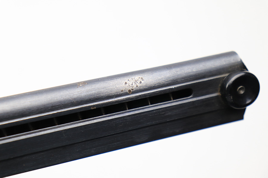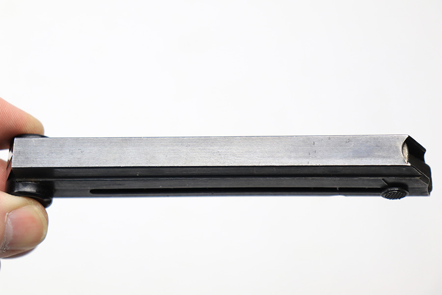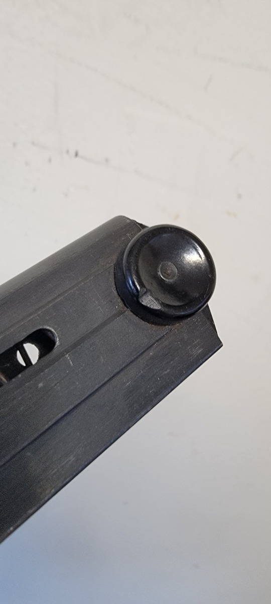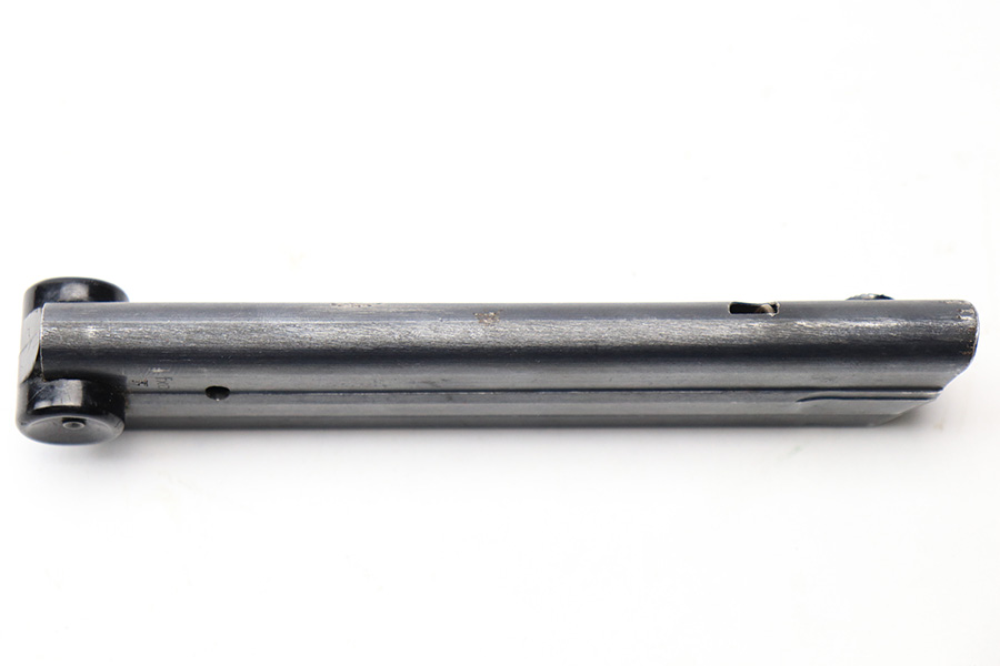 4/22/22 – This is an original Mauser Black Widow luger for a BYF 41 or BYF 42 P.08. The magazine has a blued tube and black bakelite base. The right “ear” of the base has a very small chip, and there is an area of pitting on the tube, but otherwise the magazine is in great condition with a strong, functional spring.