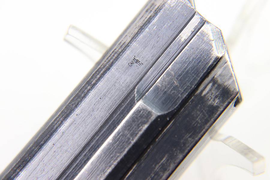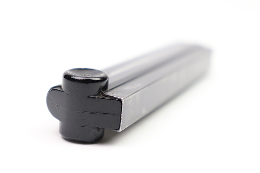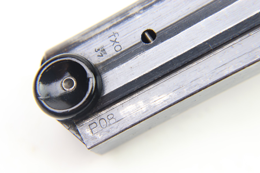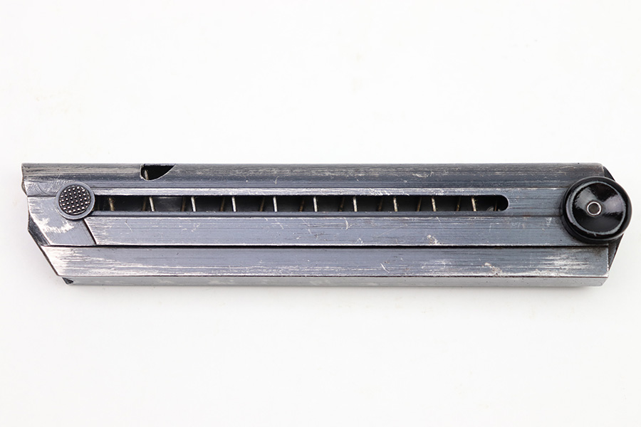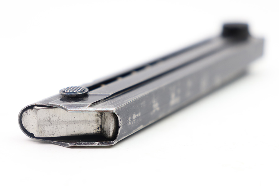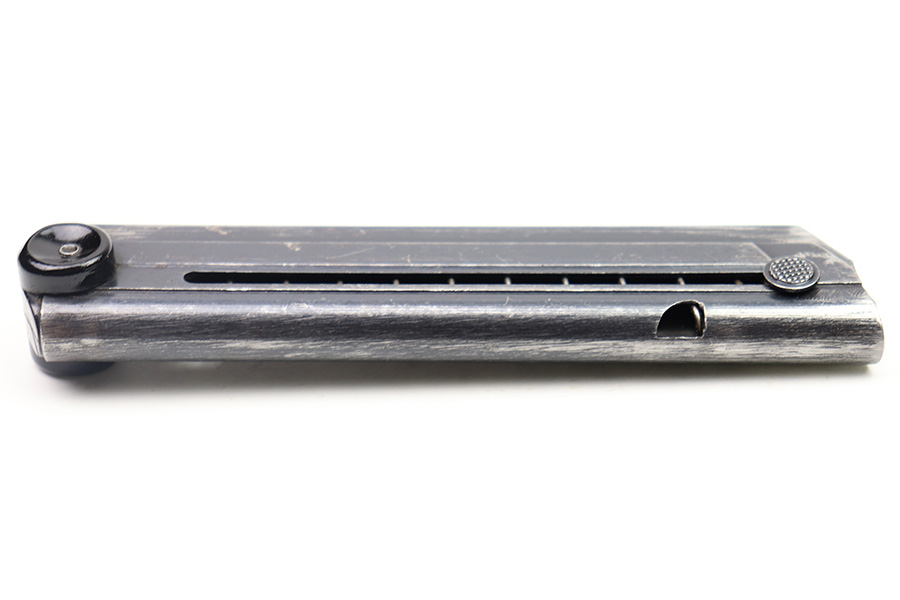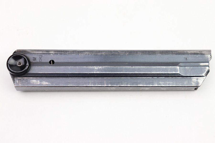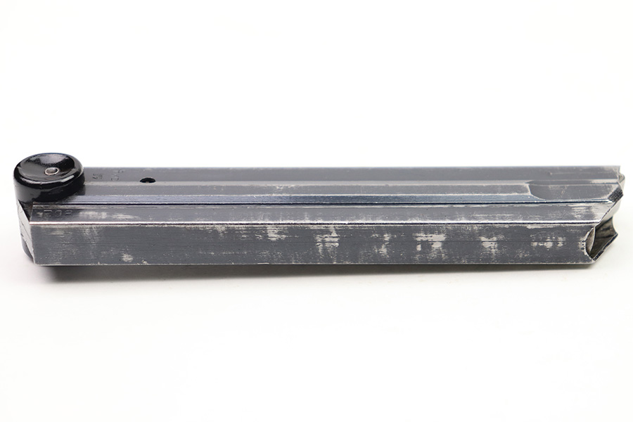 9/23/22 – This is an original Black Widow Luger magazine from WW2. The magazine is “fxo” maker stamped by Haenel and eagle/37 proof stamped on the tube. The black bakelite base has some mild surface wear and a few light scratches, but no cracks or chips. The tube has some patina and finish loss, but most of the finish is still intact. The spring is tight and fully functional.
