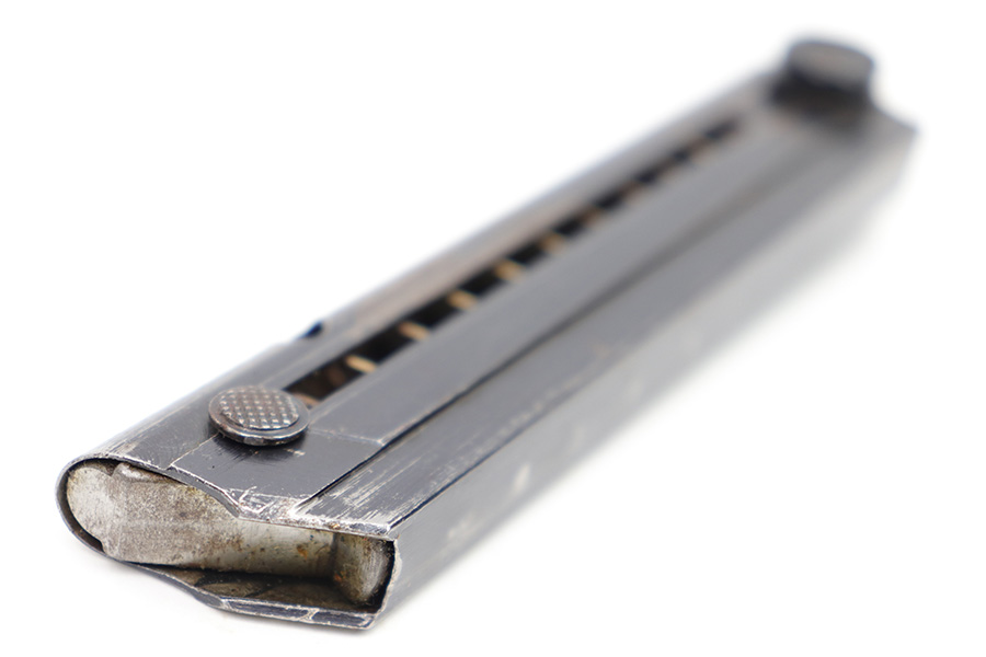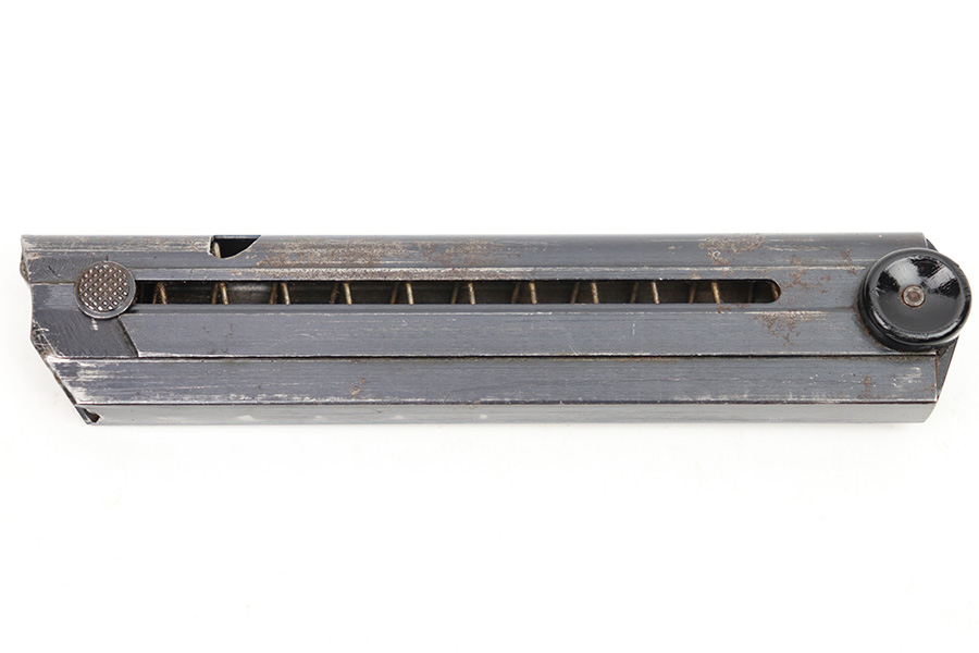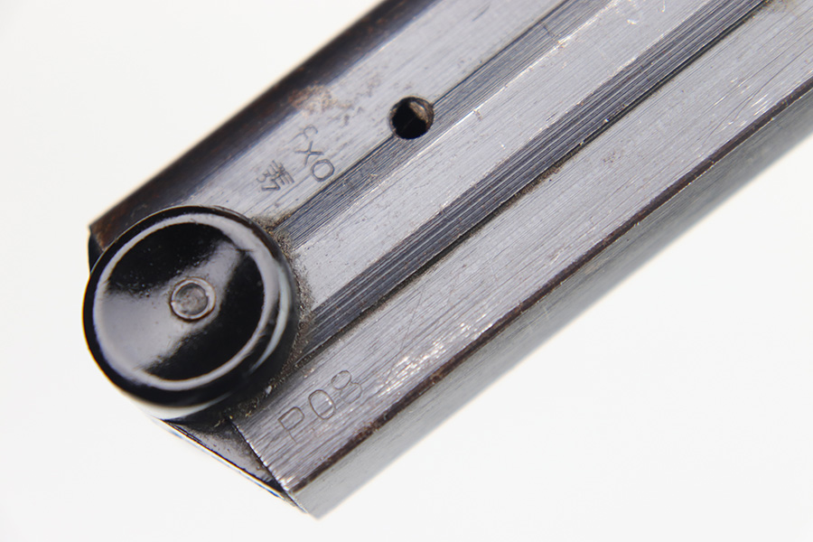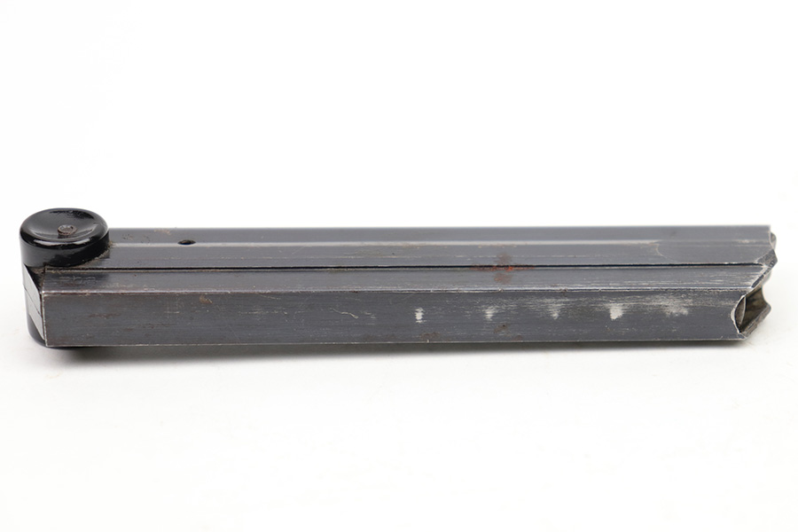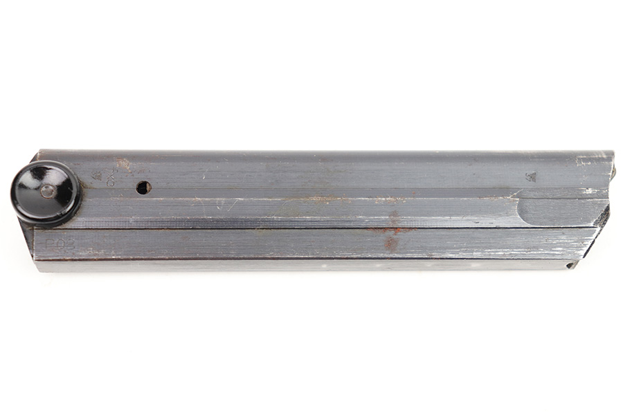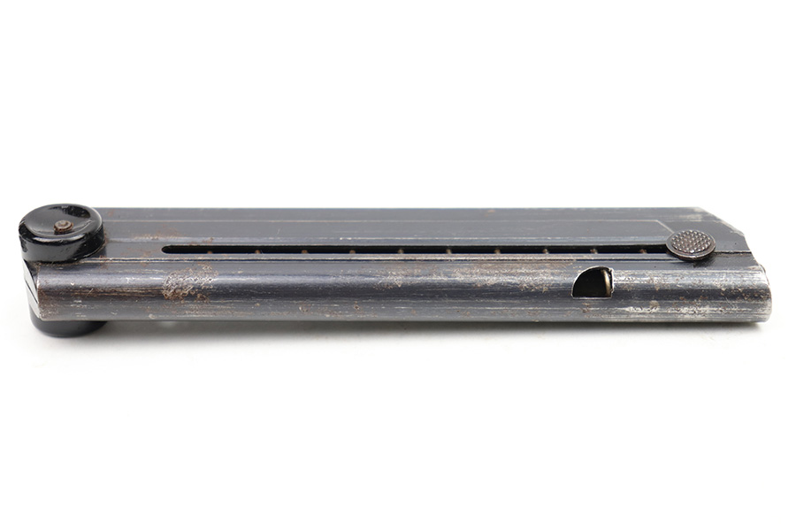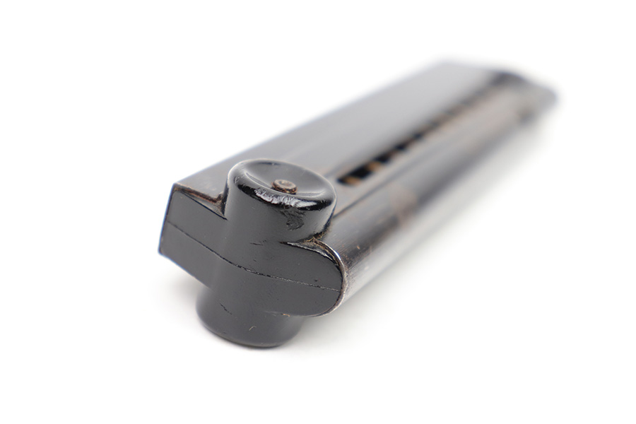 2/7/23 – This is an original Black Widow Luger magazine from WW2. The magazine is stamped on the tube with a “fxo” maker code, and two eagle 37 proof stamps. The tube has some mild surface patina and a few small spots of pitting, but overall the magazine is in very good condition. Strong, fully functional spring. The bakelite base has a few mild scuffs but no major issues.