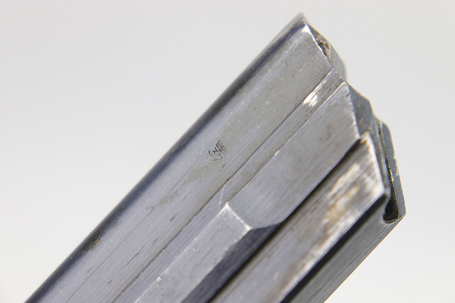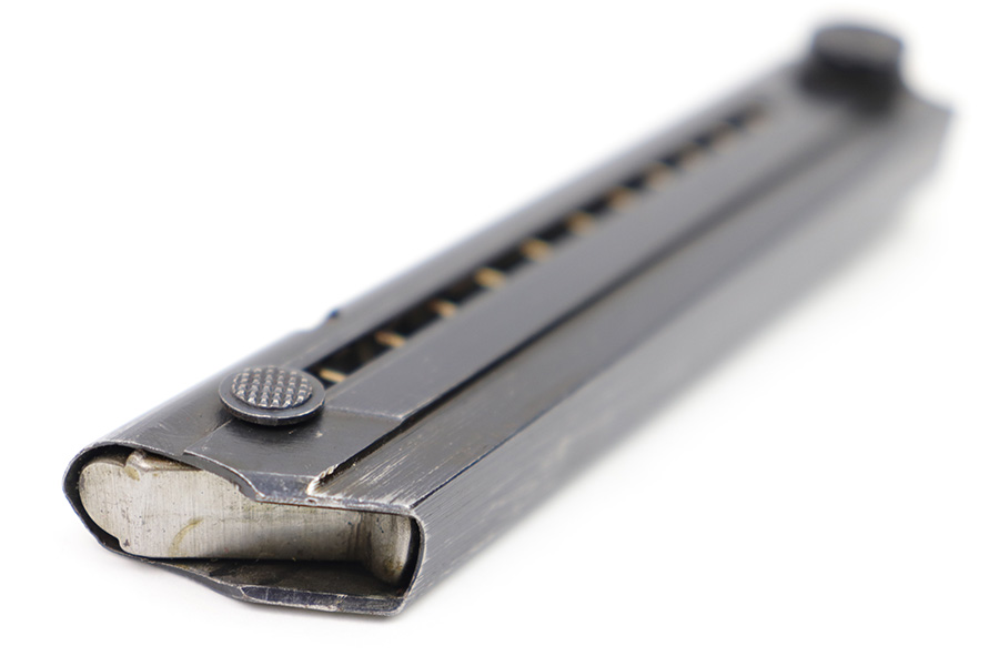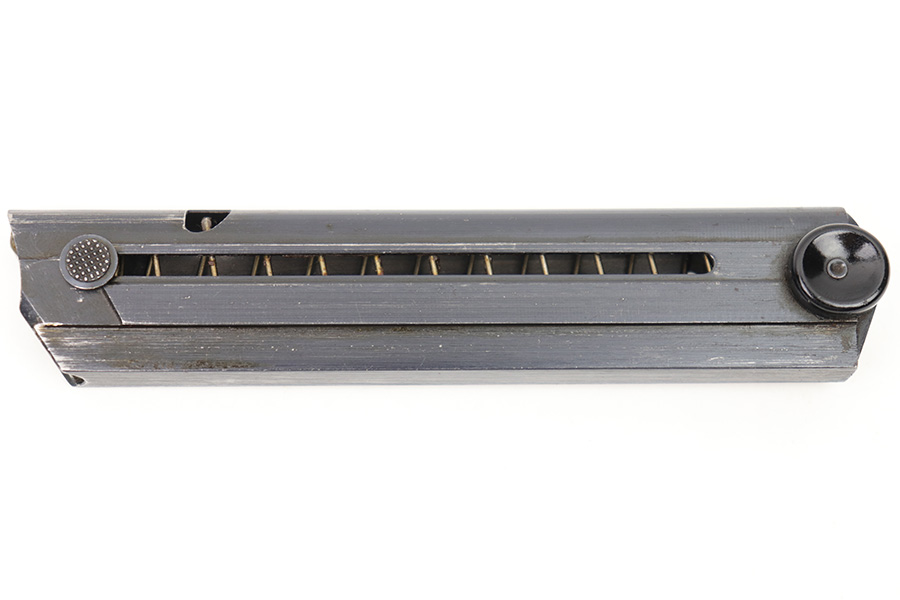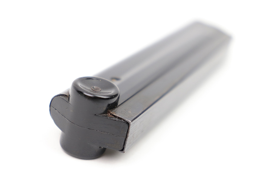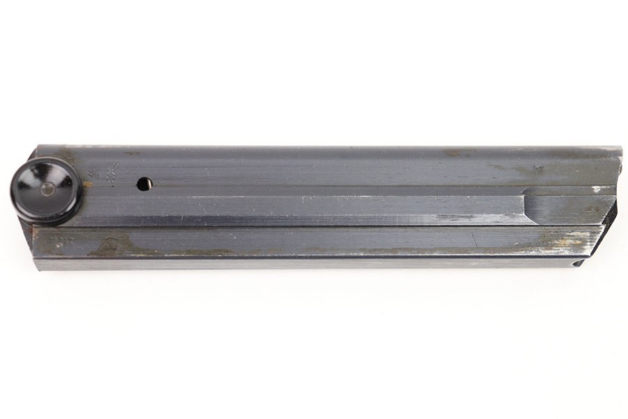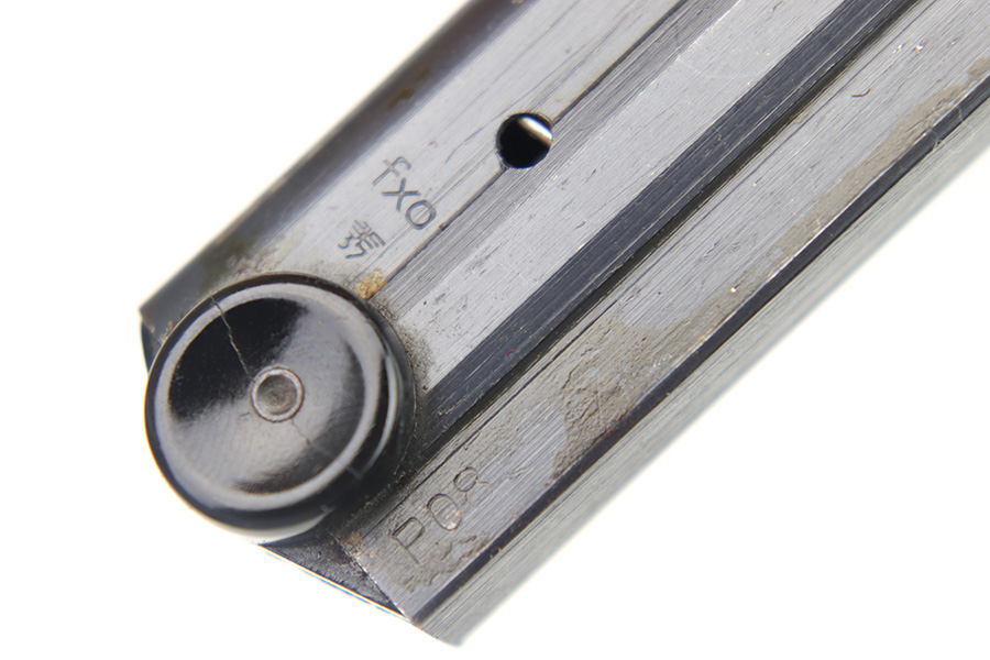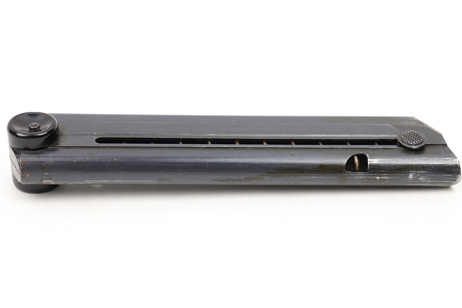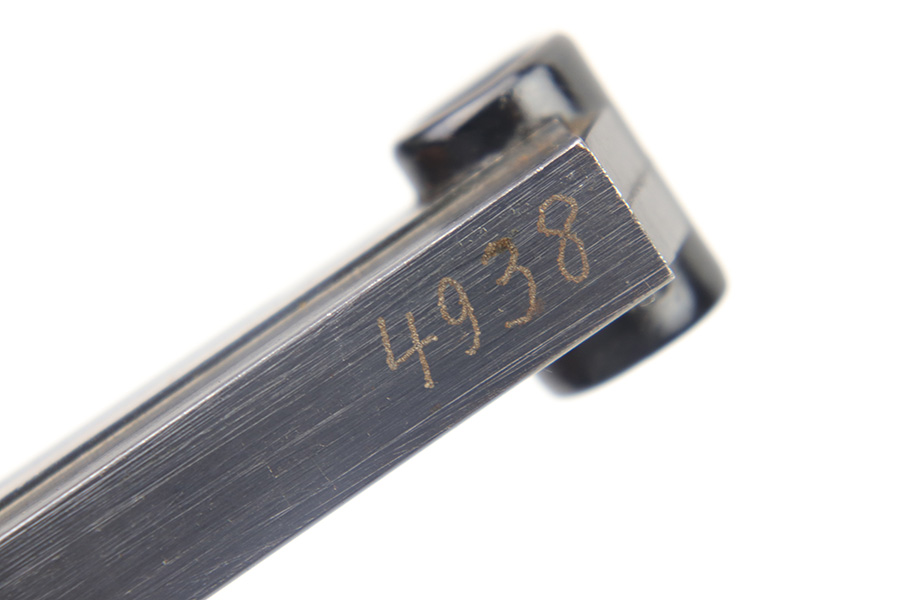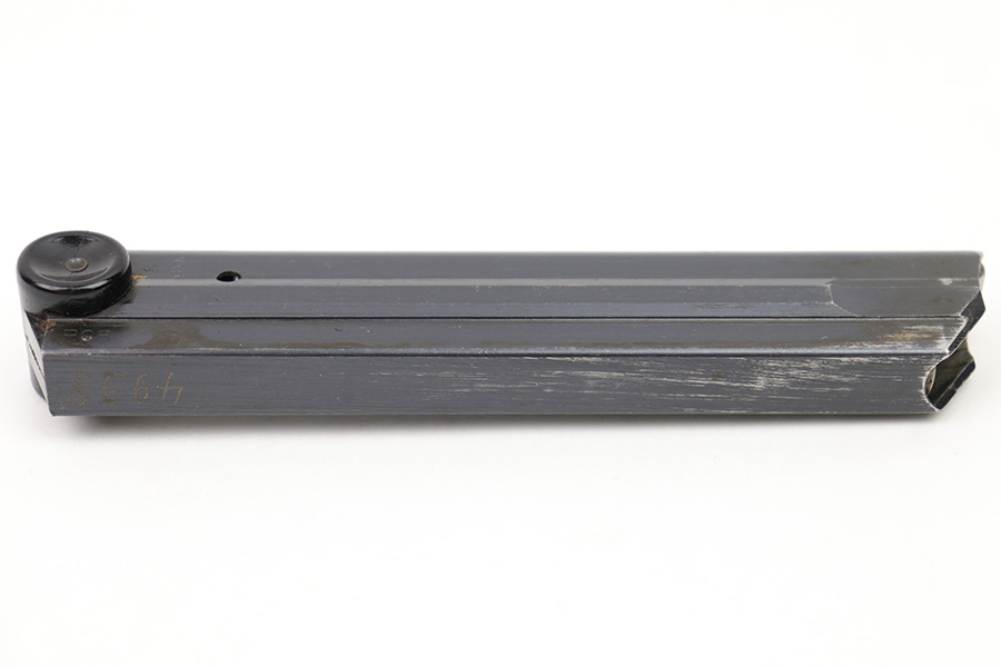 2/7/23 – This is an original Black Widow Luger magazine from WW2. The magazine is in near-excellent condition with a blued tube and black bakelite base. The base is in great condition, although there is a hairline crack along the left ear. This doesn’t affect functionality. The tube is near-excellent as well with minimal finish loss, but the spine has been electro-penciled with a serial number 4938, as shown. The tube still has the original FXO and eagle 37 proof stamps. The spring is strong and fully functional.