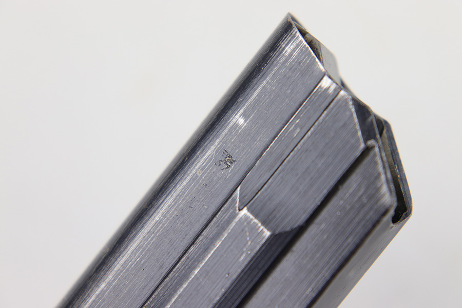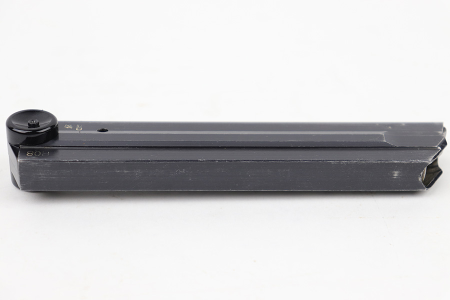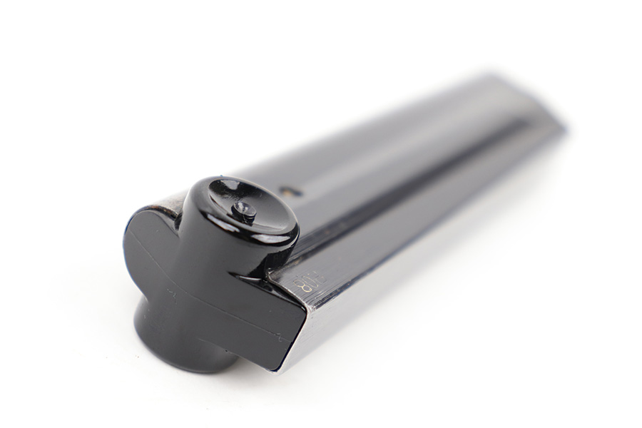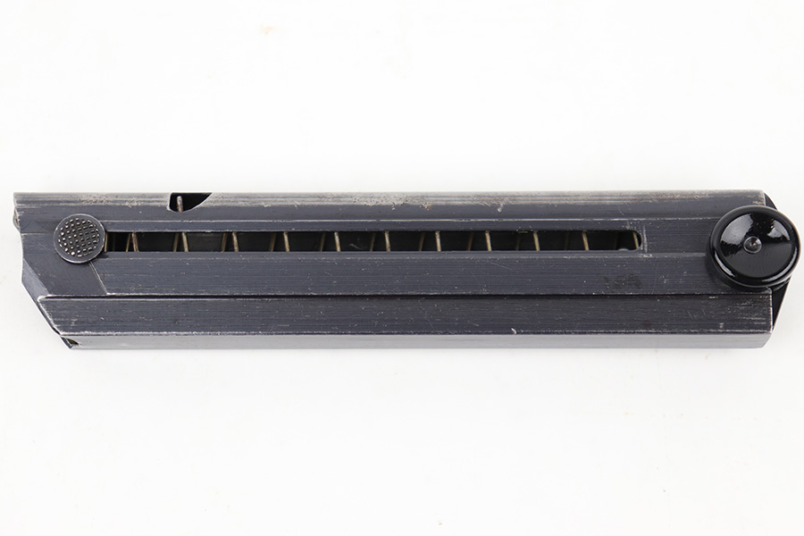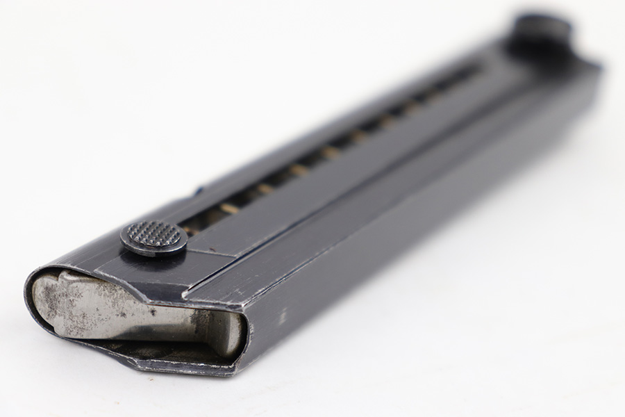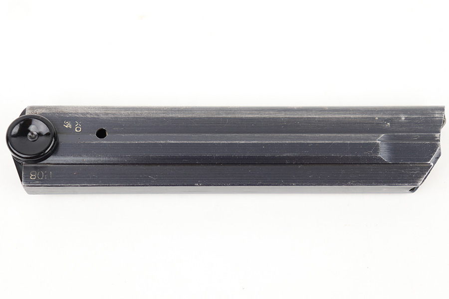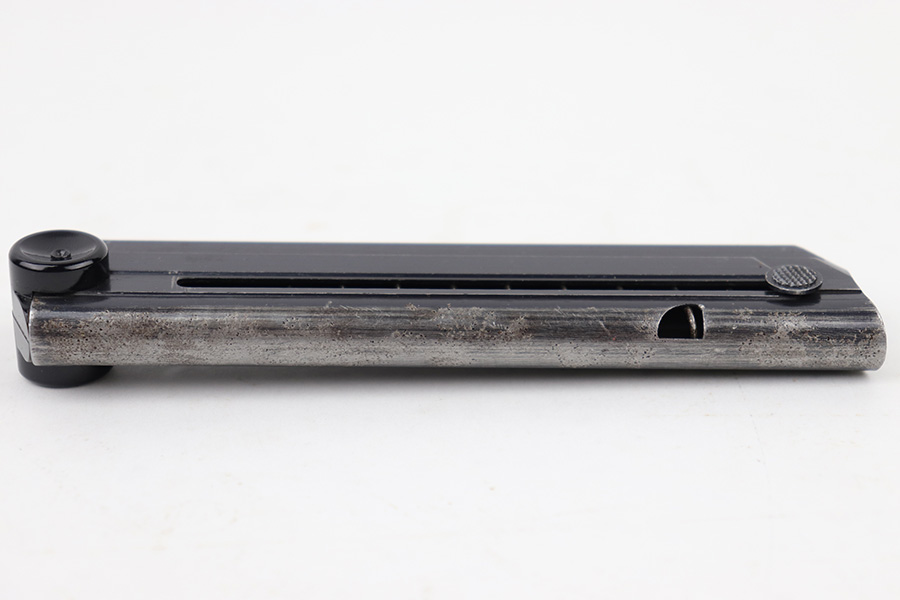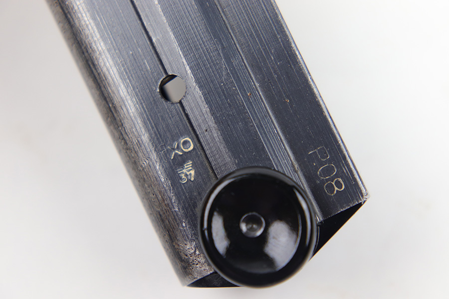 5/2/23 – This is an original WW2 production Black Widow Luger magazine. The base of the magazine is black bakelite with no cracks or chips. The blued tube has some finish loss along the front, rounded “spine”. There’s also some mild surface pitting in this area, but overall the tube is in great condition with two eagle/37 proof stamps, a P.08 stamp, and a “fxo” maker stamp by Haenel. Strong, functional spring.