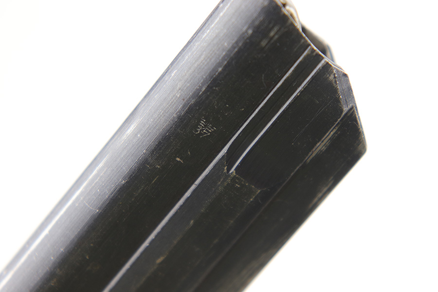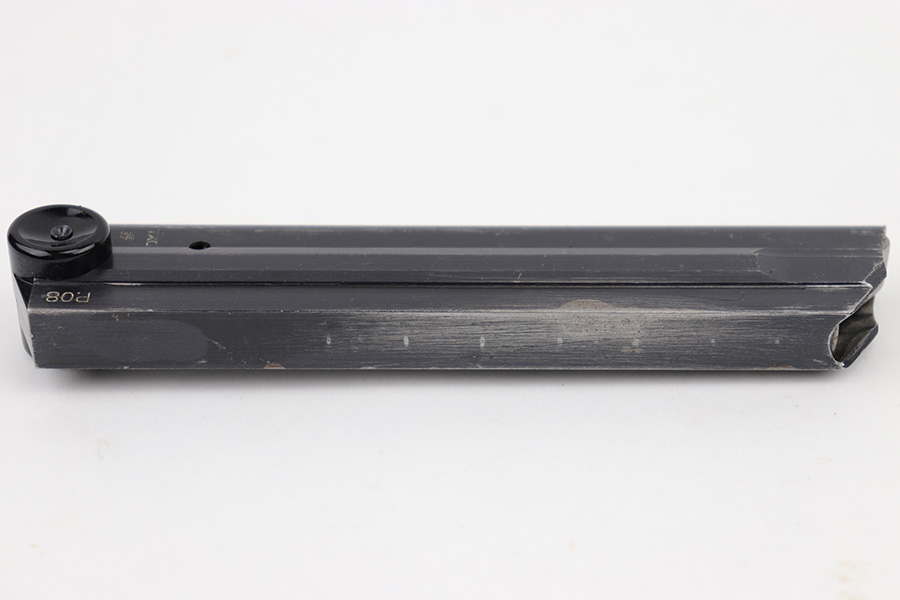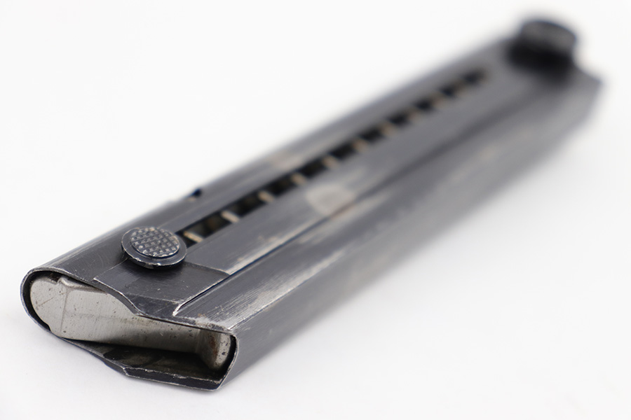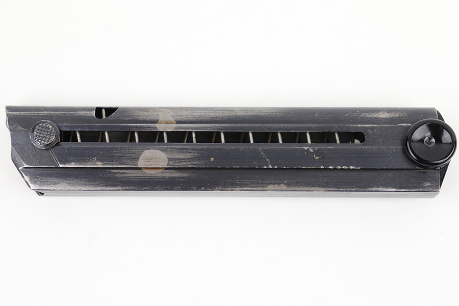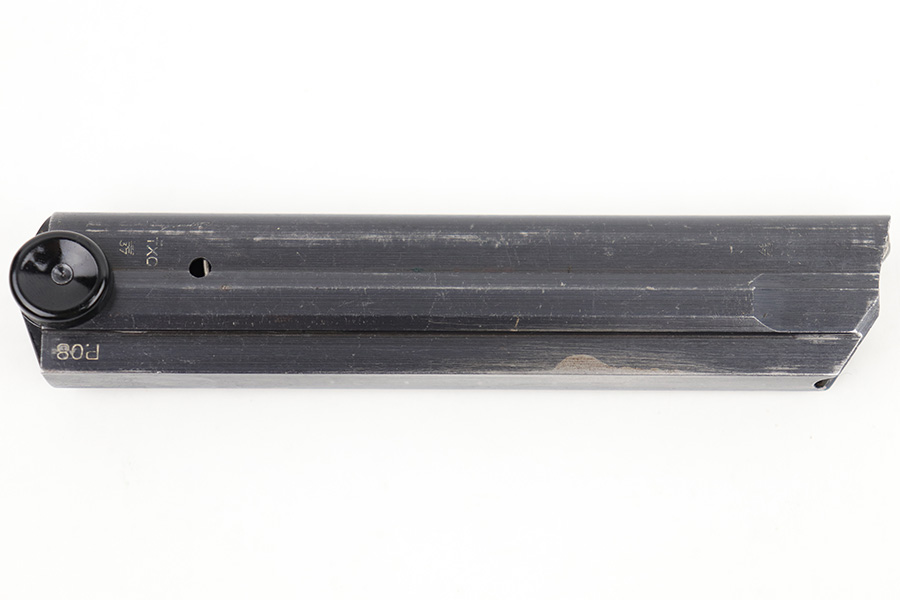 5/4/23 – This is an original WW2 production Black Widow Luger magazine. The magazine is in very good condition with some finish loss and thinning throughout the blued tube. The left side of the tube is “fxo” stamped with two eagle/37 proofs and a P.08 designation. The black bakelite base has no cracks or chips. Strong, functional spring.
