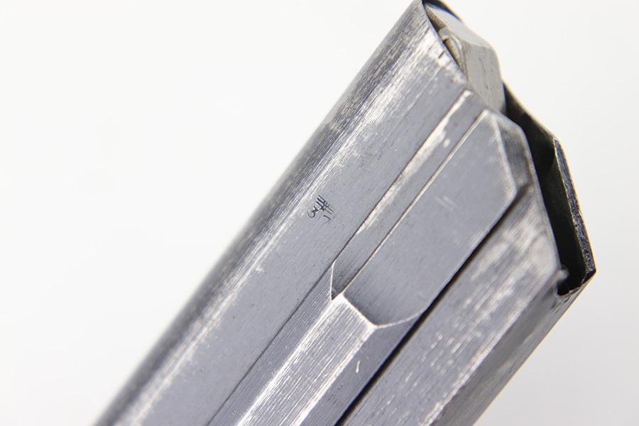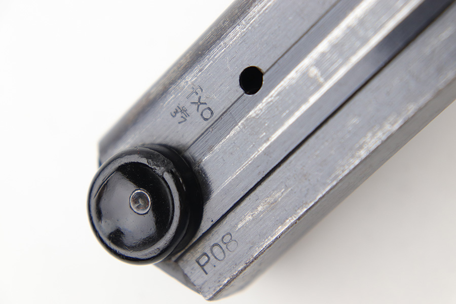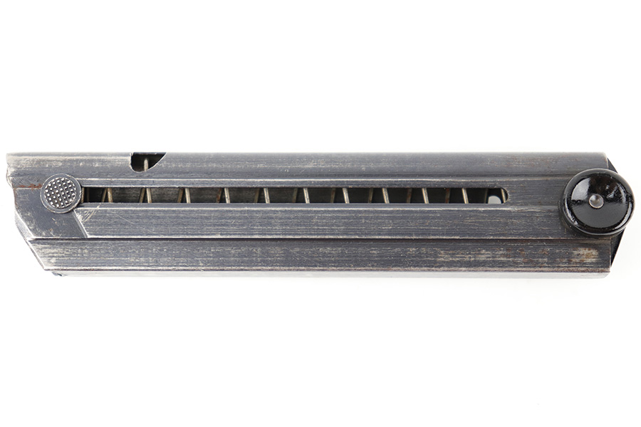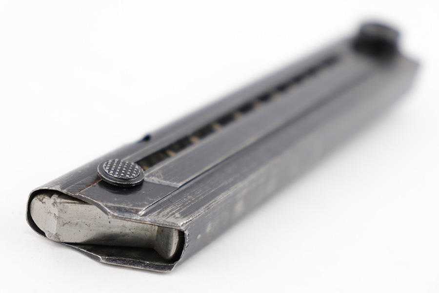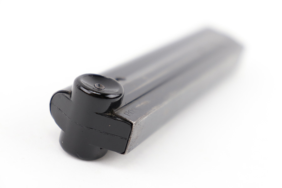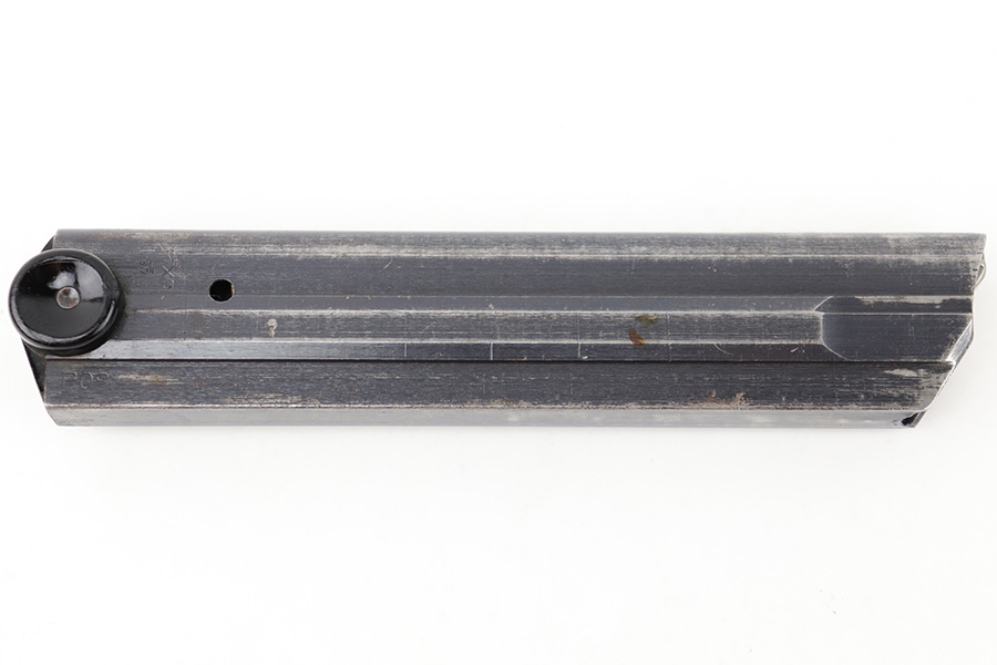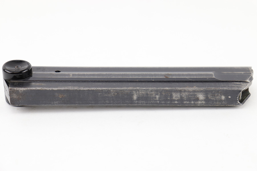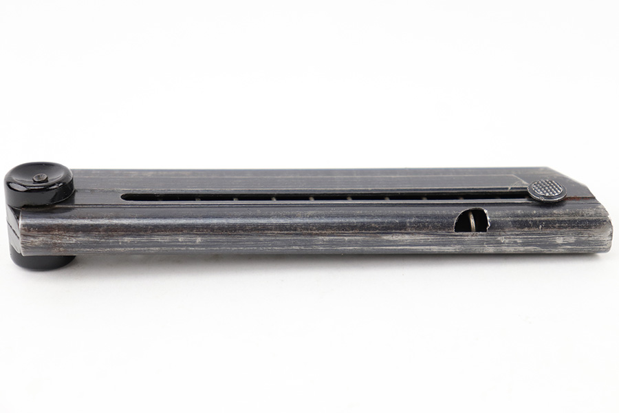 7/5/23 – This is an original WW2 Black Widow Luger magazine. The magazine is “fxo” and “P.08” stamped on the tube with two eagle 37 military proof stamps. The blued tube has light finish loss and surface wear throughout but no rust or pitting. The black bakelite base is unmarked and in great shape. The spring is strong and functional.