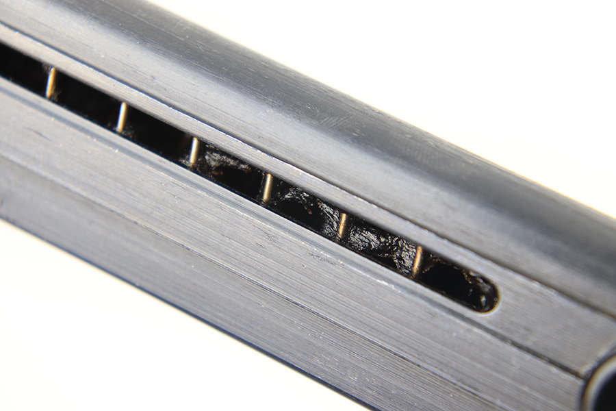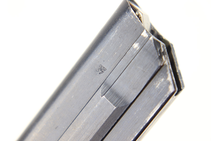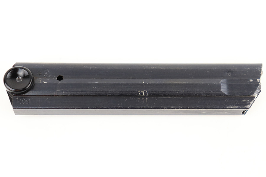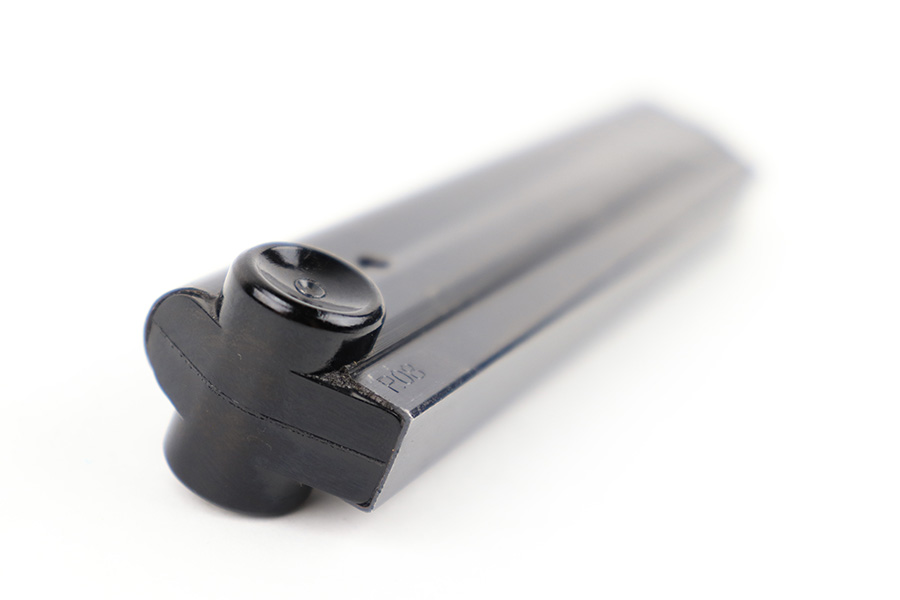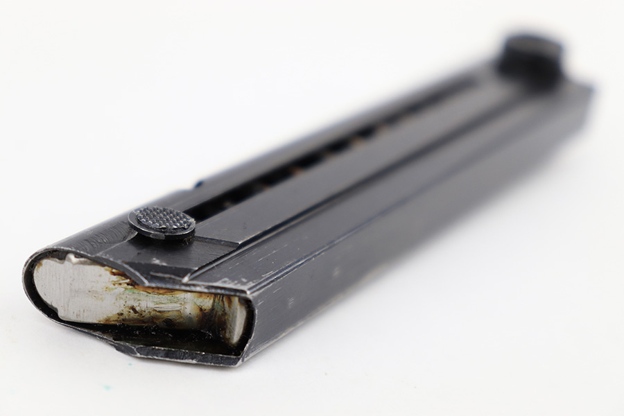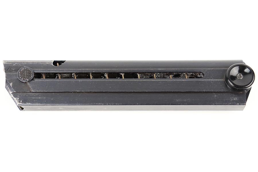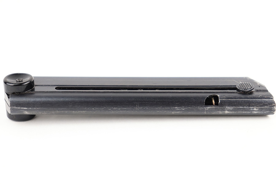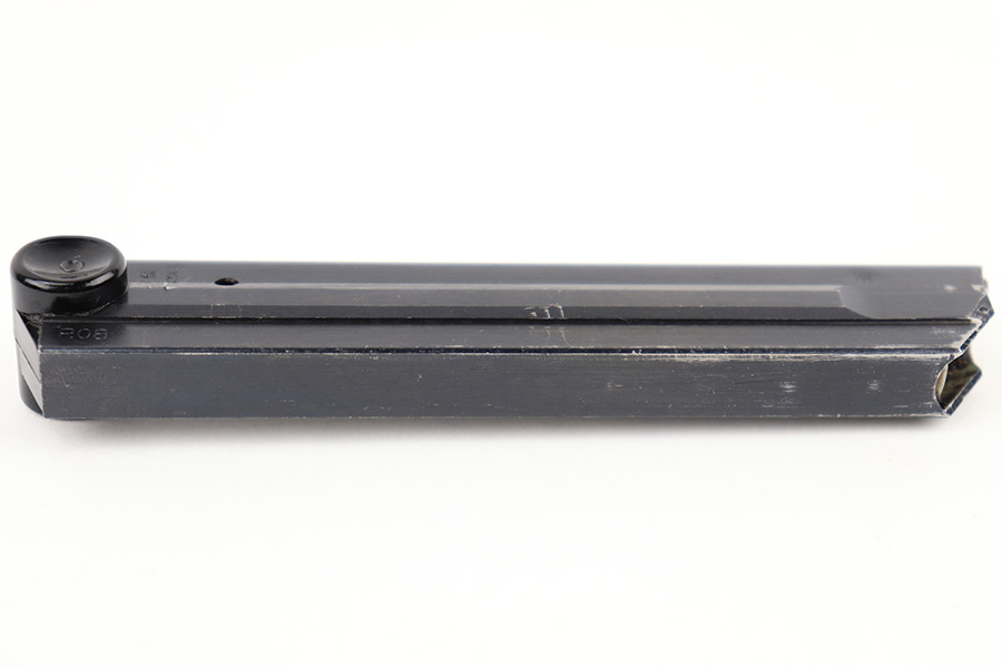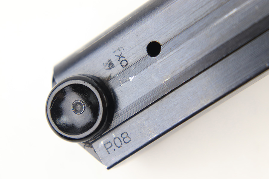 8/4/23 – This is an excellent condition Black Widow Luger magazine from WW2. The magazine has a blued tube and black bakelite base. The base has no cracks or chips and the tube has minimal finish loss. The tube is stamped with two eagle/37 proofs, a P.08 designation stamp, and a “fxo” maker stamp. Functional spring. The only takeaway is some old grease within the tube (this can be cleaned).