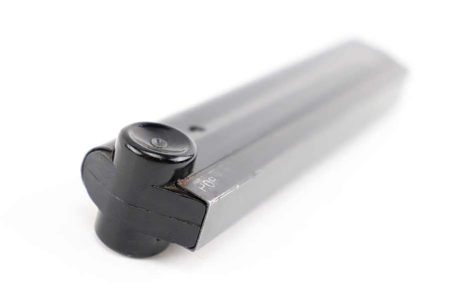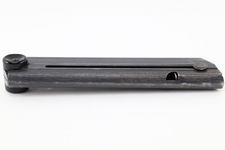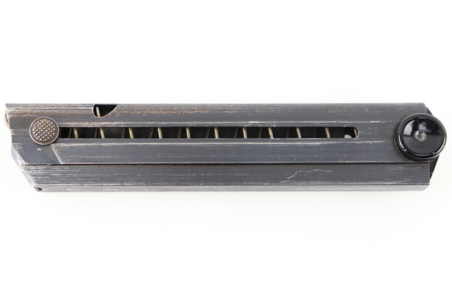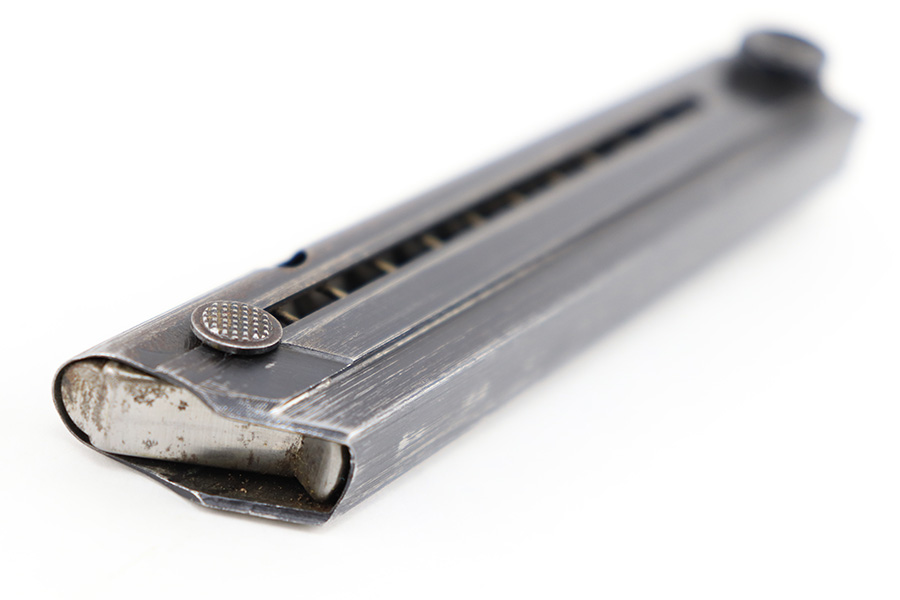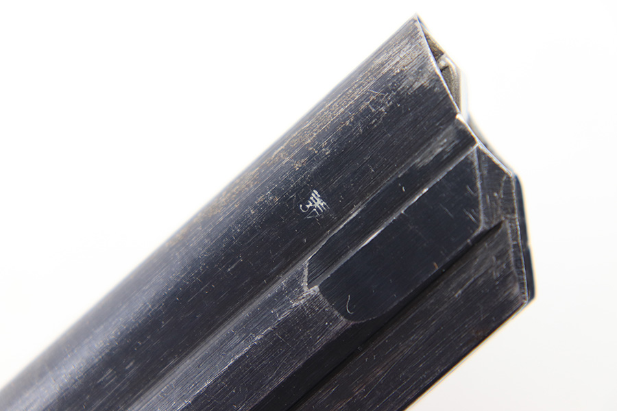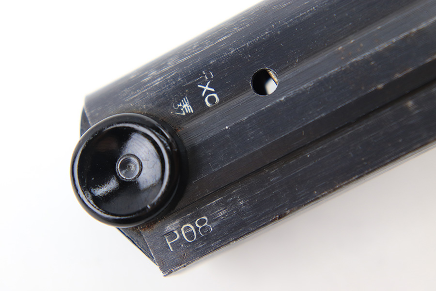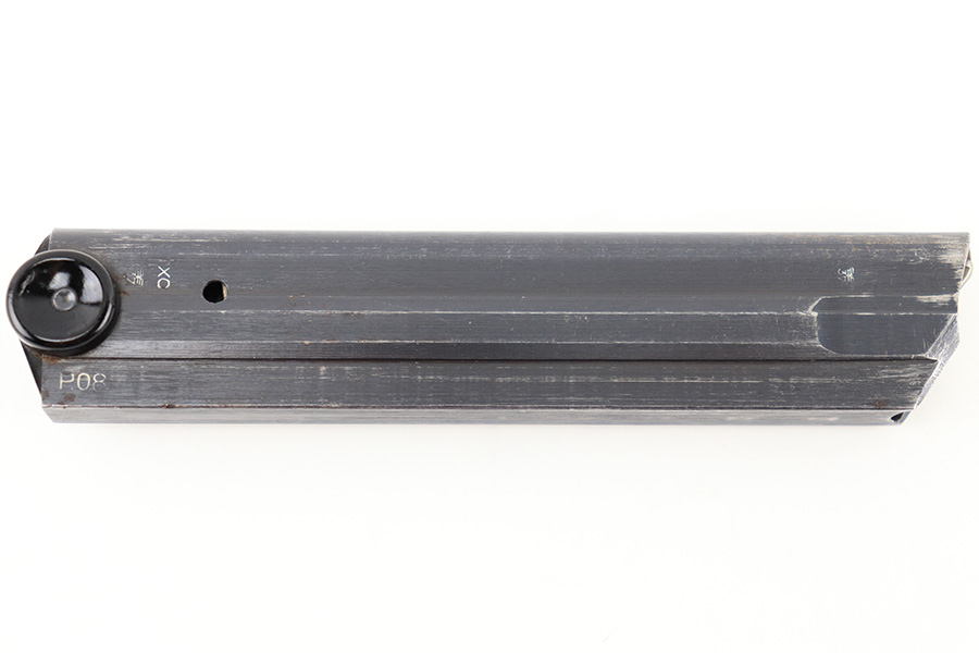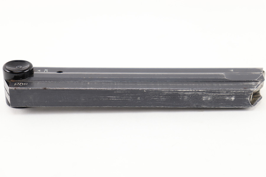 8/18/23 – This is an original WW2 production Black Widow Luger magazine. The magazine is in great overall condition with mild finish loss on the tube, and a black bakelite base. The tube is “fxo” and “P.08” stamped with two eagle 37 proofs. The spring is strong and functional.