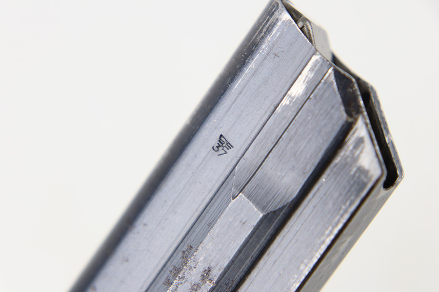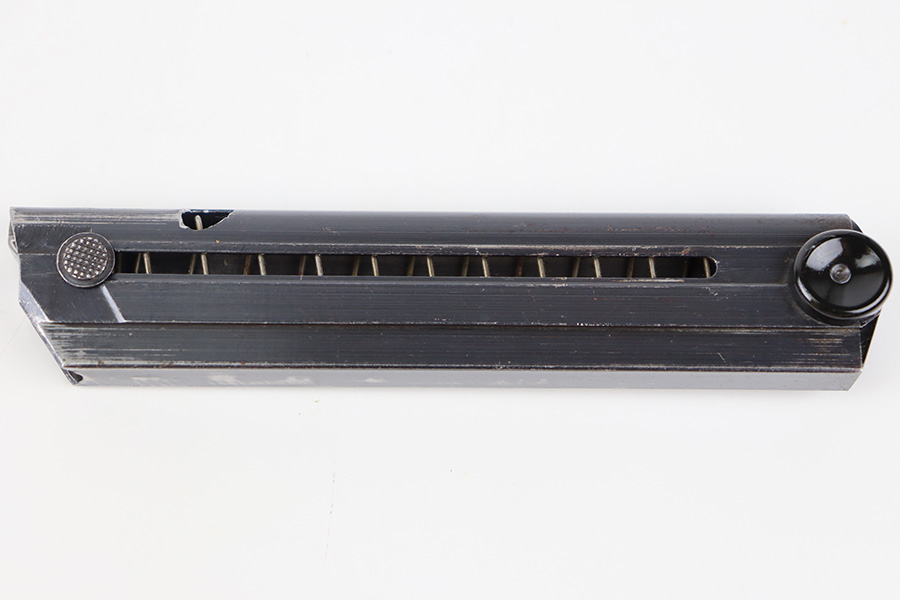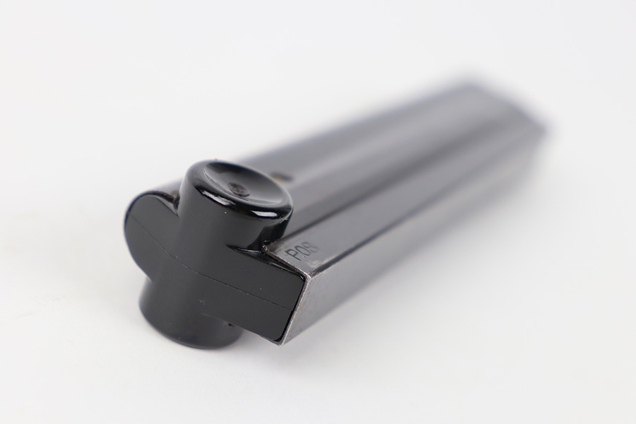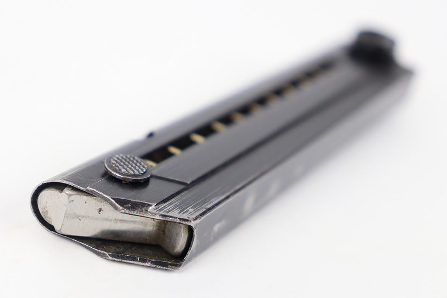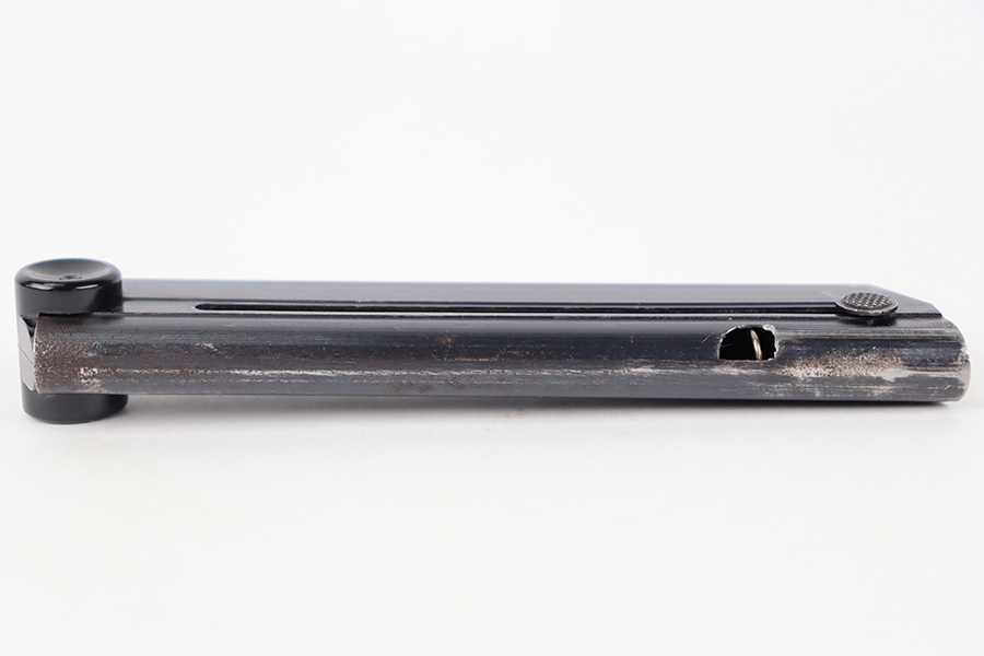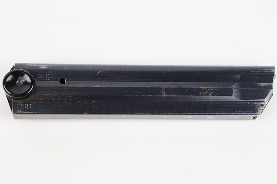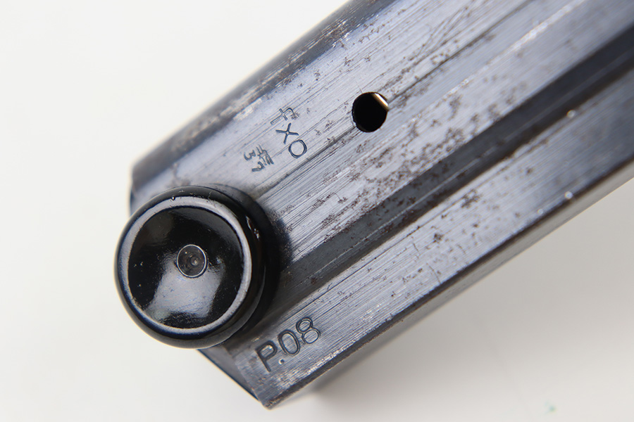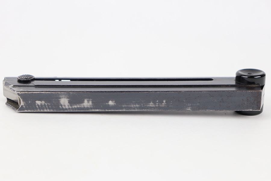 11/14/23 – This is an original WW2 production Black Widow Luger magazine. The magazine has a blued tube and black bakelite base. The base is unmarked and in great shape with no cracks or chips. The tube has some light surface patina, finish loss, and mild discoloration. The left side of the tube is “FXO” stamped, “P.08” stamped, and proof stamped with two eagle/37 military proofs. Strong, functional spring.