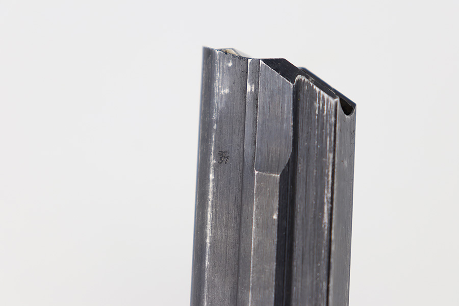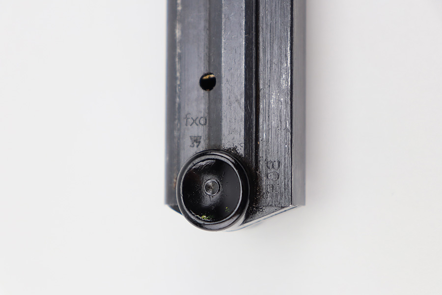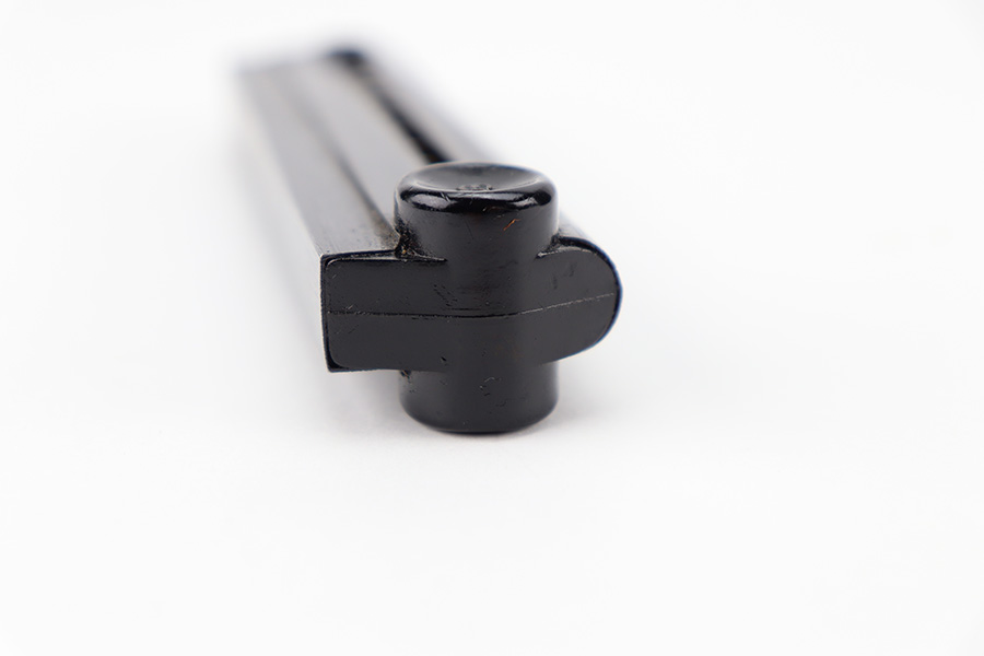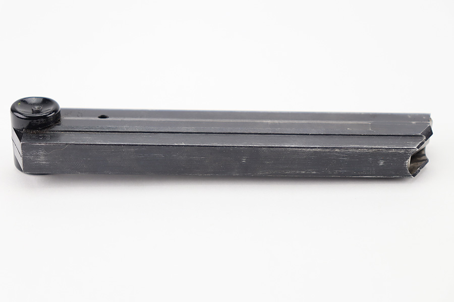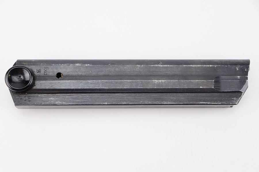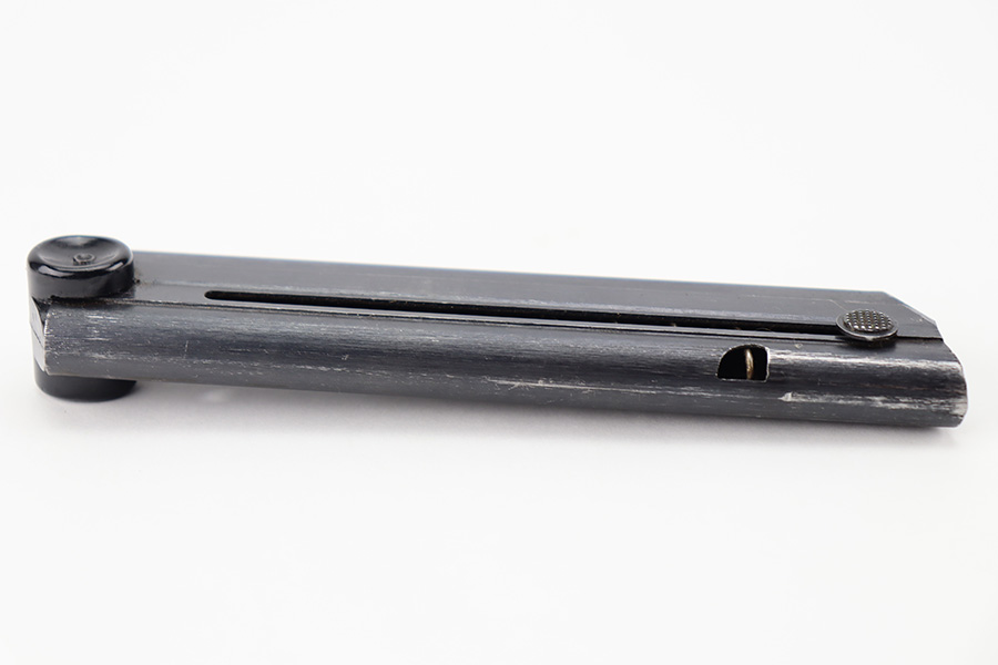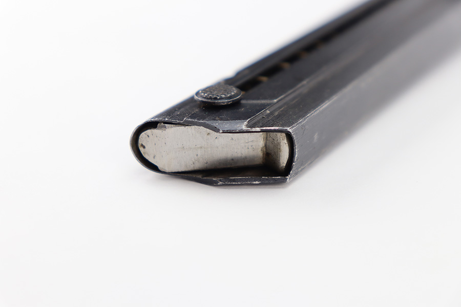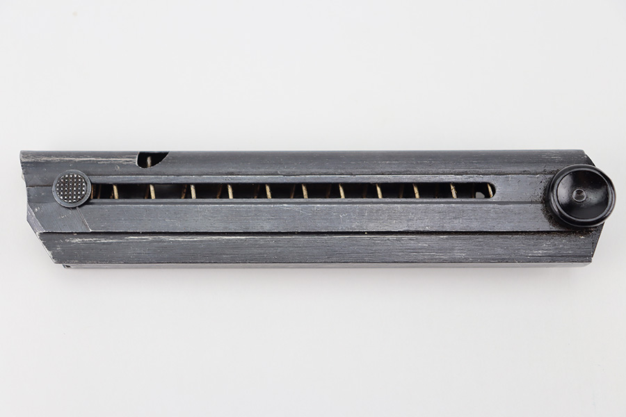 11/16/23 – This is an original Black Widow Luger magazine from WW2. The magazine has a blued tube in excellent condition with minimal finish loss. The left side of the tube has two eagle/37 proof stamps, a “fxo” maker code, and “P.08” designation stamp. The black bakelite base has no markings or stamps and is completely intact. Strong, functional spring.