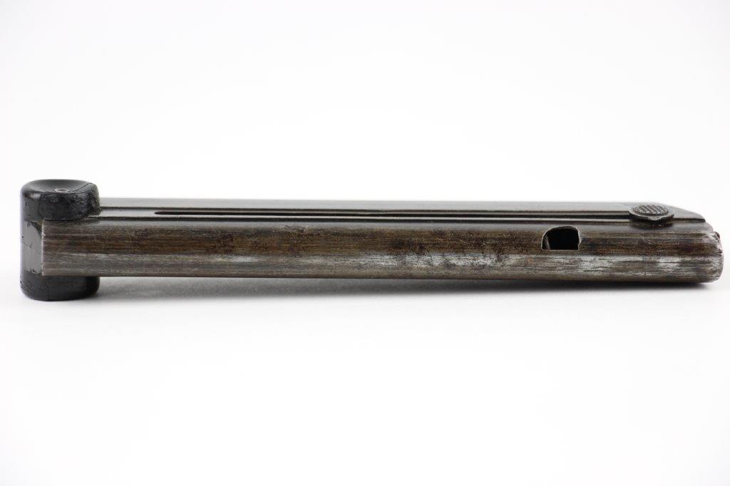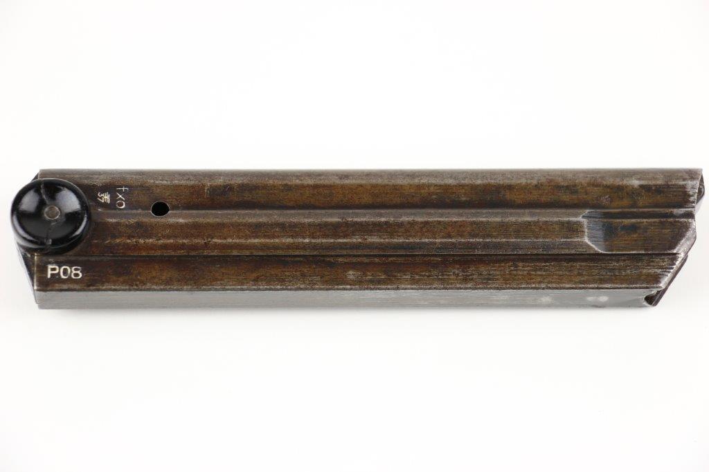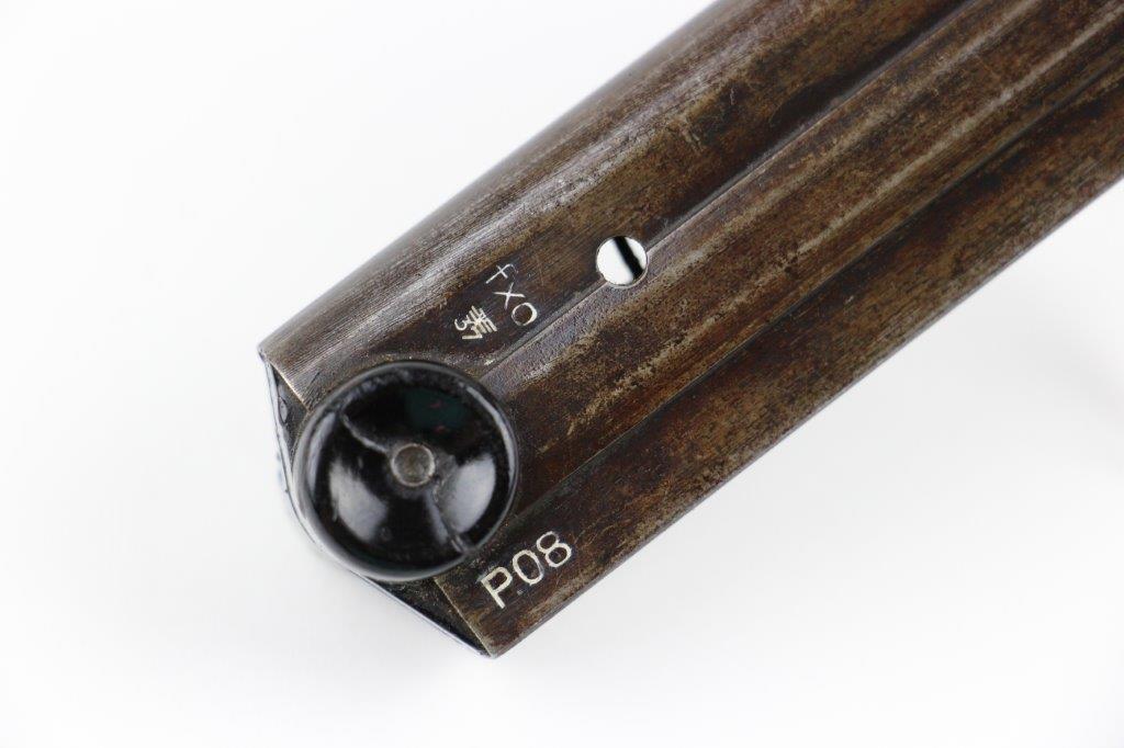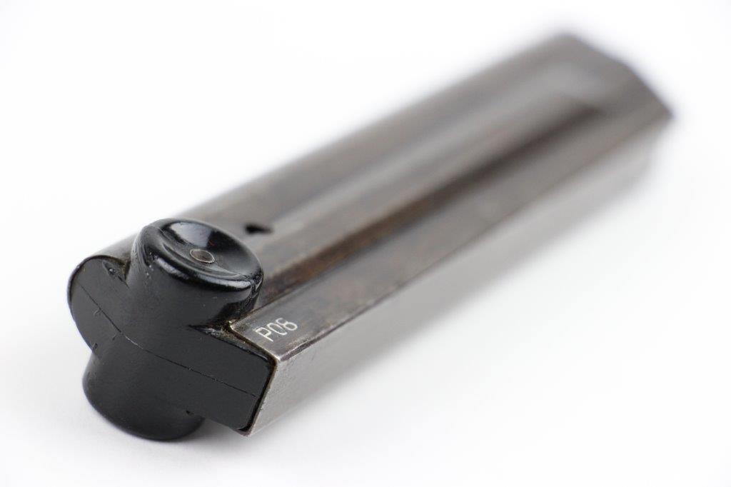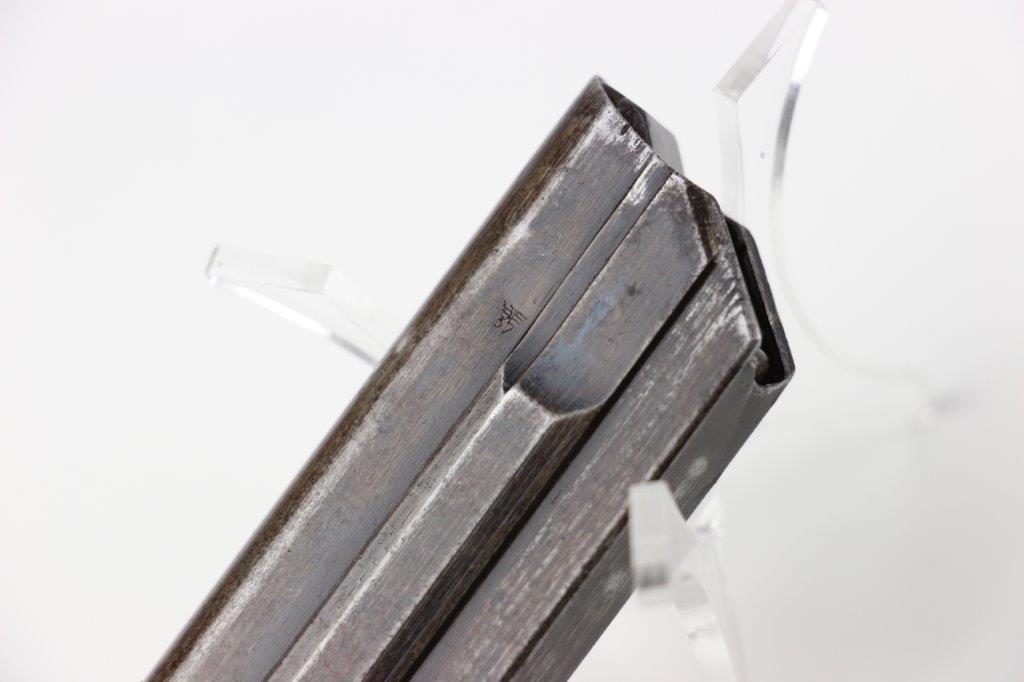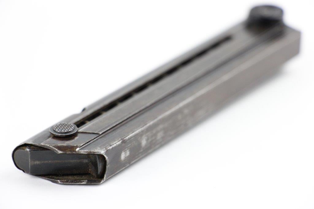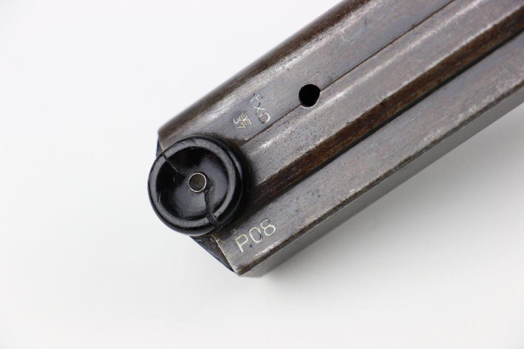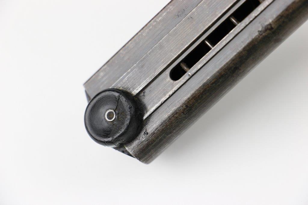 6/9/24 – This is an original WW2 Black Widow Luger magazine. The magazine is all original with two eagle/37 military proofs, and “fxo” maker code on the tube. There’s dark patina throughout the tube but no rust or pitting. The base has a crack on each side, or “ear” but is still completely intact. Strong, fully functional spring.