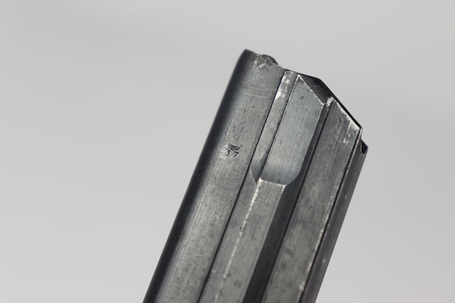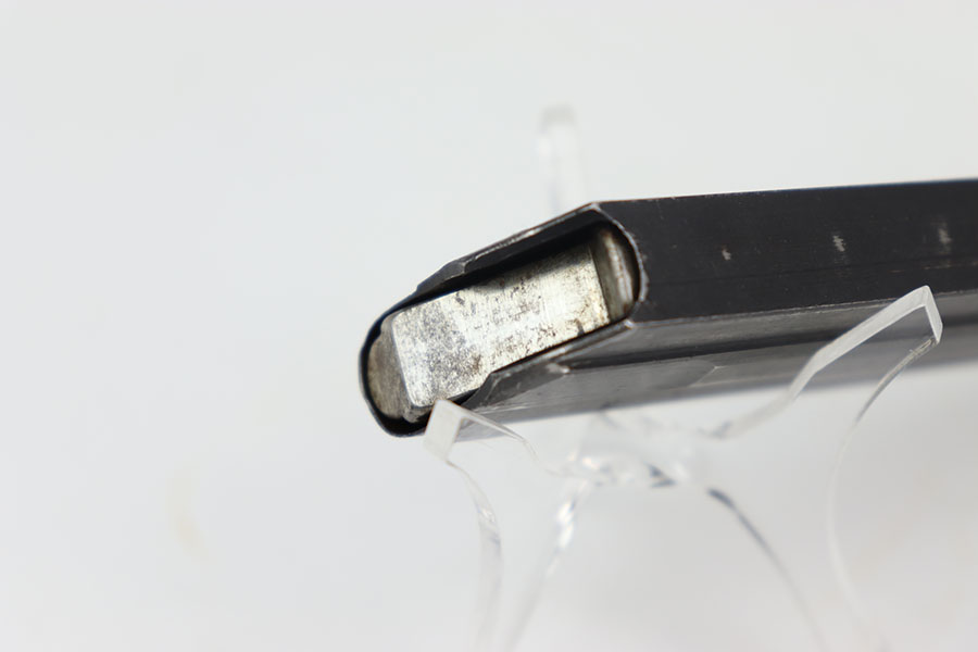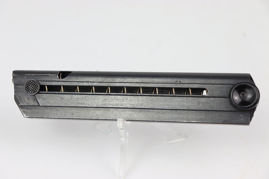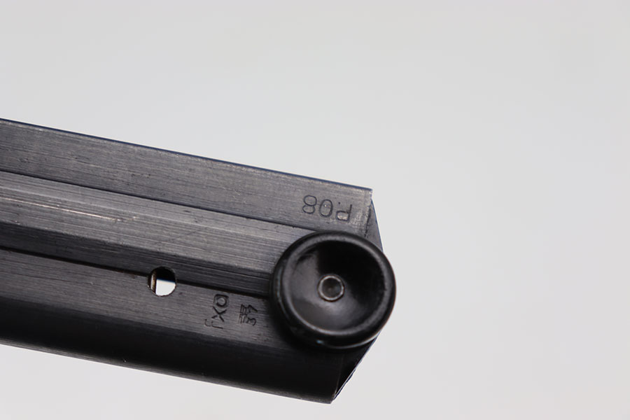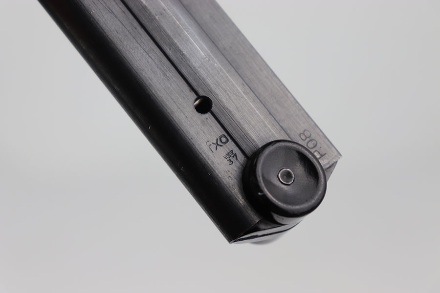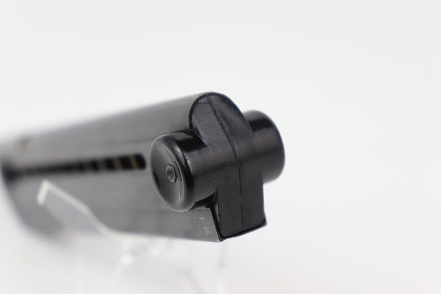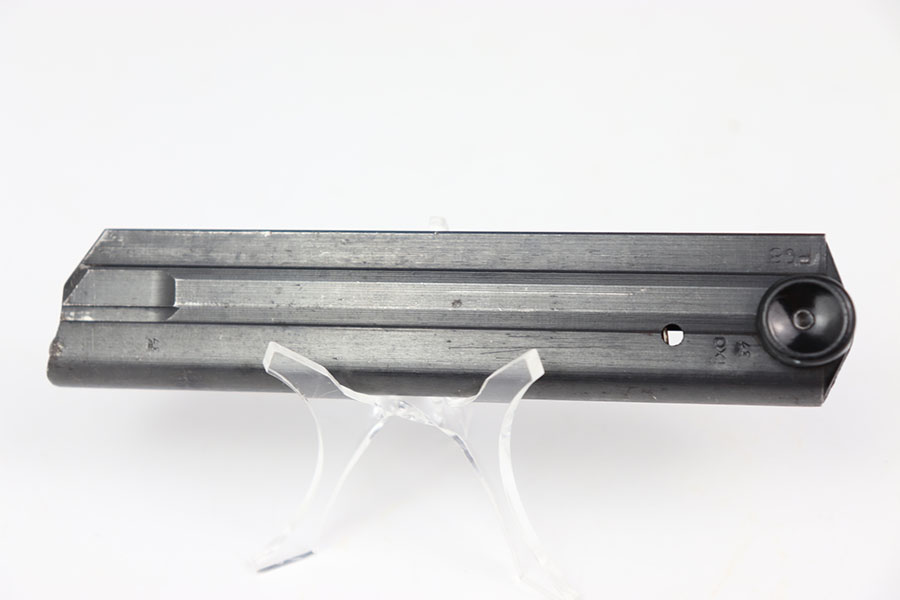 7/15/24 – This is an original WW2 FXO Luger magazine with a black bakelite base. These are commonly paired with and referred to as Black Widow Luger magazines. The magazine is in excellent condition with only a few minor spots of wear. The left side of the tube is “fxo” maker stamped by Haenel with two eagle/37 proof stamps. The base is very clean with no cracks, chips, or markings. The spring is strong and fully functional.