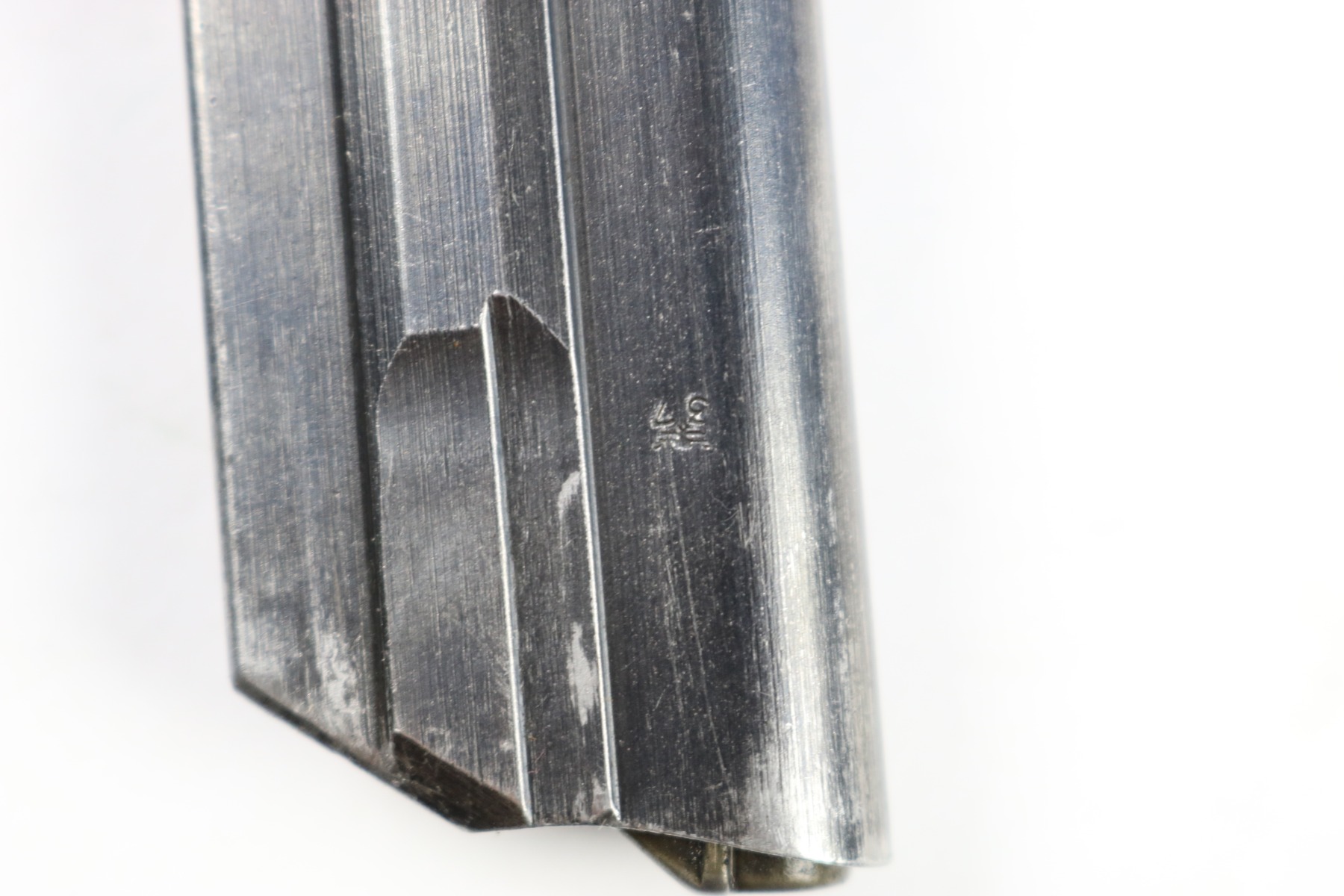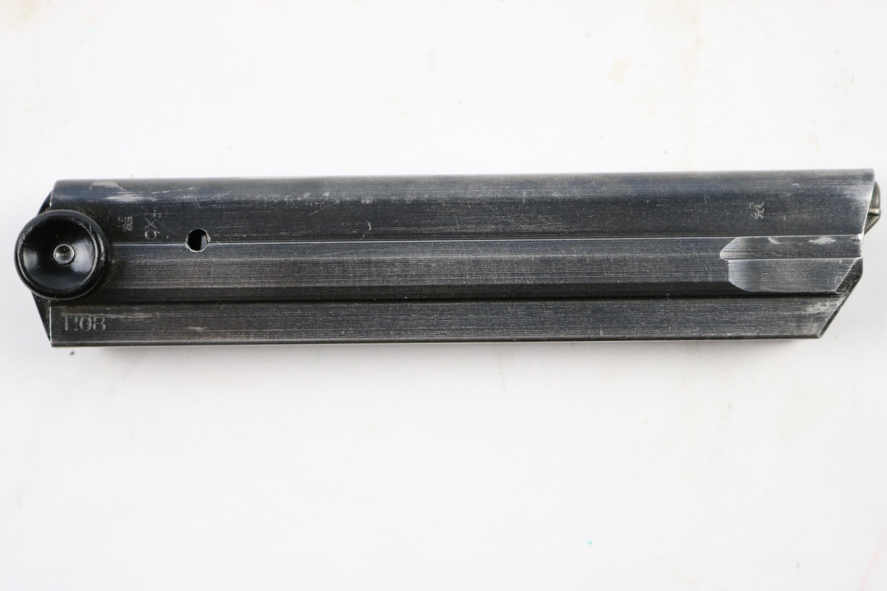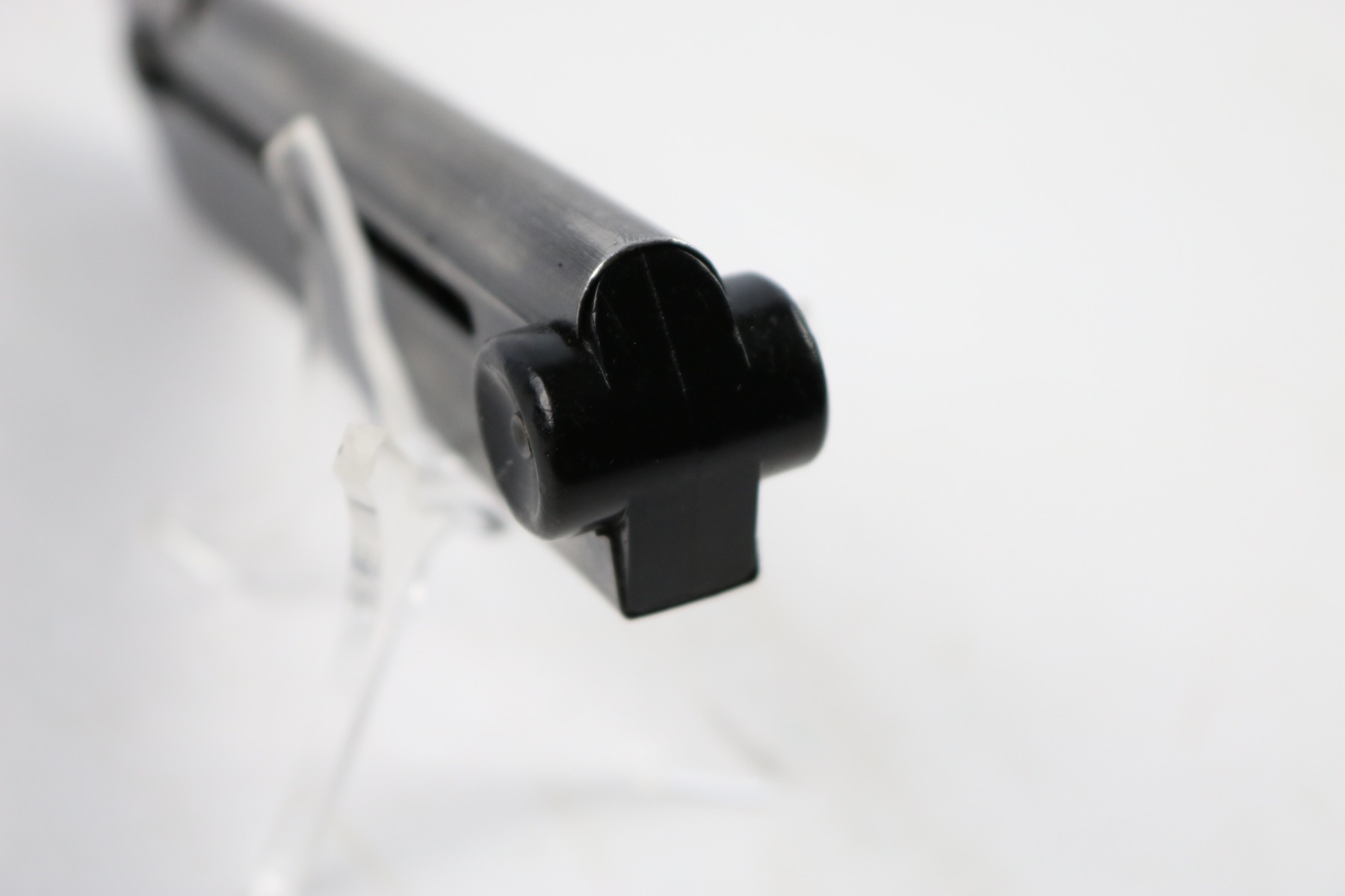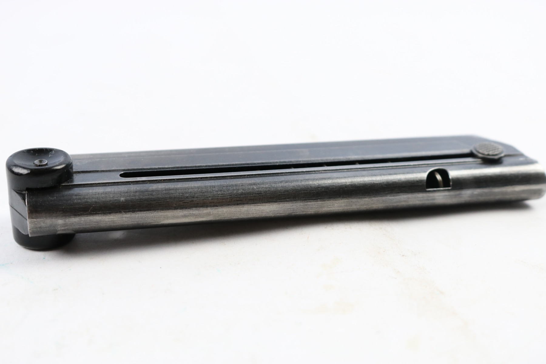 5/29/18 – This is an original WW2 production Black Widow Luger magazine. There’s some normal bluing loss / age wear on the frame, but no rust or pitting. Properly eagle/37 proof stamped with an “FXO” and “P.08” stamp on the frame. The black base is original bakelite in excellent condition. Guaranteed original and functional.