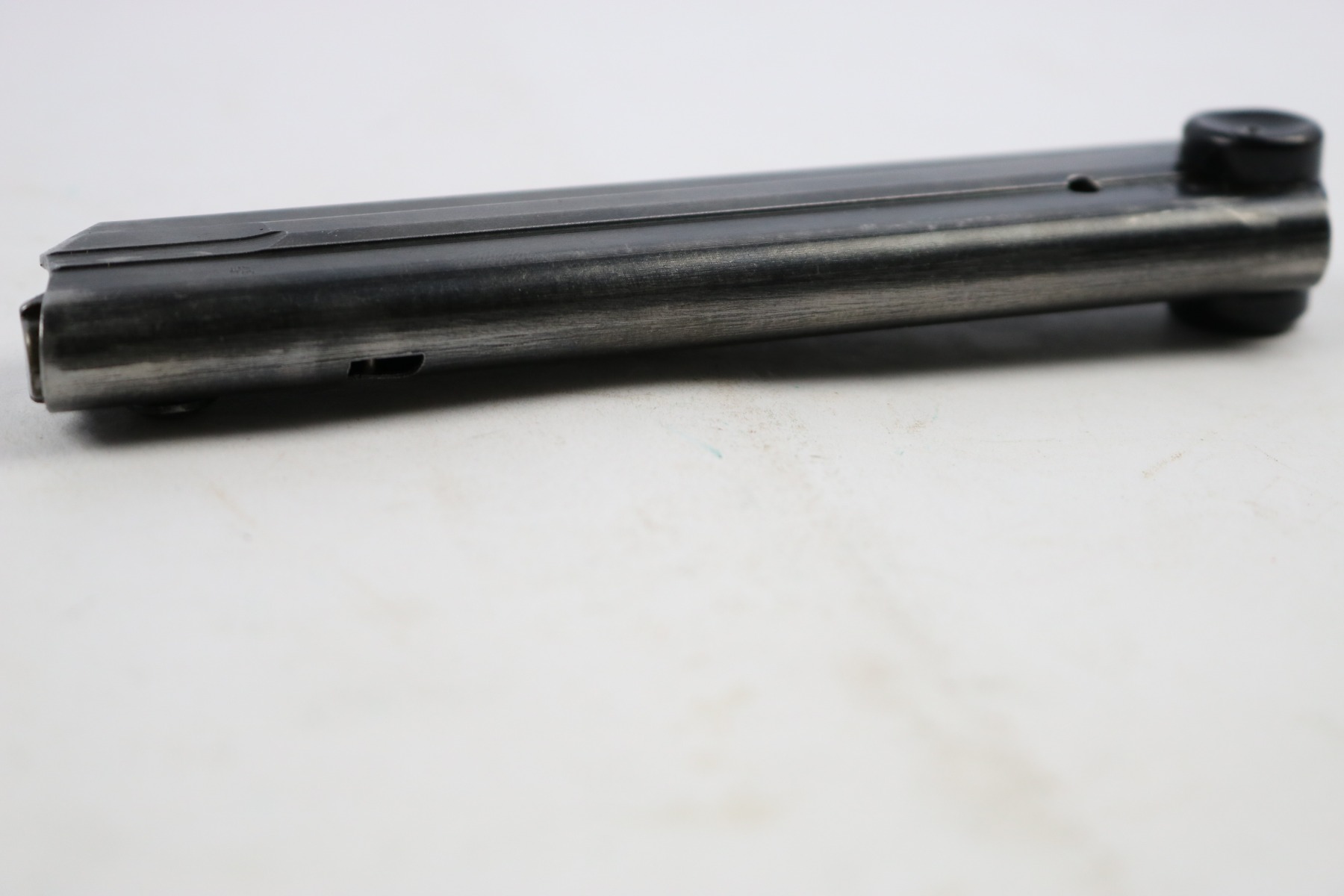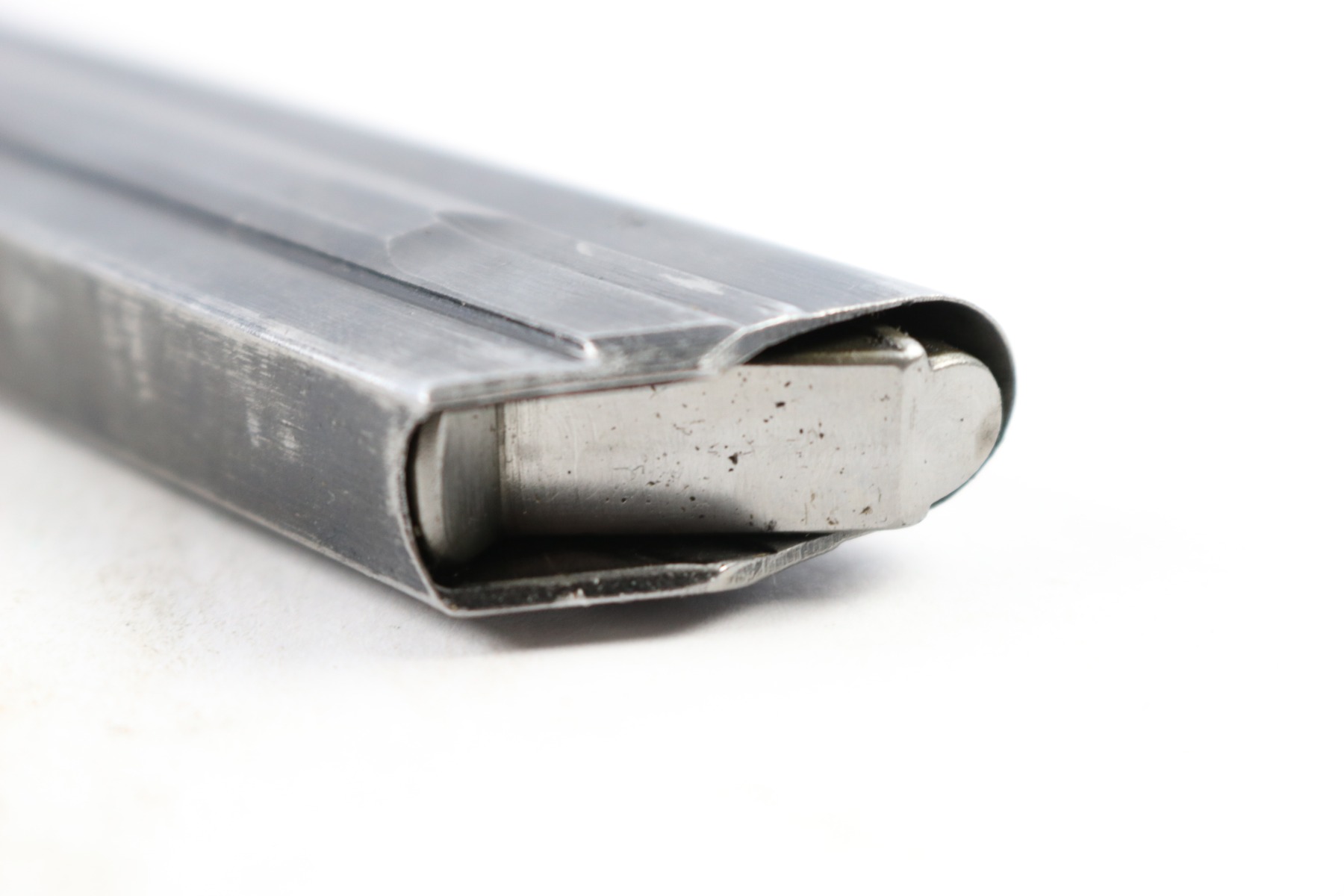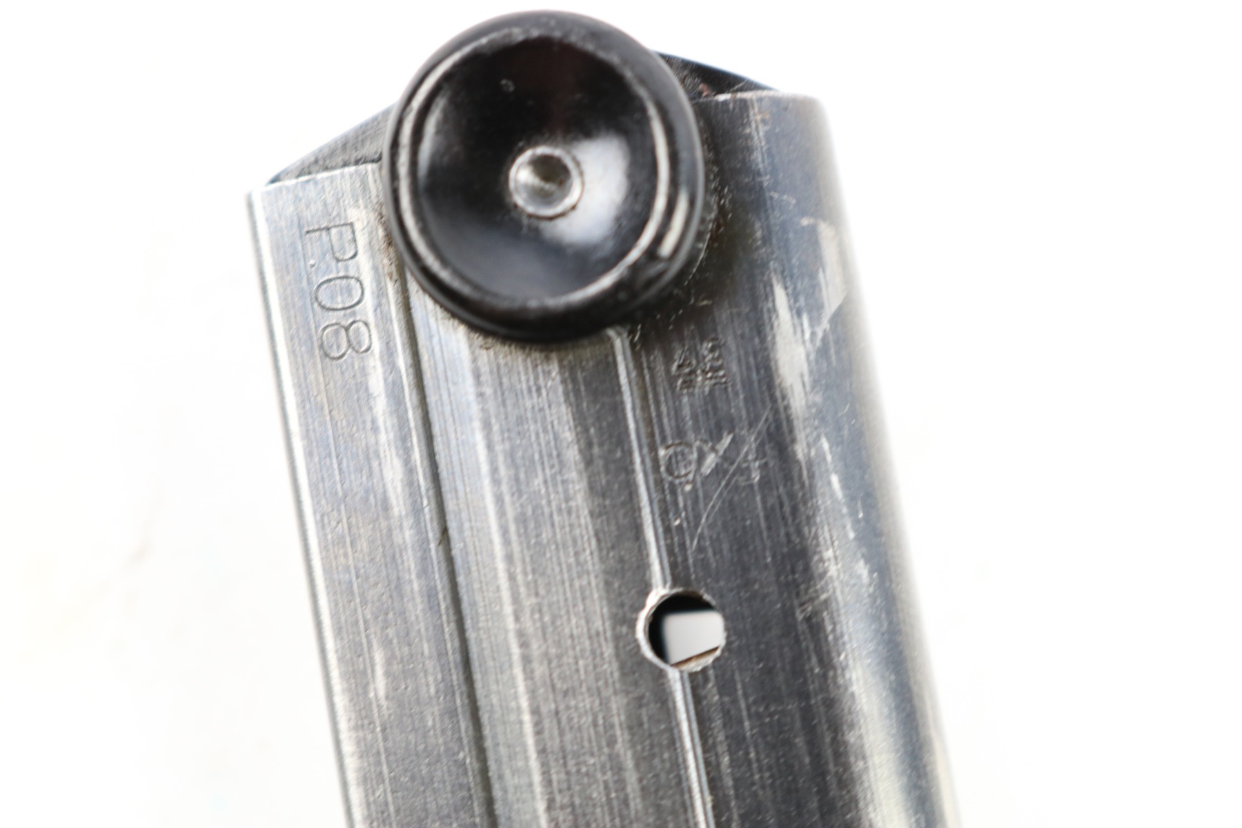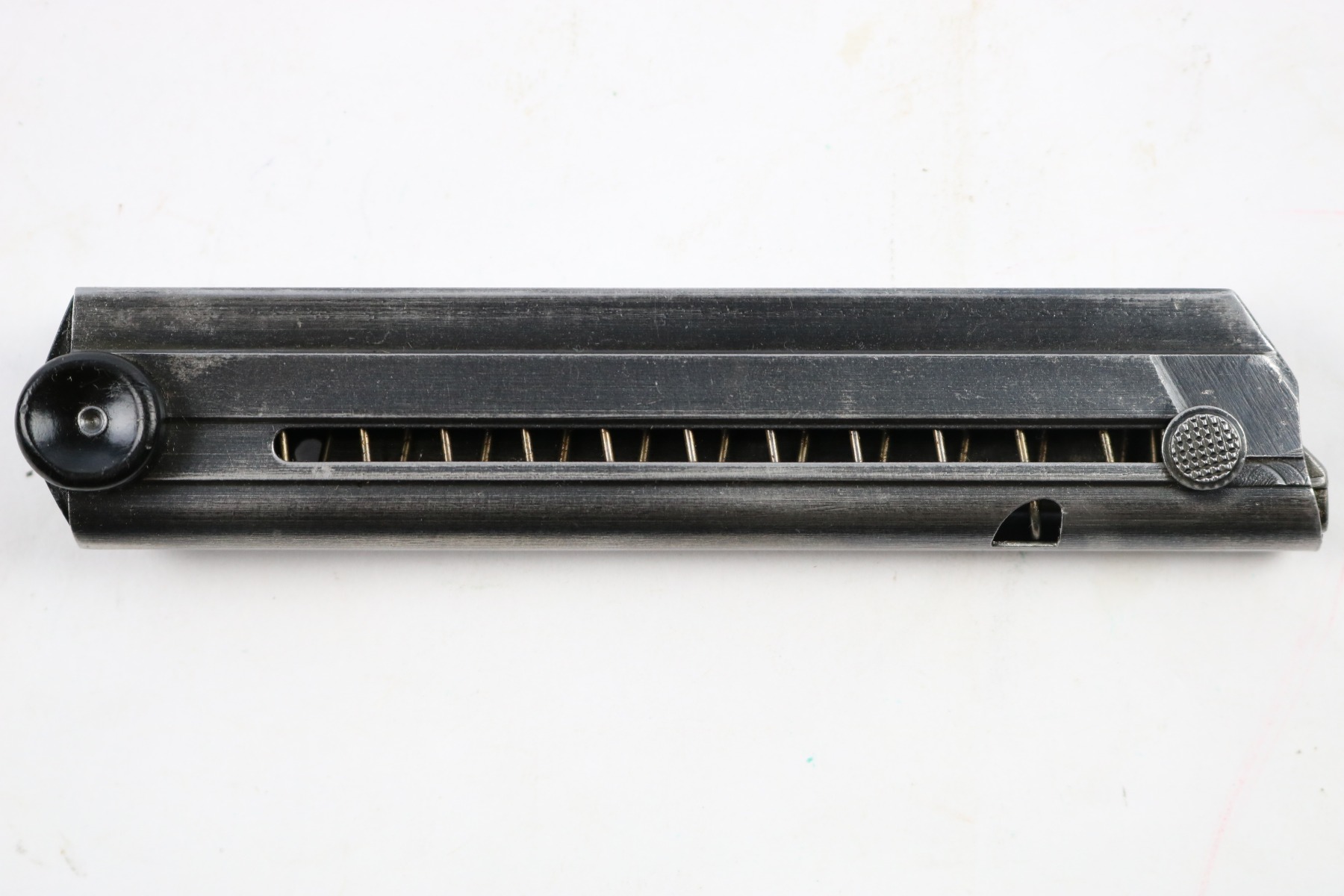 5/29/18 – This is an original WW2 production Black Widow Luger magazine. There’s some normal bluing loss / age wear on the frame, but no rust or pitting. Properly eagle/37 proof stamped with an “FXO” and “P.08” stamp on the frame. The black base is original bakelite in excellent condition. Guaranteed original and functional.