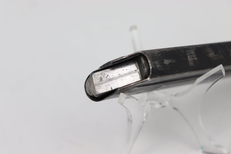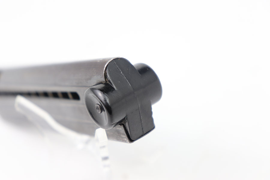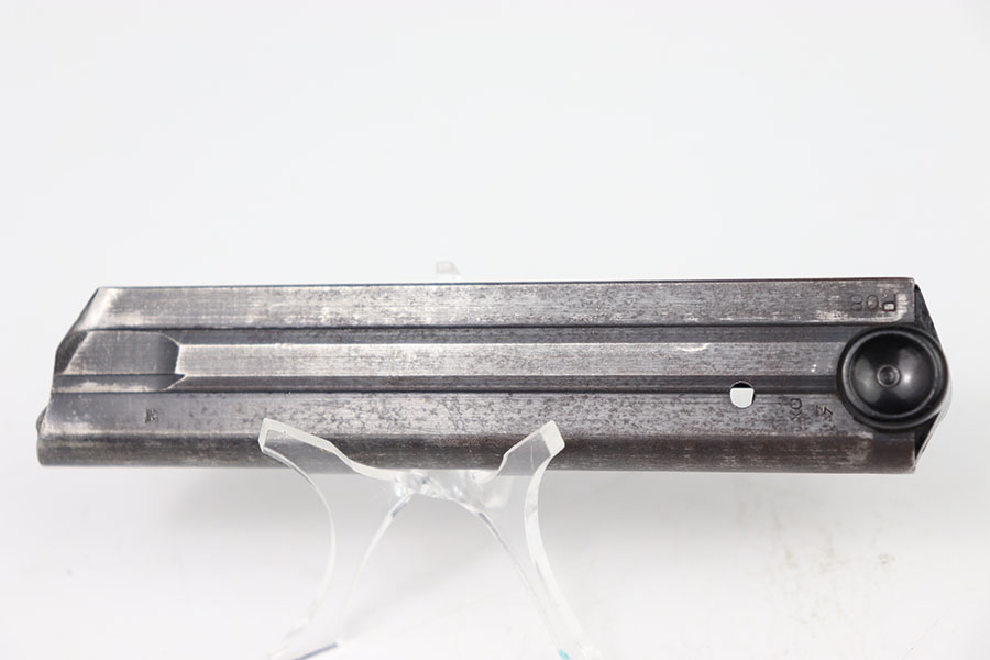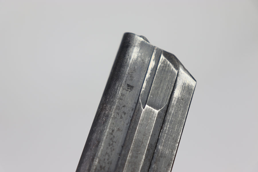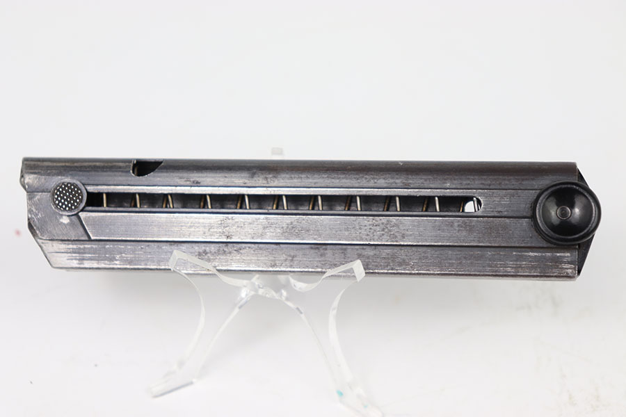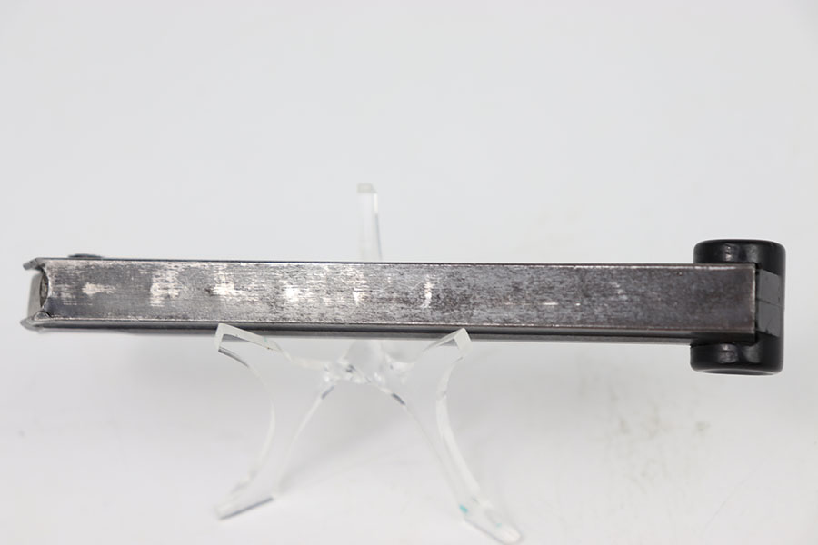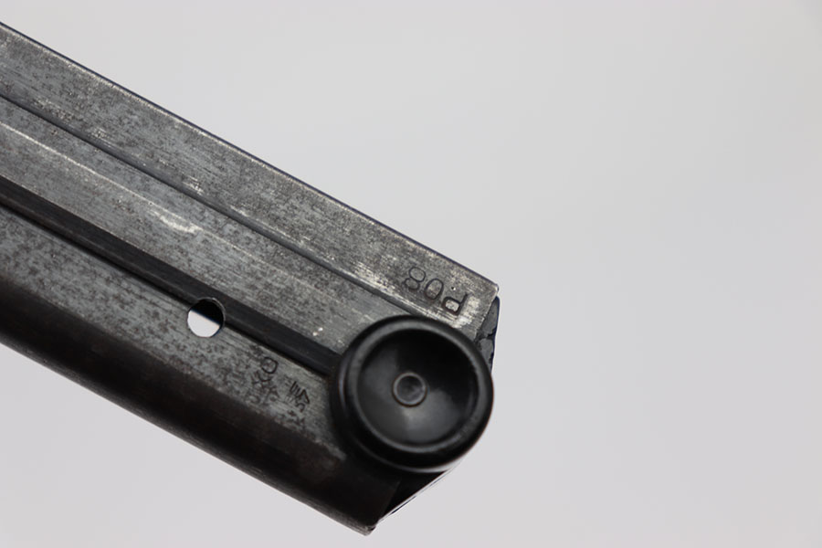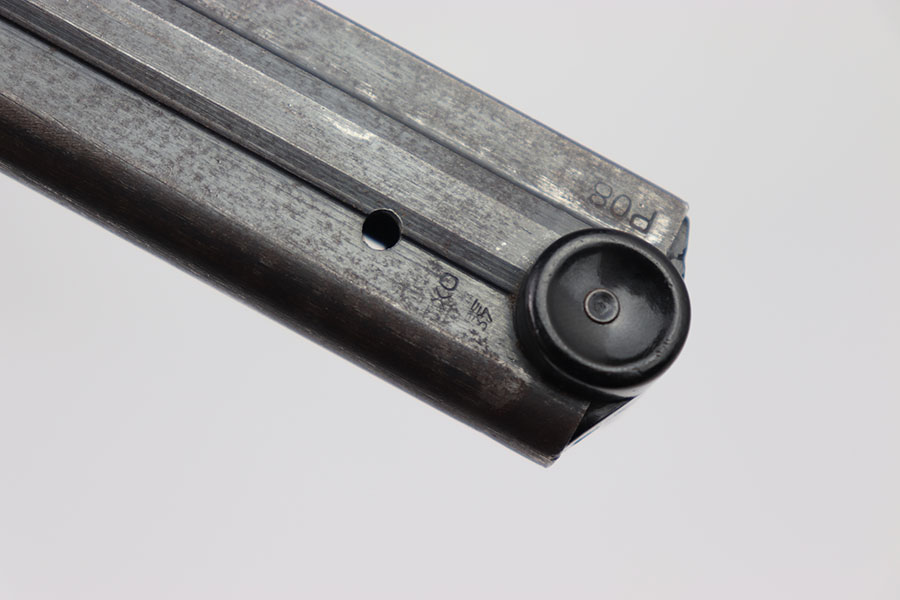 7/17/24 – This is an original WW2 FXO Luger magazine with a black bakelite base. These are commonly paired with and referred to as Black Widow Luger magazines. The magazine is in good+ condition with Some patina throughout and some spots of wear. The left side of the tube is “fxo” maker stamped by Haenel with two eagle/37 proof stamps. The base a minor chip on the left side but still in great condition. The spring is strong and fully functional.