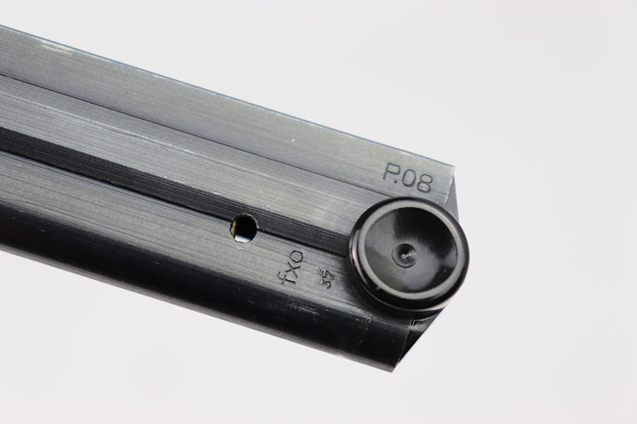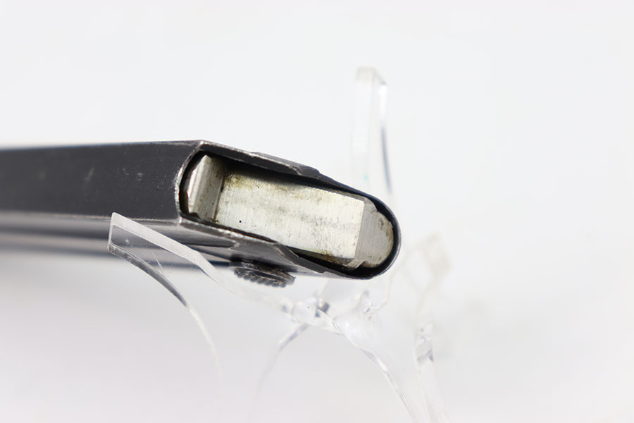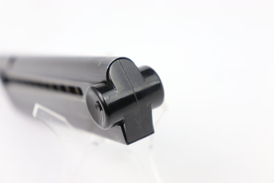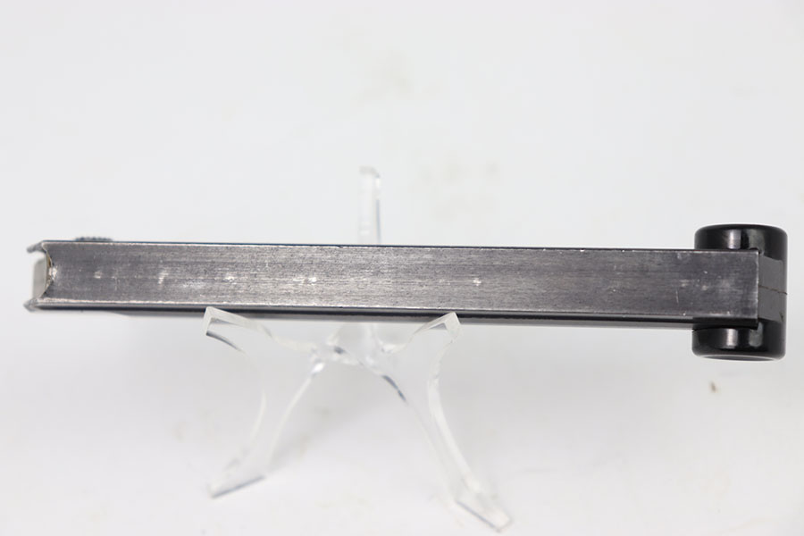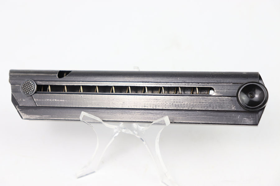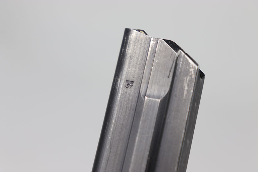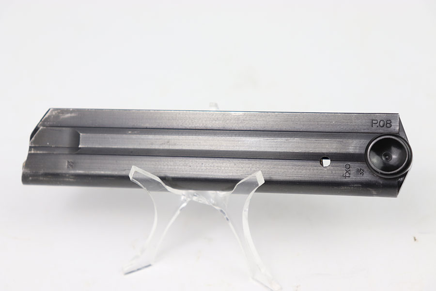 8/2/24 – This is an original WW2 FXO Luger magazine with a black bakelite base. These are commonly paired with and referred to as Black Widow Luger magazines. The magazine is in excellent condition with only a few minor spots of wear. The left side of the tube is “fxo” maker stamped by Haenel with two eagle/37 proof stamps. The base is very clean with no cracks, chips, or markings. The spring is strong and fully functional.