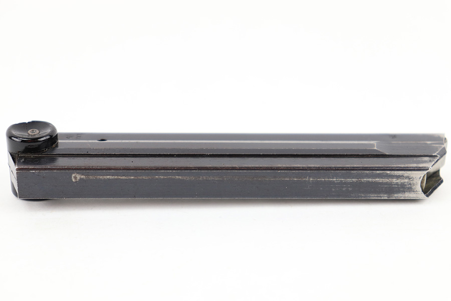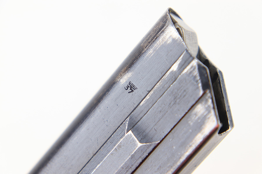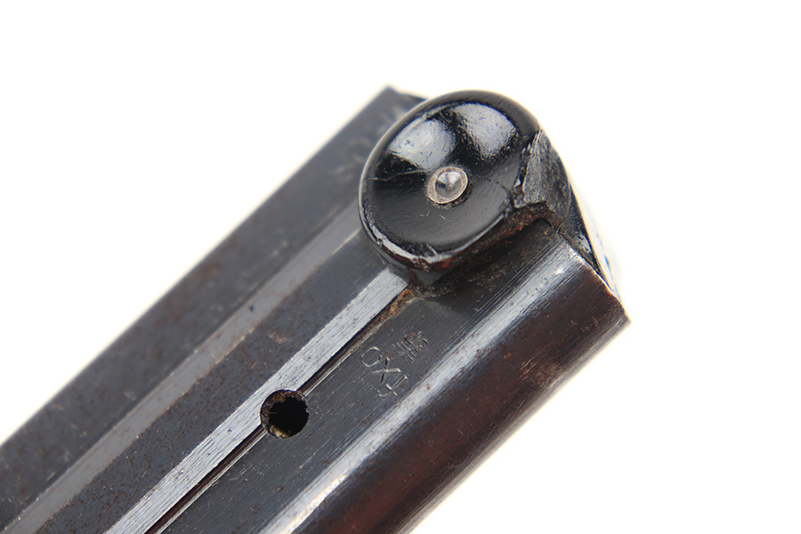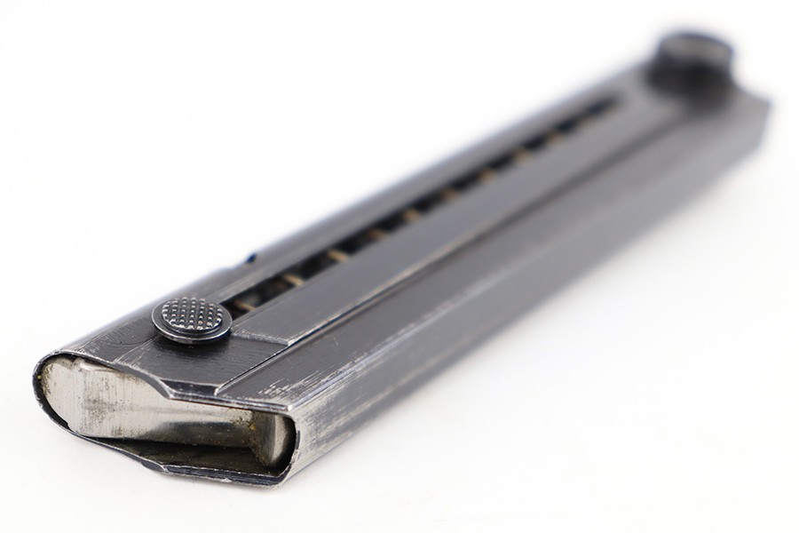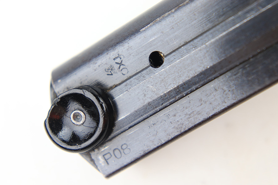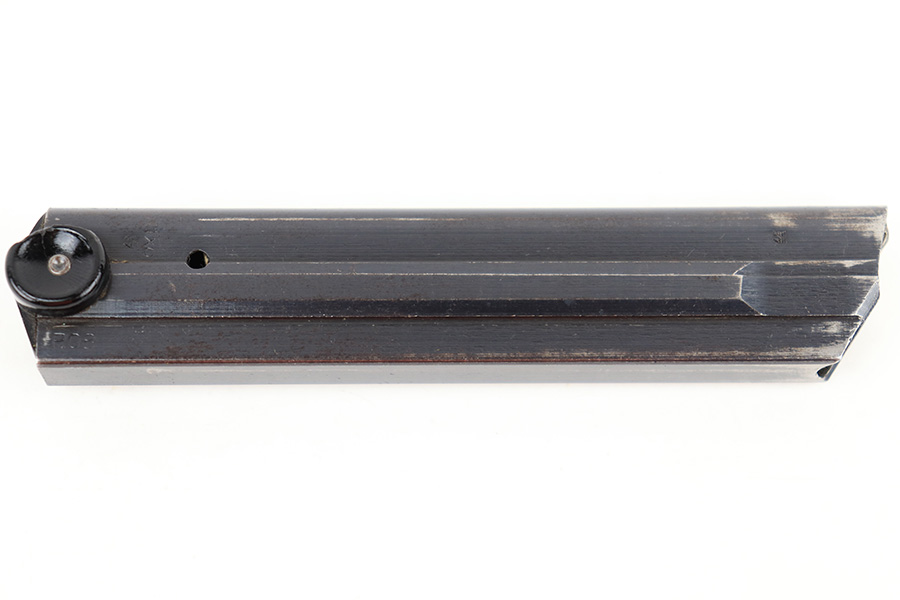 7/25/23 – This is an original Black Widow Mauser Luger magazine from WW2. The magazine tube is blued and in great condition with minimal finish loss and no rust or pitting. The right side of the tube is “fxo” and “P.08” stamped with two eagle/37 military proof stamps. The base is chipped on the left “ear” but is otherwise intact and without issue. This chip doesn’t affect functionality, and the spring is strong and functional.