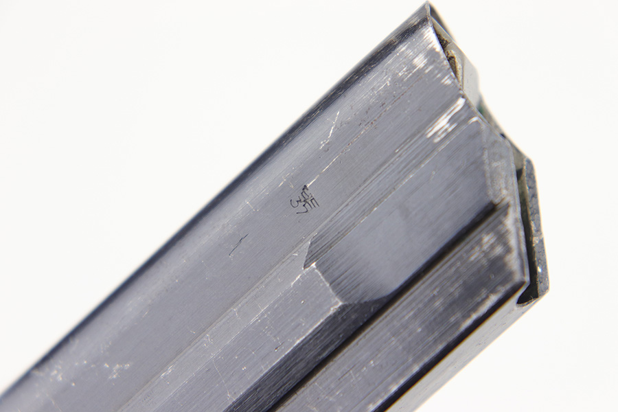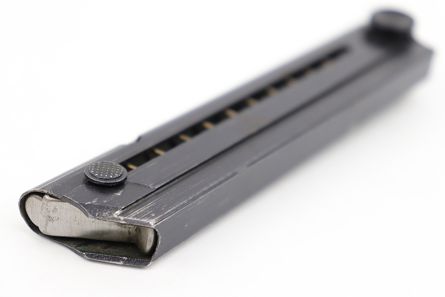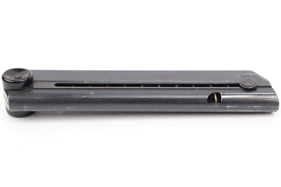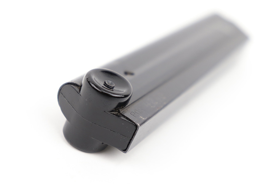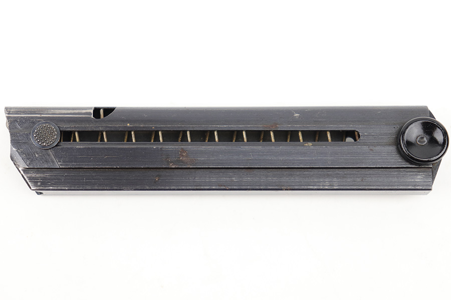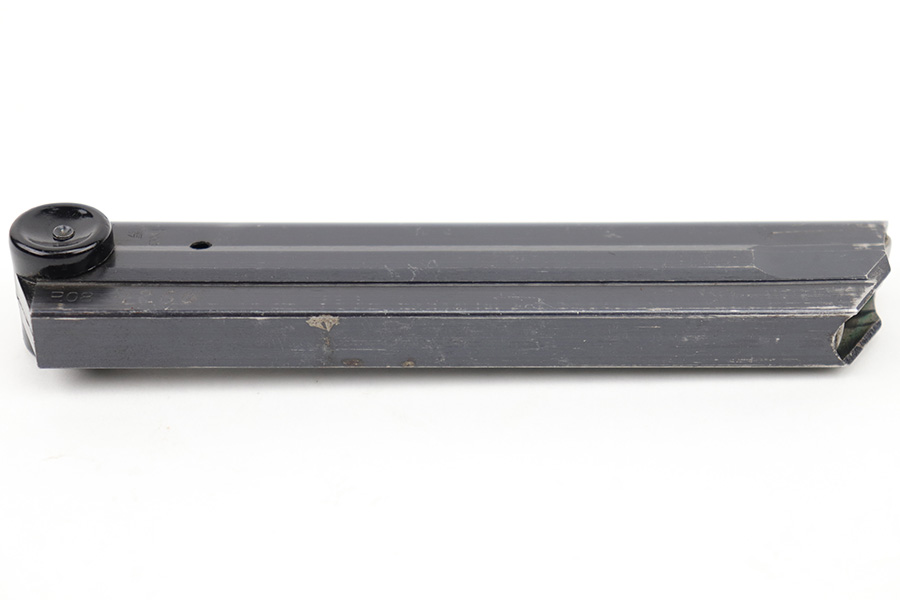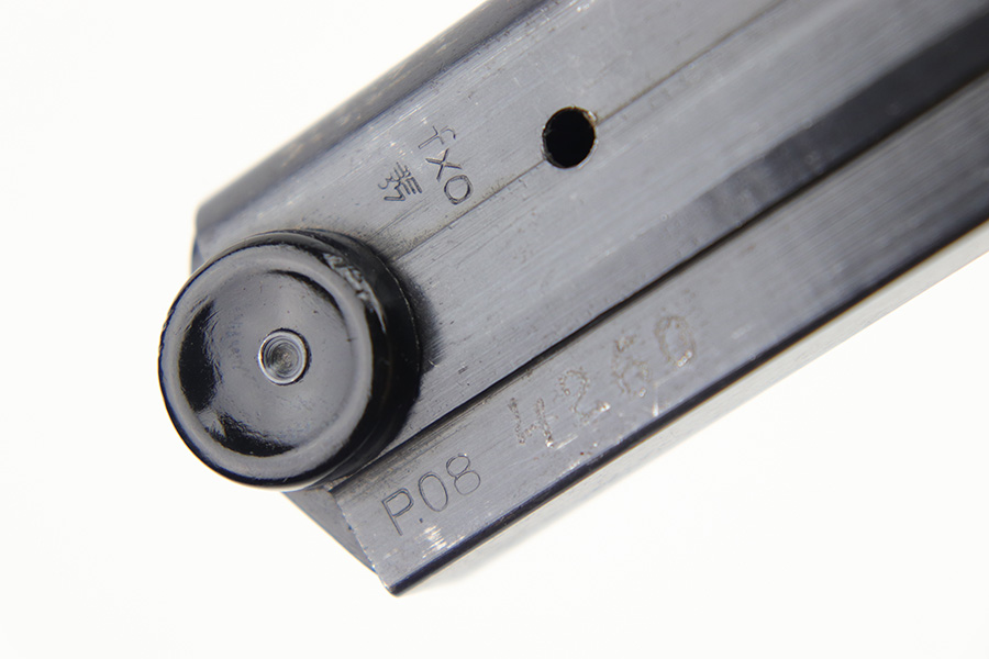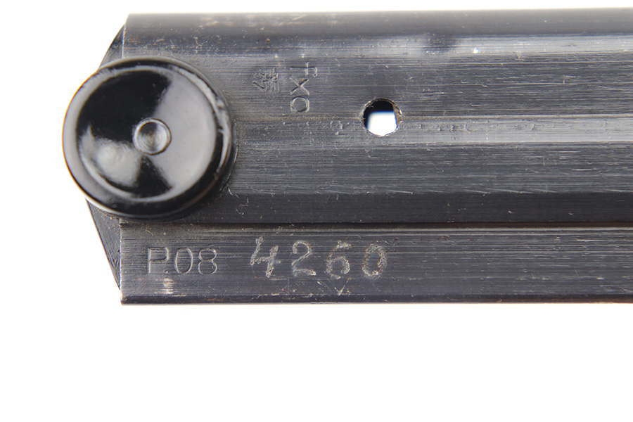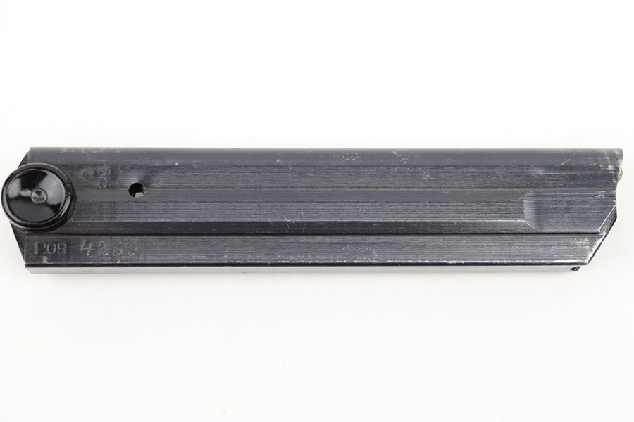 4/12/23 – This is an original WW2 production Black Widow Luger magazine. The magazine is in excellent condition with a blued tube and black bakelite base. The only drawback on this example is an added serial number 4260, etched on the side of the tube next to the P.08 stamp. The tube is also stamped with two eagle 37 proofs. Strong, functional spring.