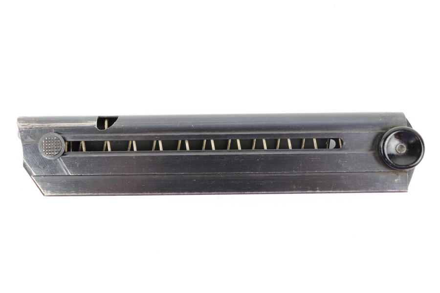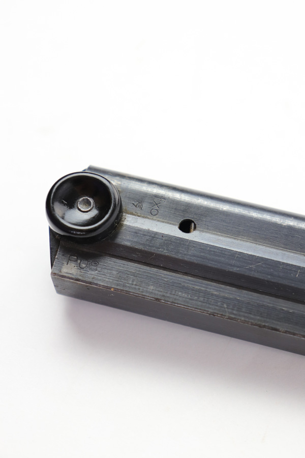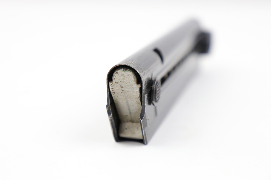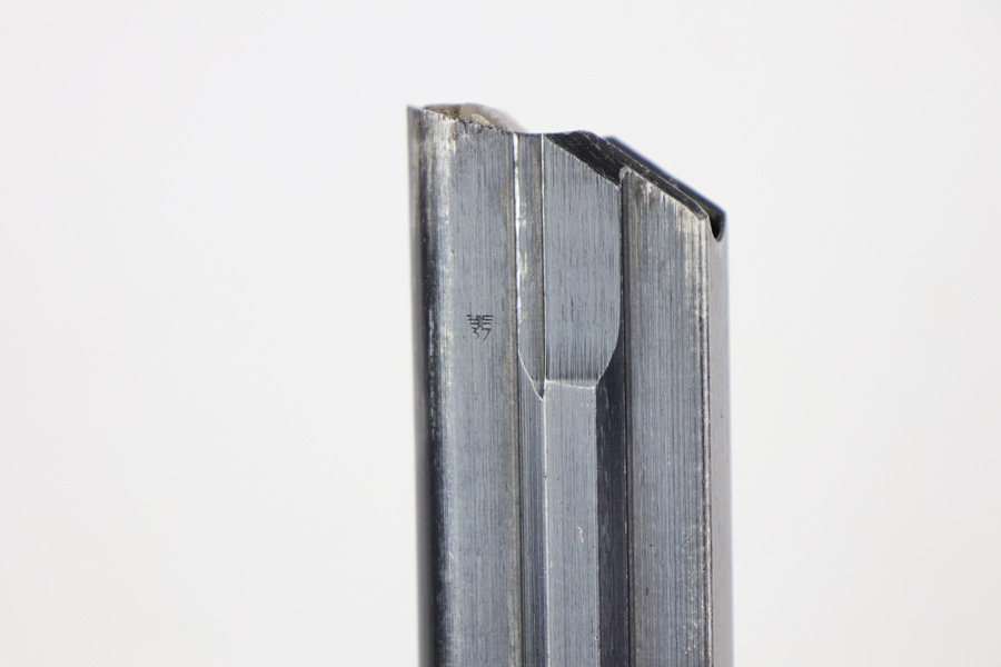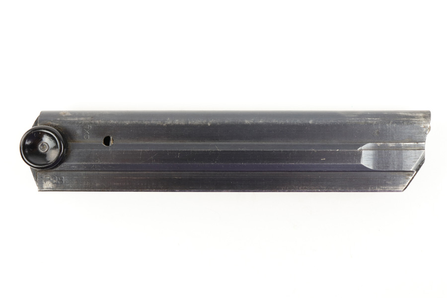 5/28/19 – This is an original “black widow” luger magazine from WWII. The magazine is in excellent condition with no rust or pitting. The frame is stamped with two eagle/37 proofs and “FXO” as well as “P.08” on one side. Black bakelite base has no cracks or chips. Strong, fully functional spring. No rust or pitting.