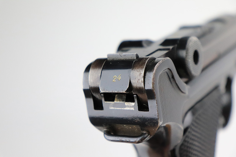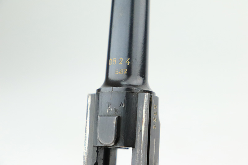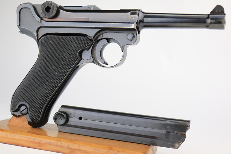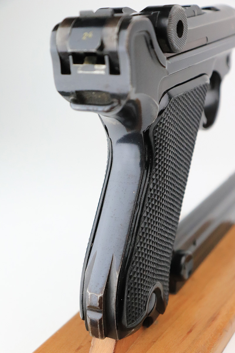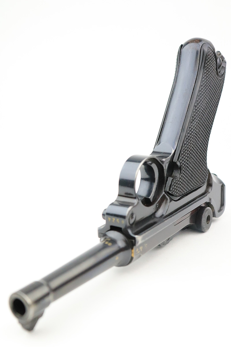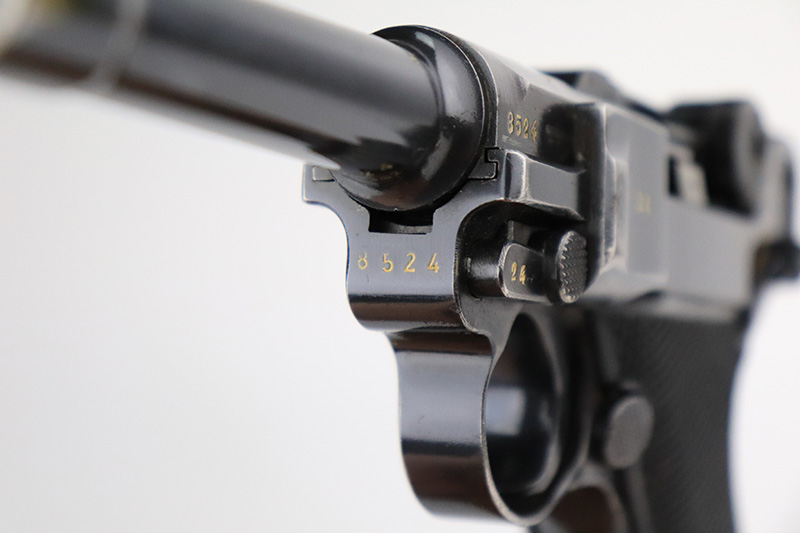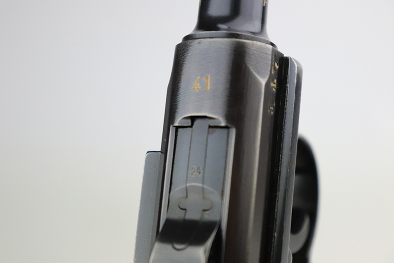 9/7/22 – This is a nice example of an original Black Widow Mauser Luger from 1941. All matching numbered parts with correct and original Black Widow grips and magazine. The pistol has about 92% of the original blue remaining with high edge wear in all the common areas. Bore is shiny with strong rifling but has some freckling toward the muzzle end. The grips are in great shape with only minor handling wear. Magazine is marked ‘fxo’ over ‘E/37’ and has just a couple of small dings in either side of the base.