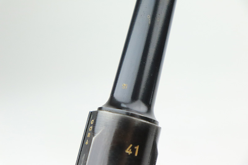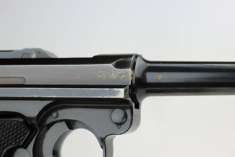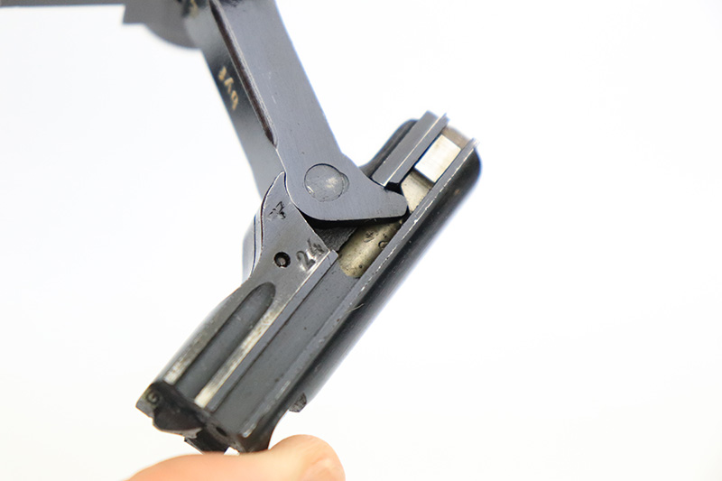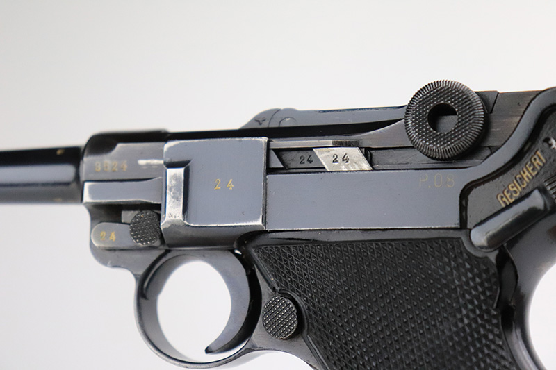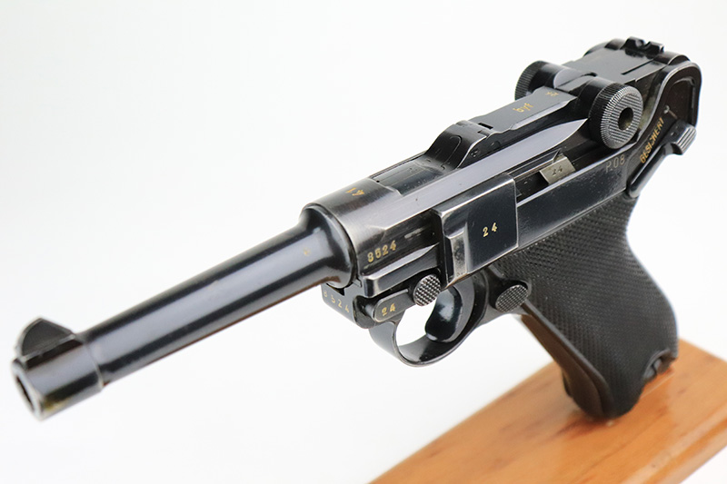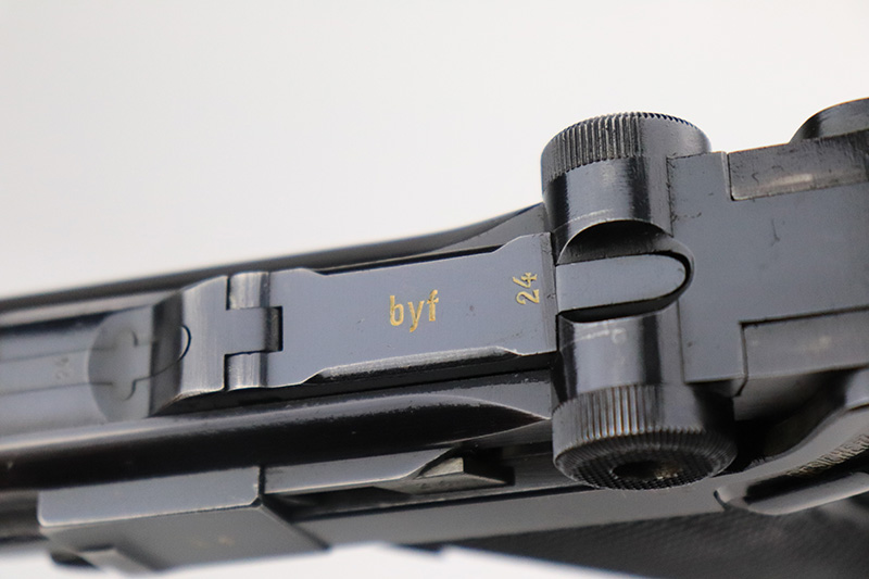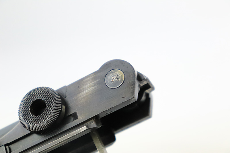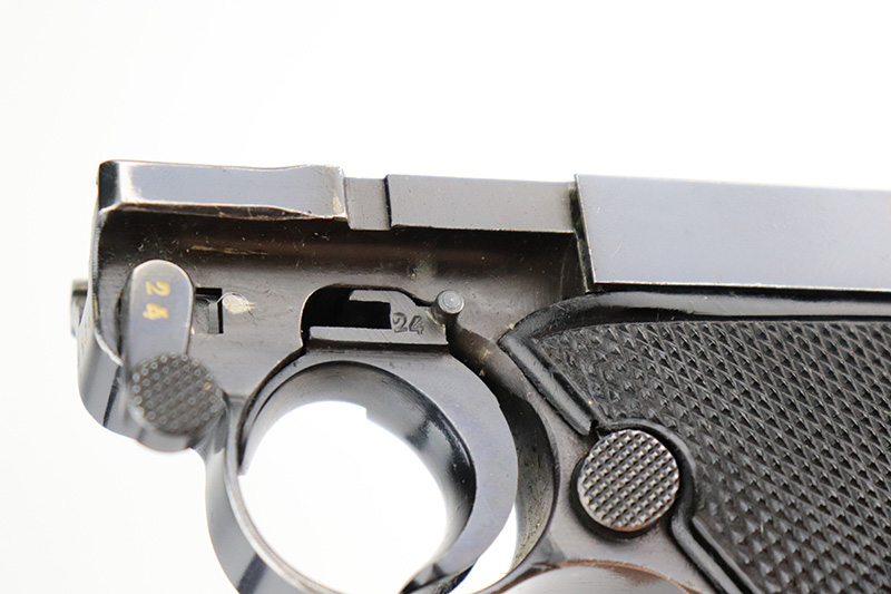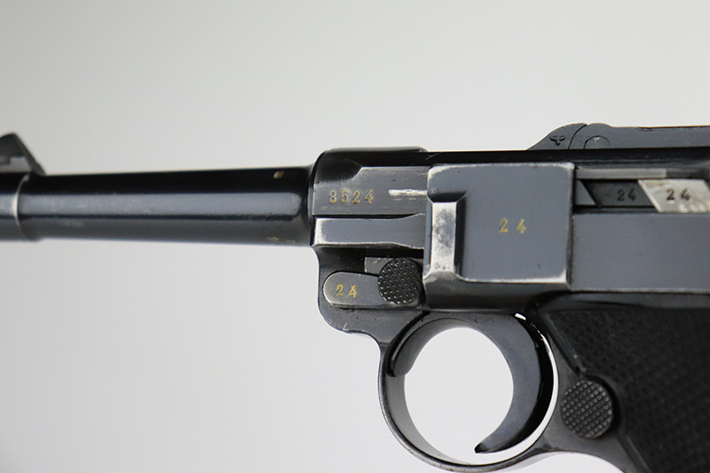 9/7/22 – This is a nice example of an original Black Widow Mauser Luger from 1941. All matching numbered parts with correct and original Black Widow grips and magazine. The pistol has about 92% of the original blue remaining with high edge wear in all the common areas. Bore is shiny with strong rifling but has some freckling toward the muzzle end. The grips are in great shape with only minor handling wear. Magazine is marked ‘fxo’ over ‘E/37’ and has just a couple of small dings in either side of the base.