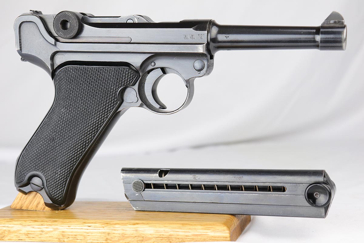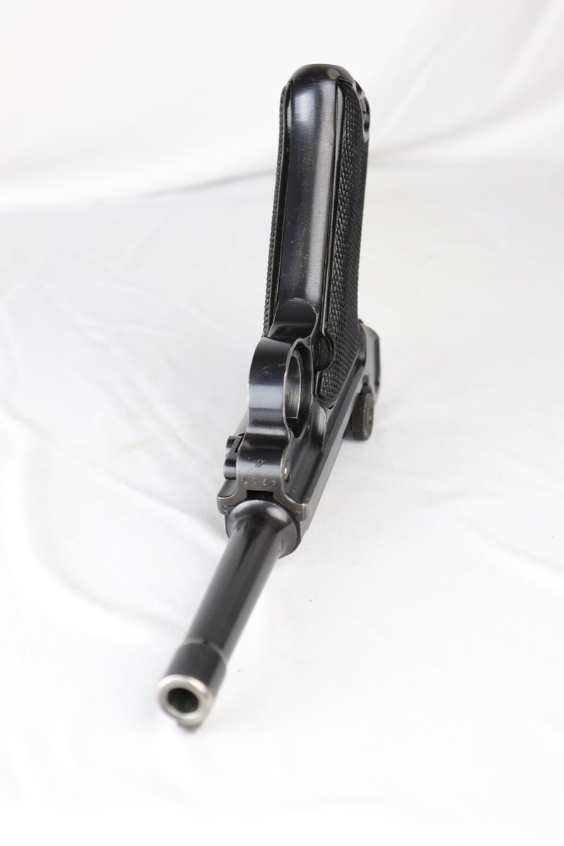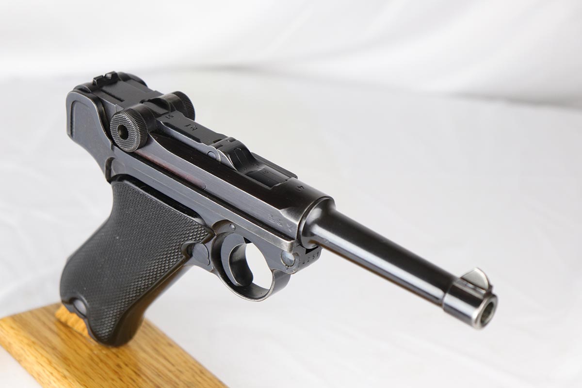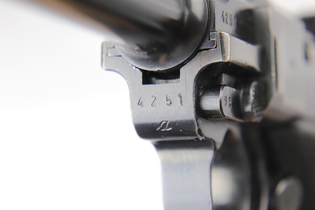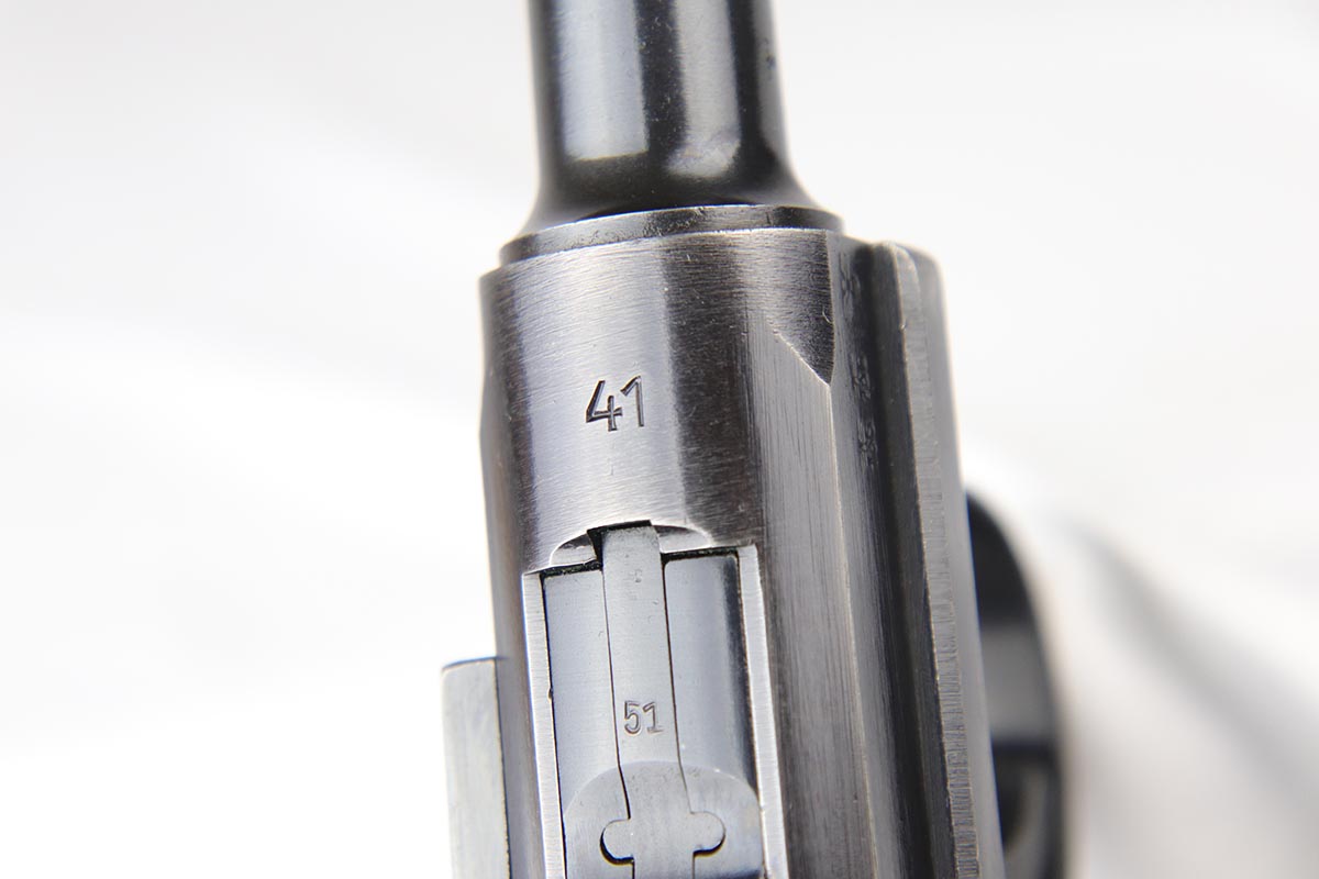 4/23/18 – This is an all matching and original Black Widow Mauser luger from 1941. This is a scarce variation, as it is a 1941 Mauser with E/135 proofs and very few ’41 Mausers are not E/655. The finish rates at 93-94% and is minty aside from the high edges on the left side. The sideplate is thin throughout and there is some finish loss on the left rail and left side of the barrel. Likely all caused by prolonged holster storage. Correct, original Black Widow style grips and magazine. Bore has strong rifling but minor corrosion in the grooves.