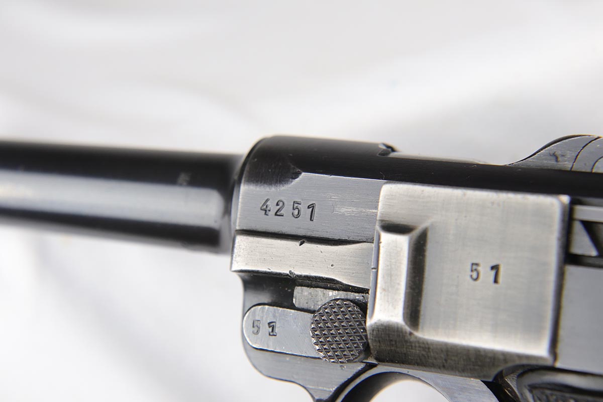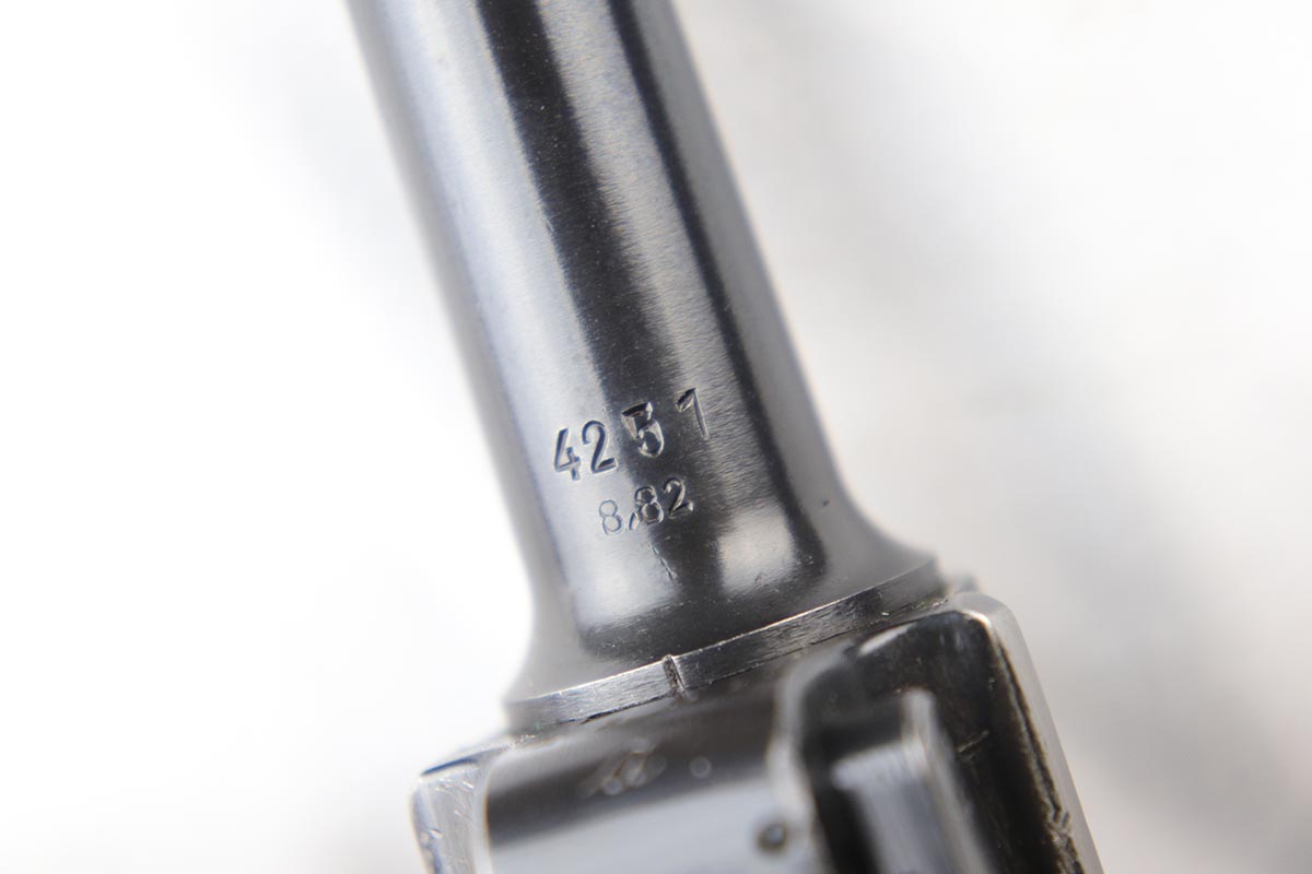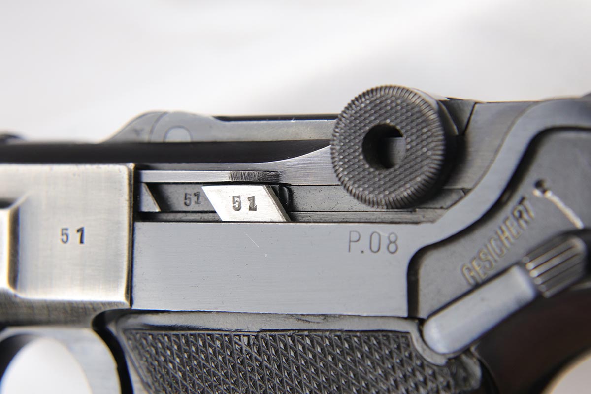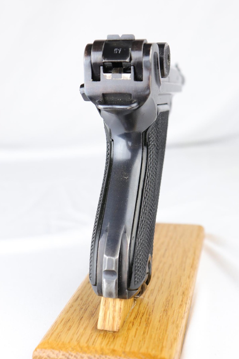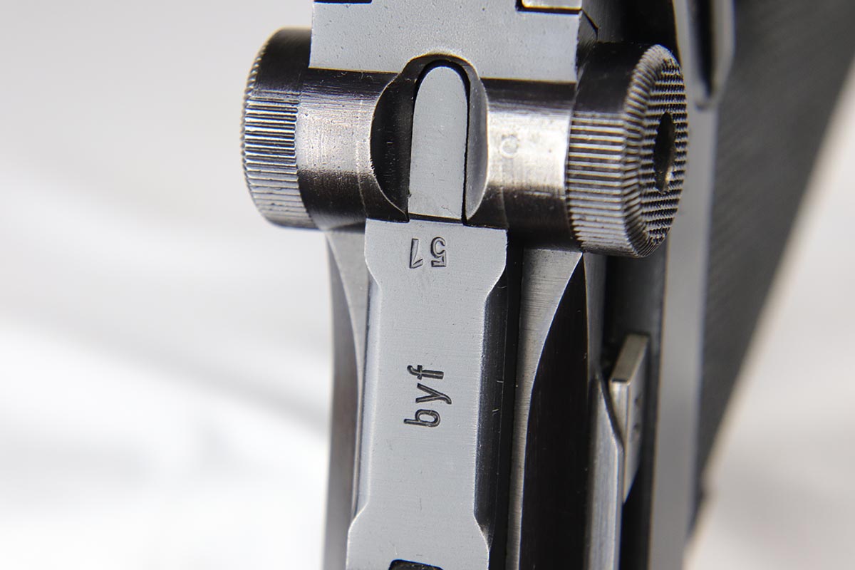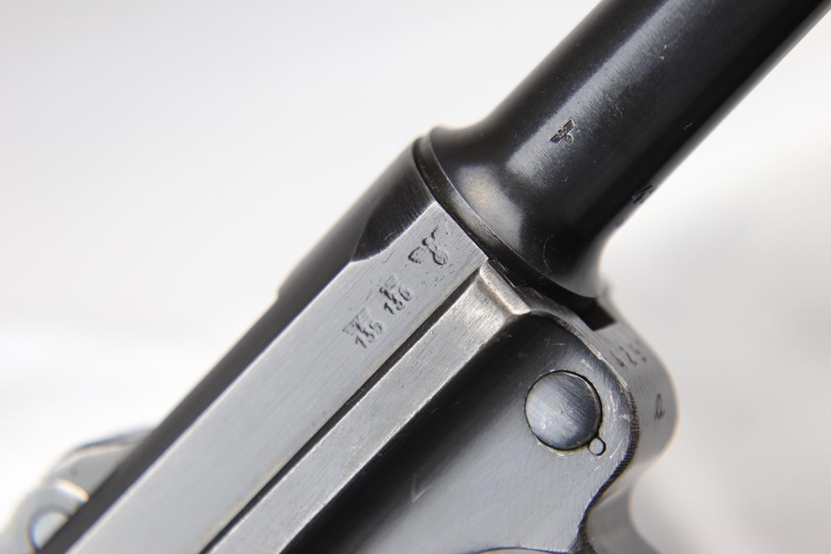 4/23/18 – This is an all matching and original Black Widow Mauser luger from 1941. This is a scarce variation, as it is a 1941 Mauser with E/135 proofs and very few ’41 Mausers are not E/655. The finish rates at 93-94% and is minty aside from the high edges on the left side. The sideplate is thin throughout and there is some finish loss on the left rail and left side of the barrel. Likely all caused by prolonged holster storage. Correct, original Black Widow style grips and magazine. Bore has strong rifling but minor corrosion in the grooves.