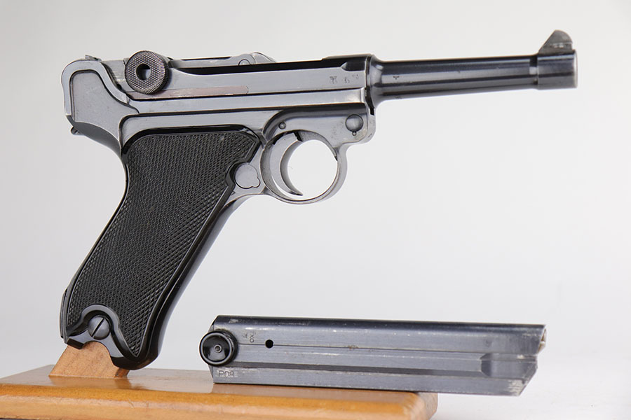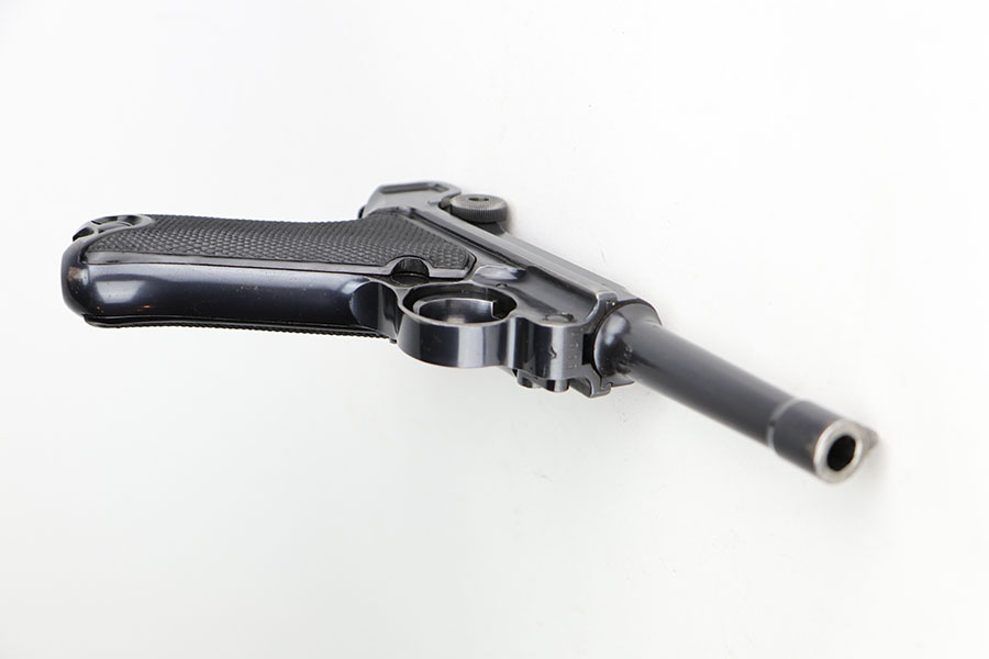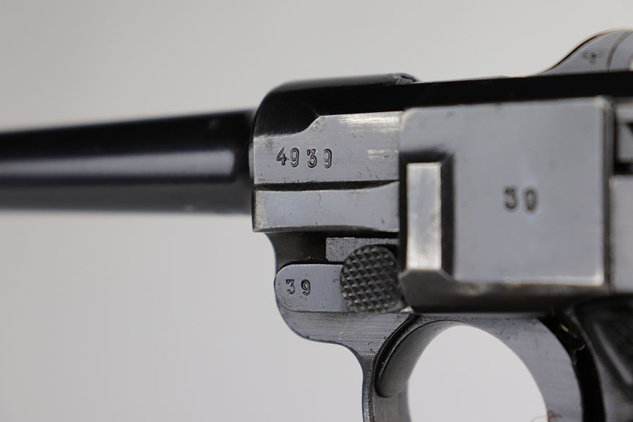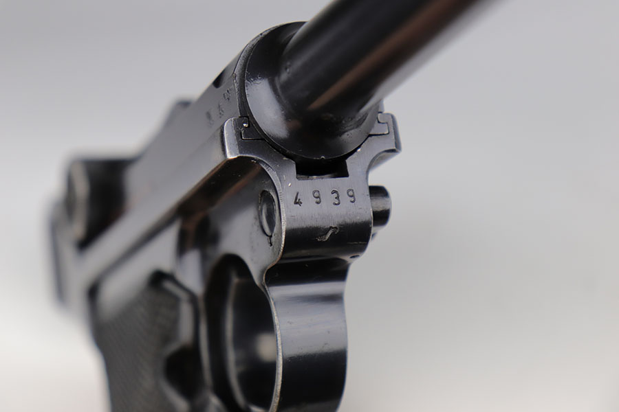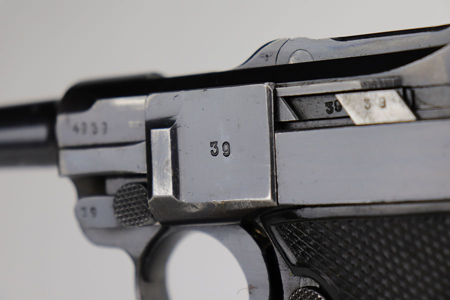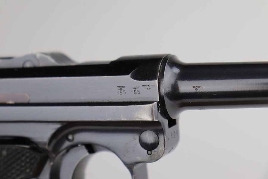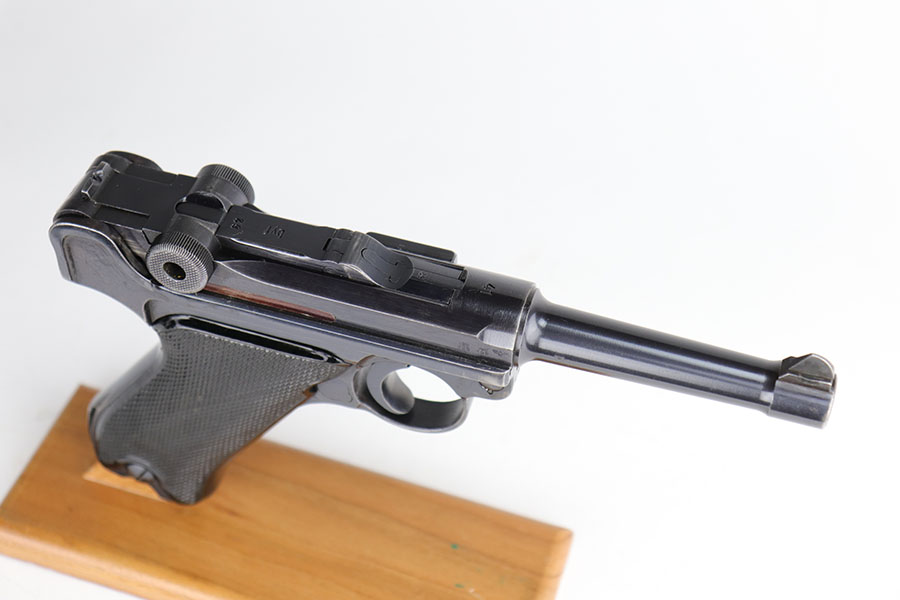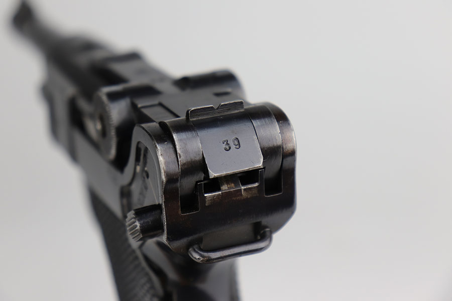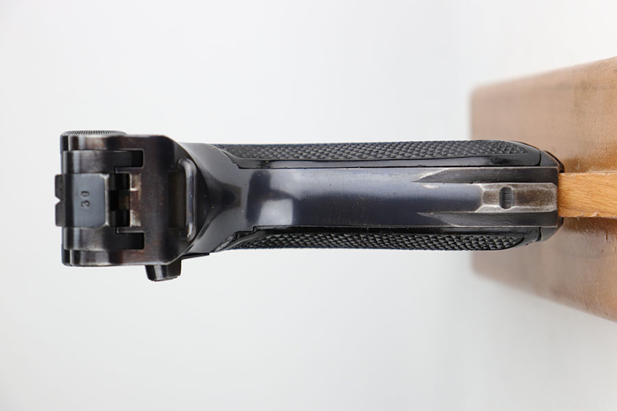 11/18/20 – This is an excellent Black Widow Mauser Luger from 1941. All matching and original with 94-95% blue remaining. Minor finish loss on sideplate, either side of muzzle, receiver ears and bottom of front strap. Original and correct Black Widow style grips and magazine. All in excellent condition. Terrific bore, just a tiny hint of frost.