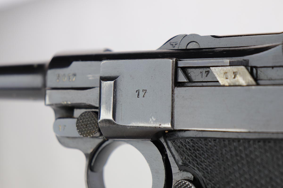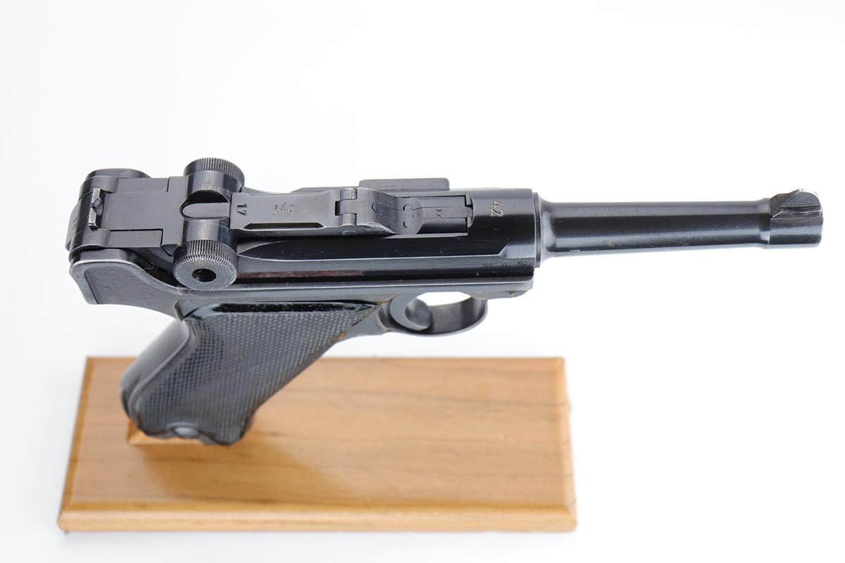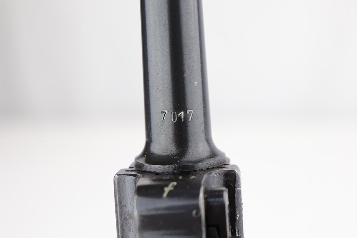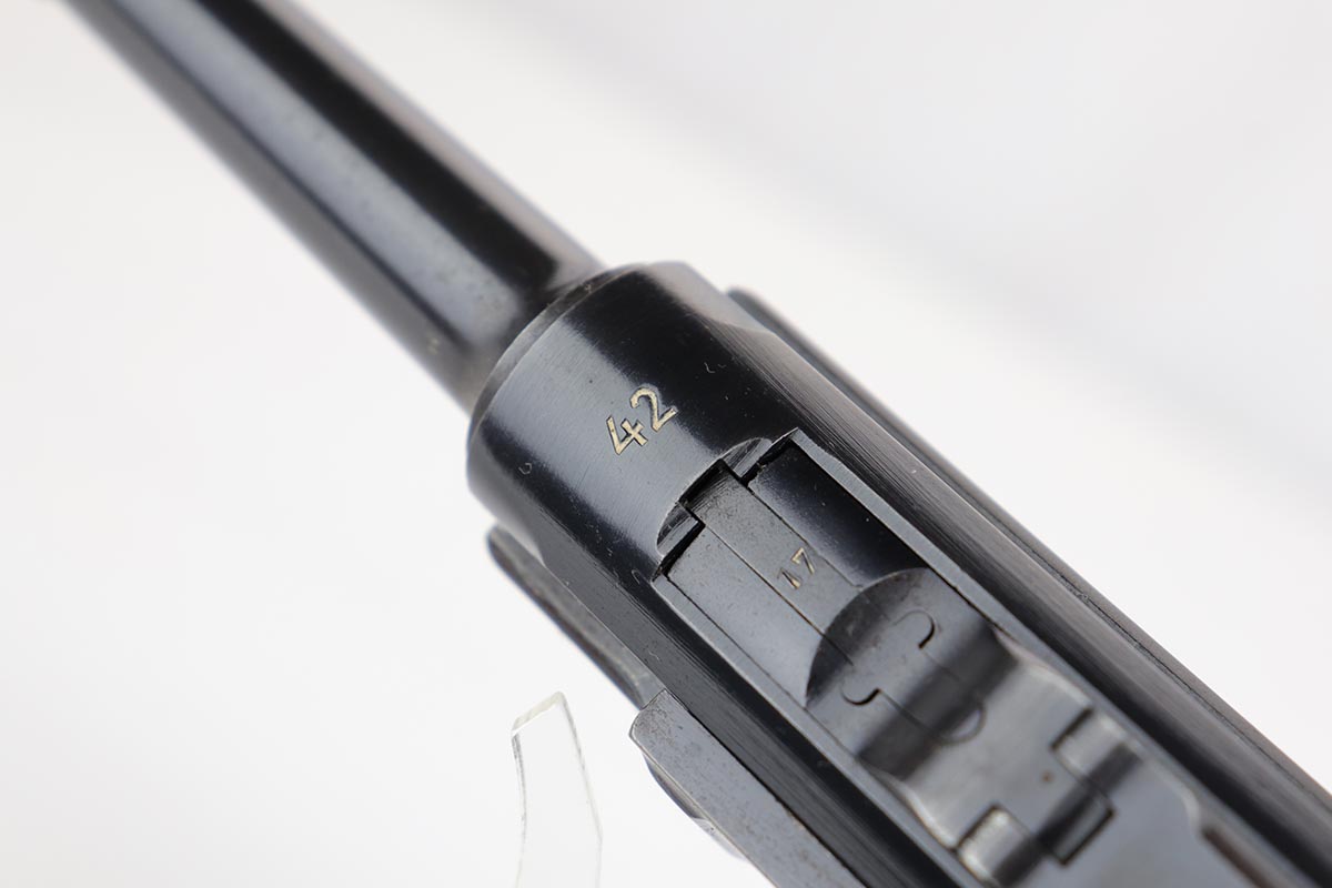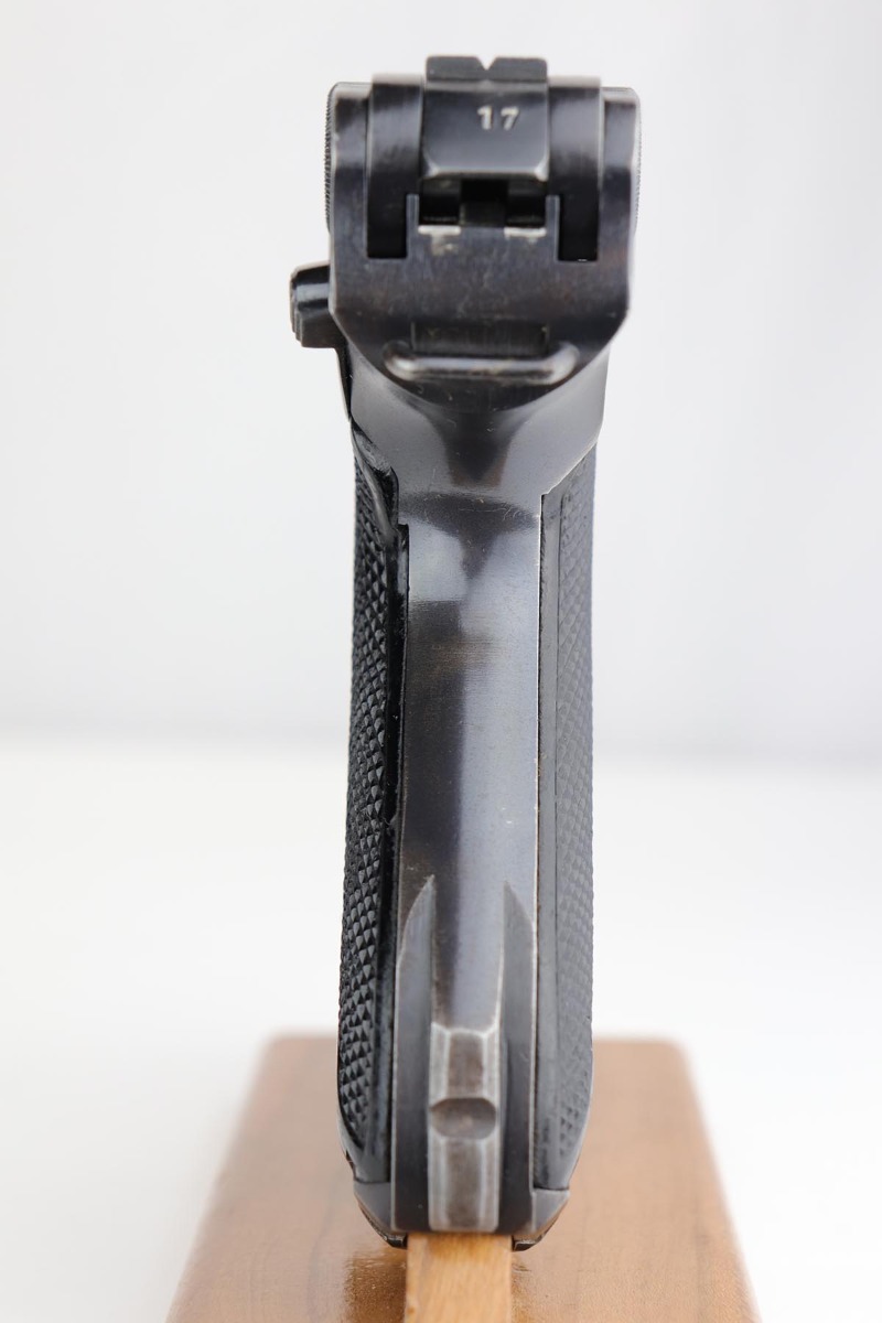 1/8/20 – This is an all matching and original Nazi Mauser Luger from 1942. Often referred to as the Black Widow due to the grips and magazine bottom, this one has about 94% of the original blue remaining. Minor finish loss on sideplate, muzzle, bottom of front strap and stock lug. Nice, original grips with minor signs of age and handling. Excellent magazine with no cracks or chips. Strong, shiny bore with only minor hints of frost.