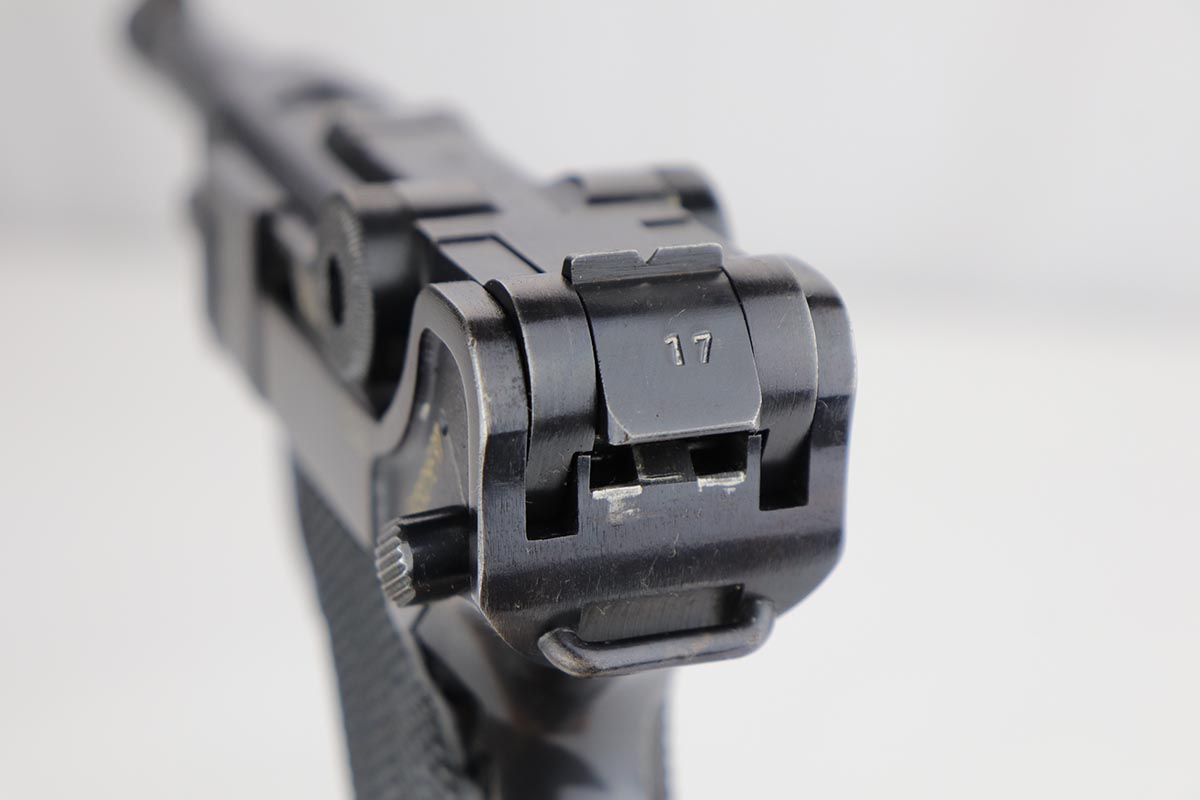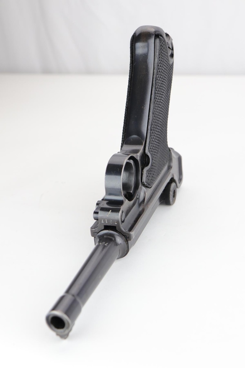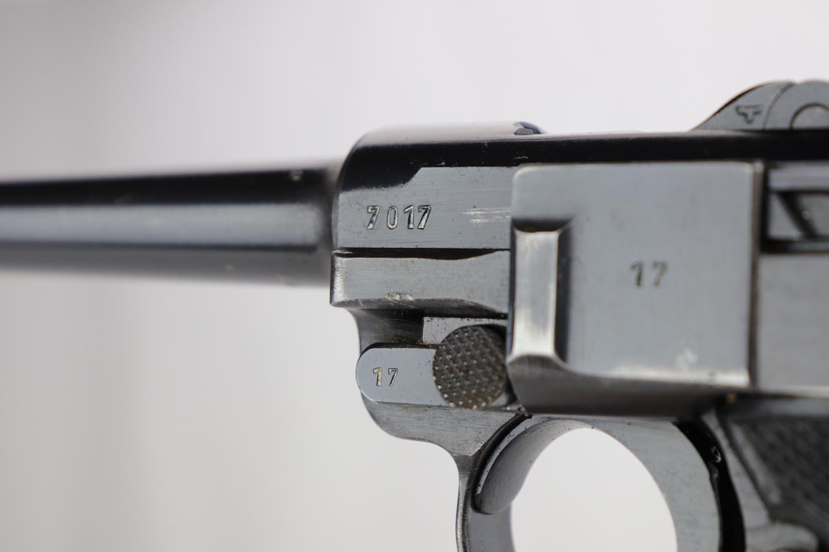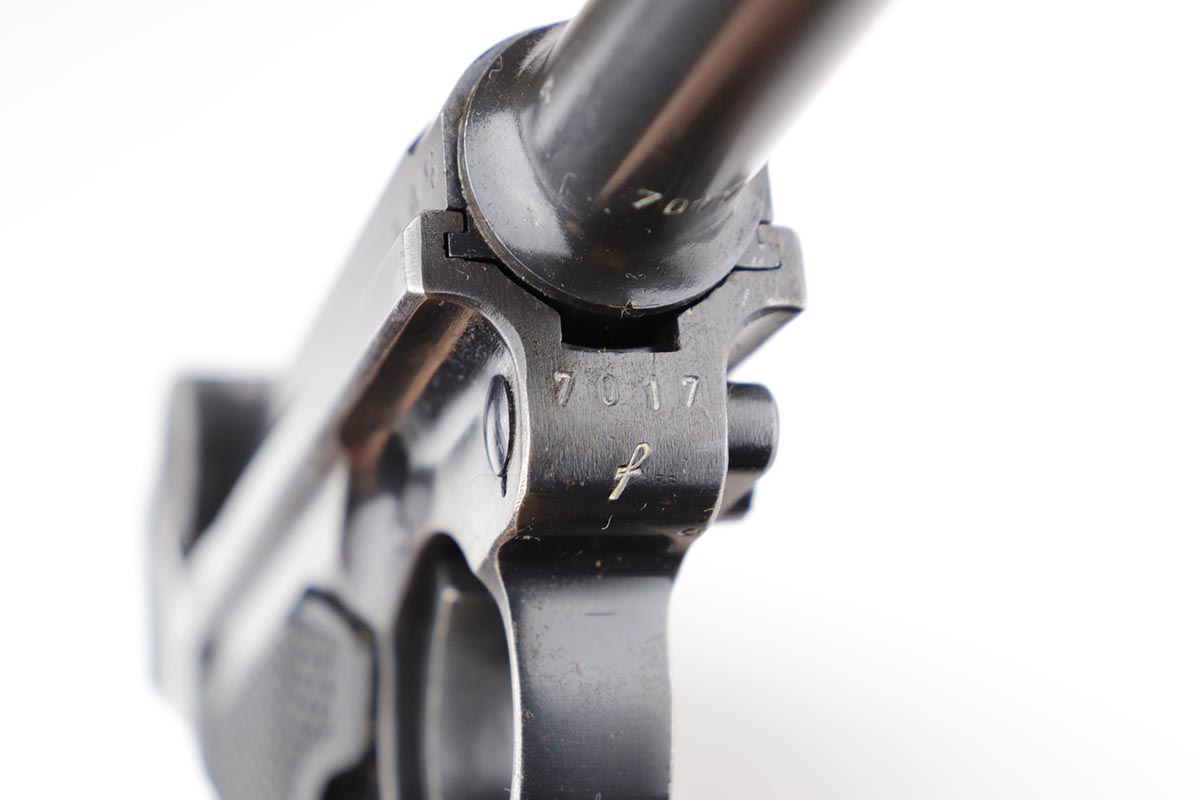 1/8/20 – This is an all matching and original Nazi Mauser Luger from 1942. Often referred to as the Black Widow due to the grips and magazine bottom, this one has about 94% of the original blue remaining. Minor finish loss on sideplate, muzzle, bottom of front strap and stock lug. Nice, original grips with minor signs of age and handling. Excellent magazine with no cracks or chips. Strong, shiny bore with only minor hints of frost.