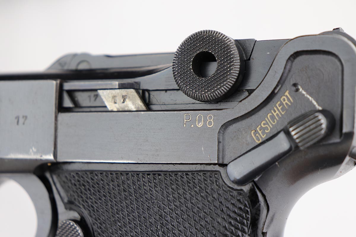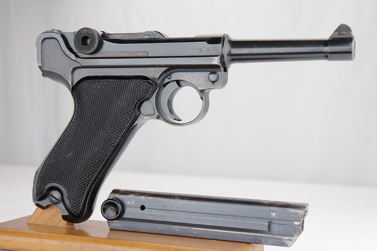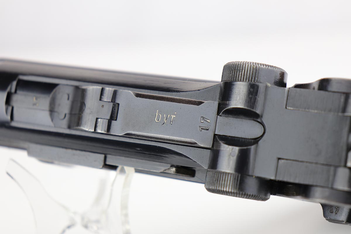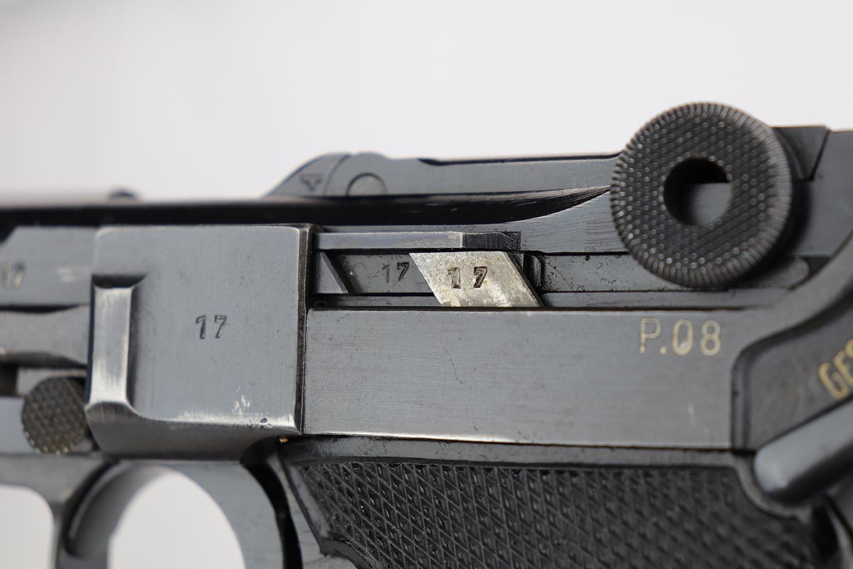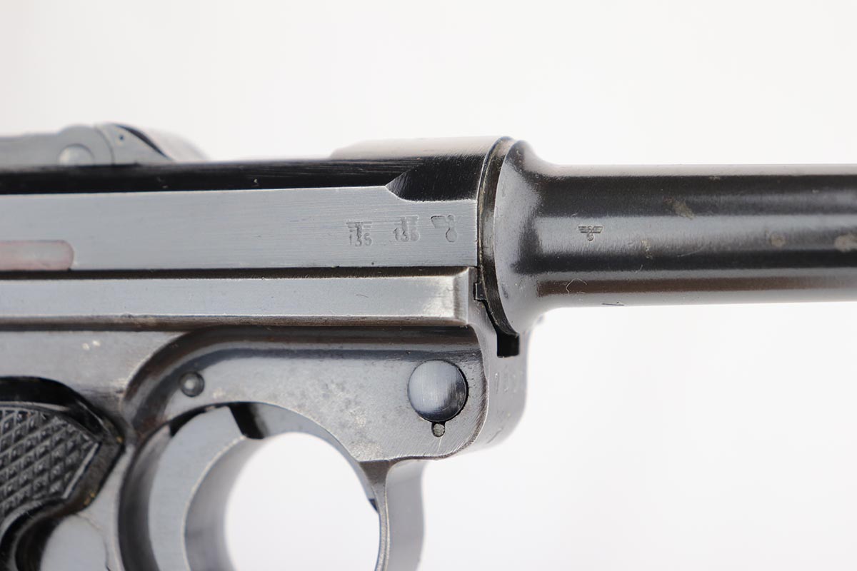 1/8/20 – This is an all matching and original Nazi Mauser Luger from 1942. Often referred to as the Black Widow due to the grips and magazine bottom, this one has about 94% of the original blue remaining. Minor finish loss on sideplate, muzzle, bottom of front strap and stock lug. Nice, original grips with minor signs of age and handling. Excellent magazine with no cracks or chips. Strong, shiny bore with only minor hints of frost.